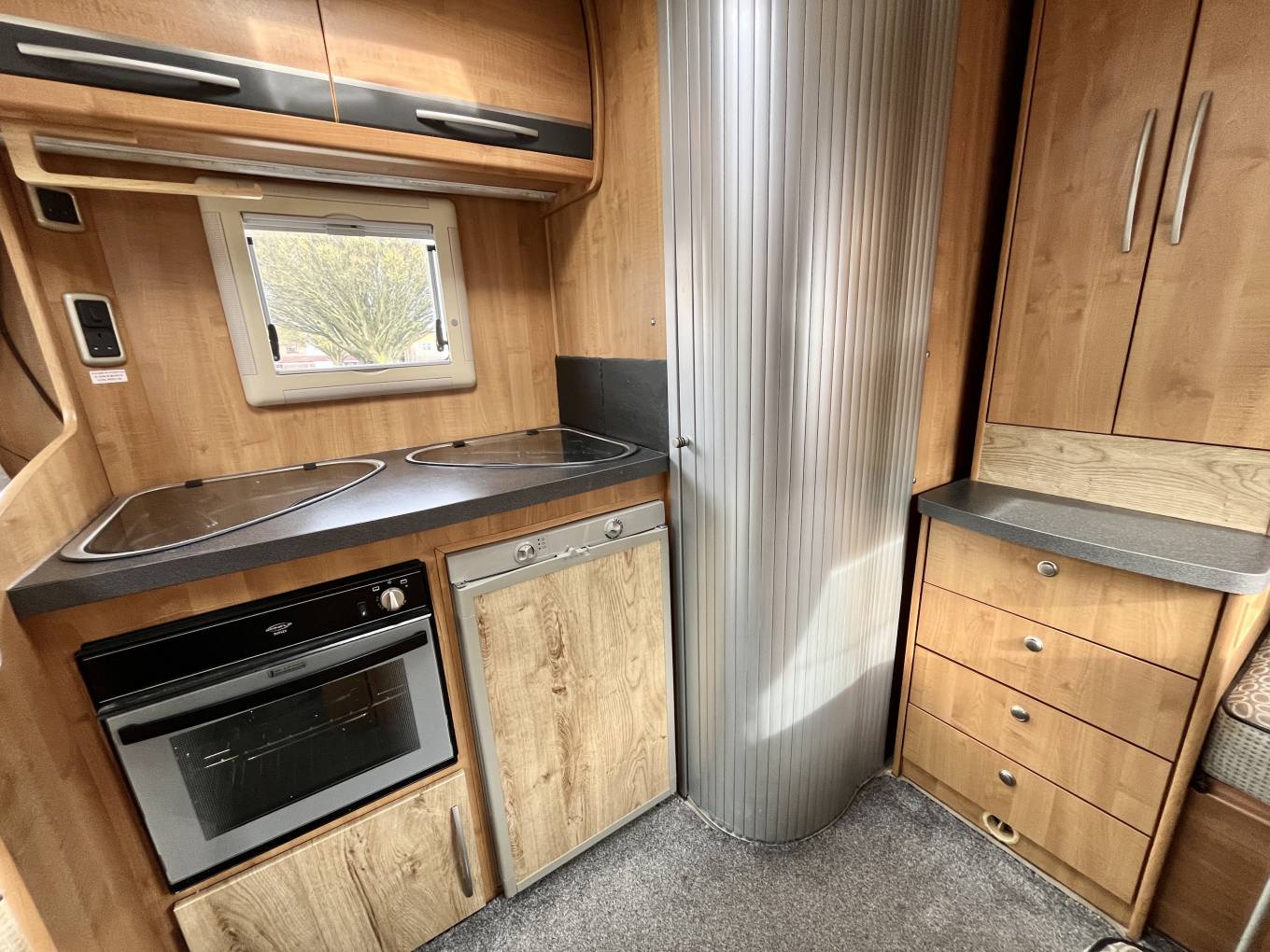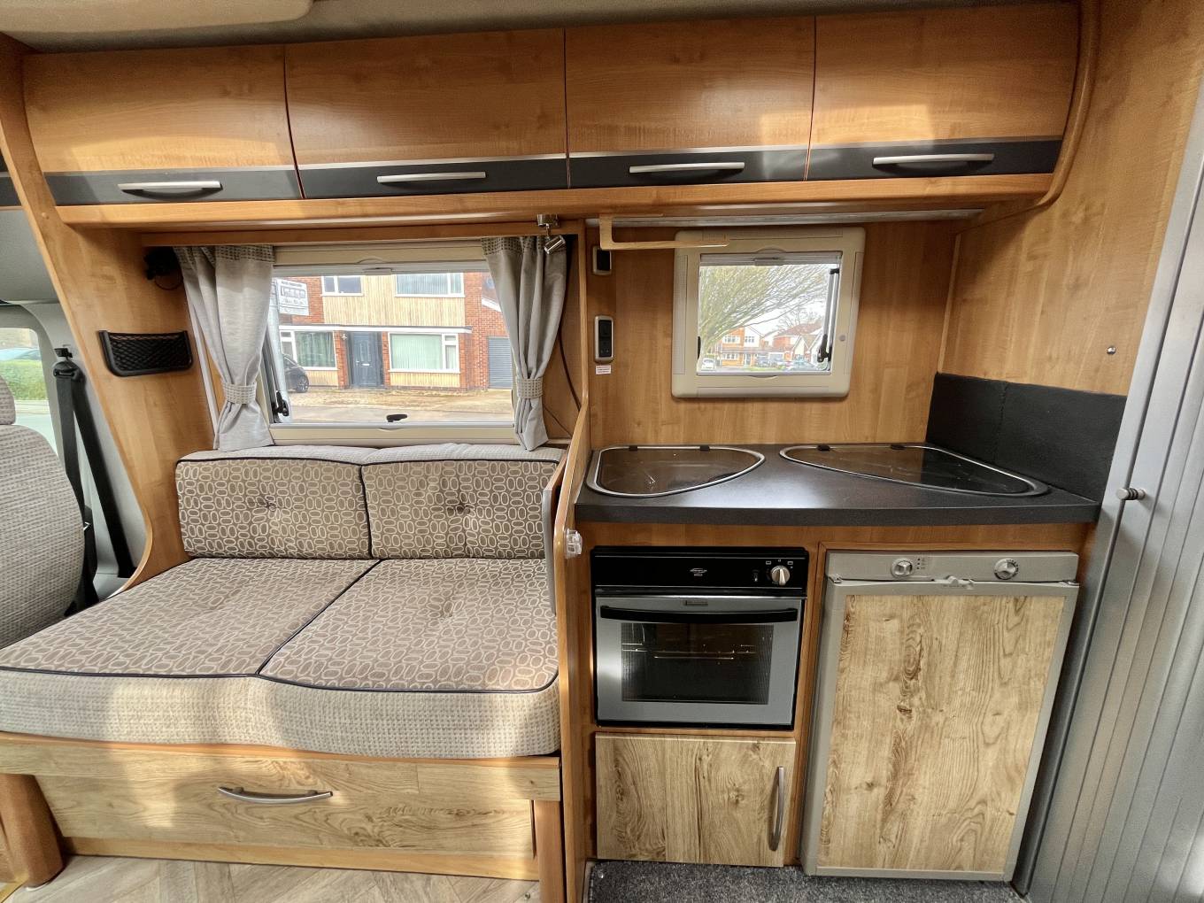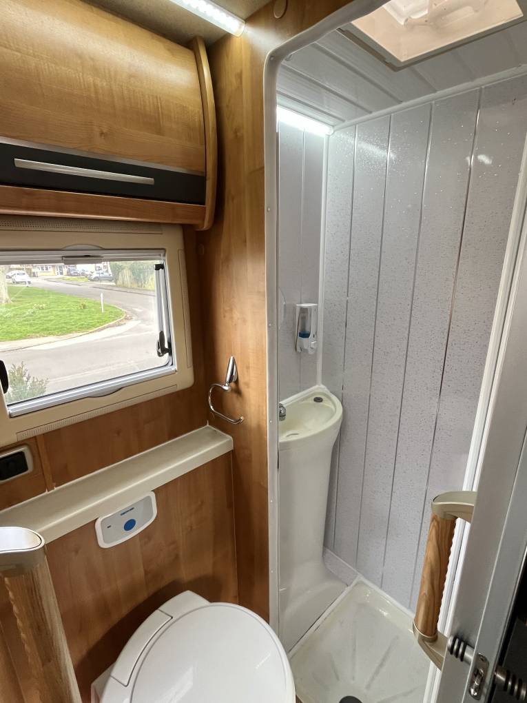 The well equipped kitchen comprises of a 3 burner hob, sink with mixer tap, combination oven and grill, fridge with freezer compartment, additional pop up worktop space and storage above via two overhead lockers.