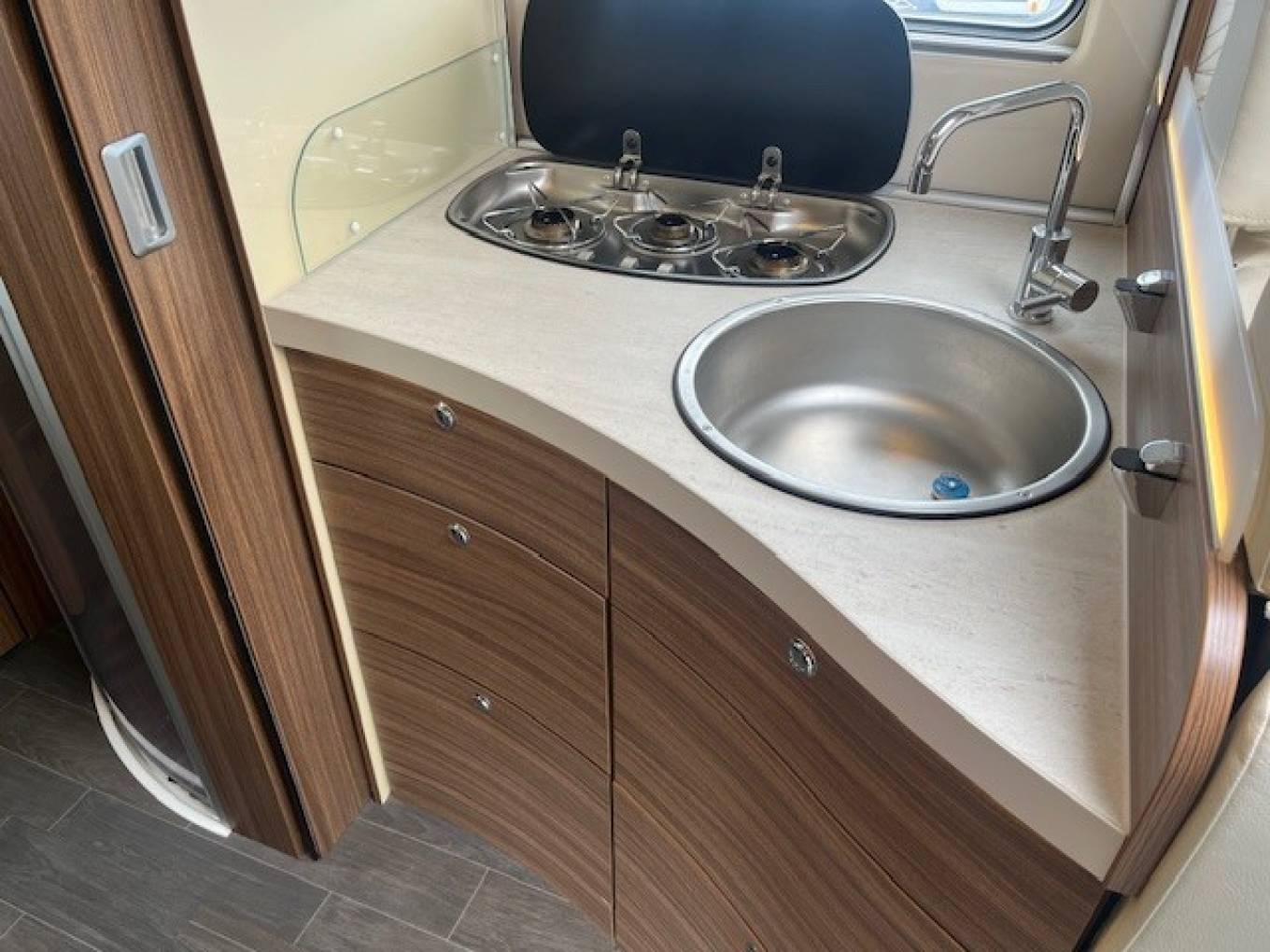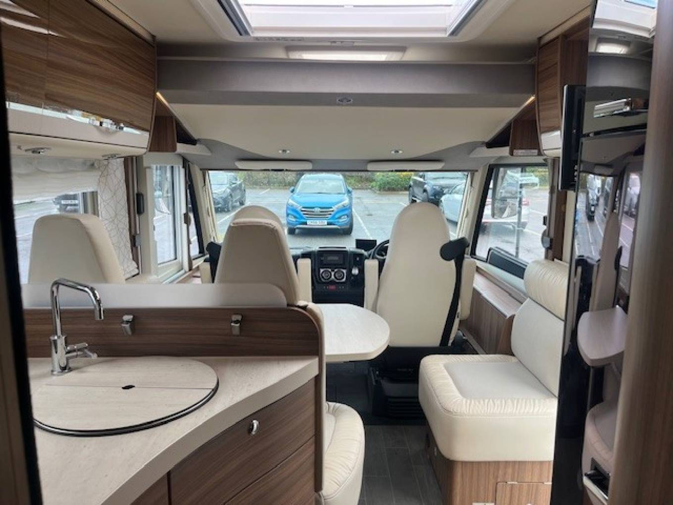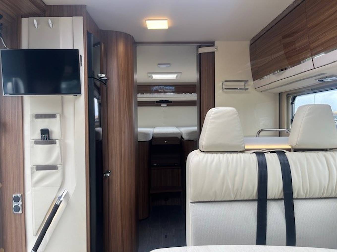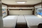 Sleeping is via the End Bedroom complete with Privacy Screen where there are Twin Rear Single Beds, an Infill if required, allows you to convert this to a Very Large King Size Double. The Rear Bed is located above above a Very Generous Garage Area. Above the Cab is a Pull Down Double Bed accessed via a Ladder. This makes it Ideal for couples who want Extra Space or for families needing Additional Sleeping Capacity.