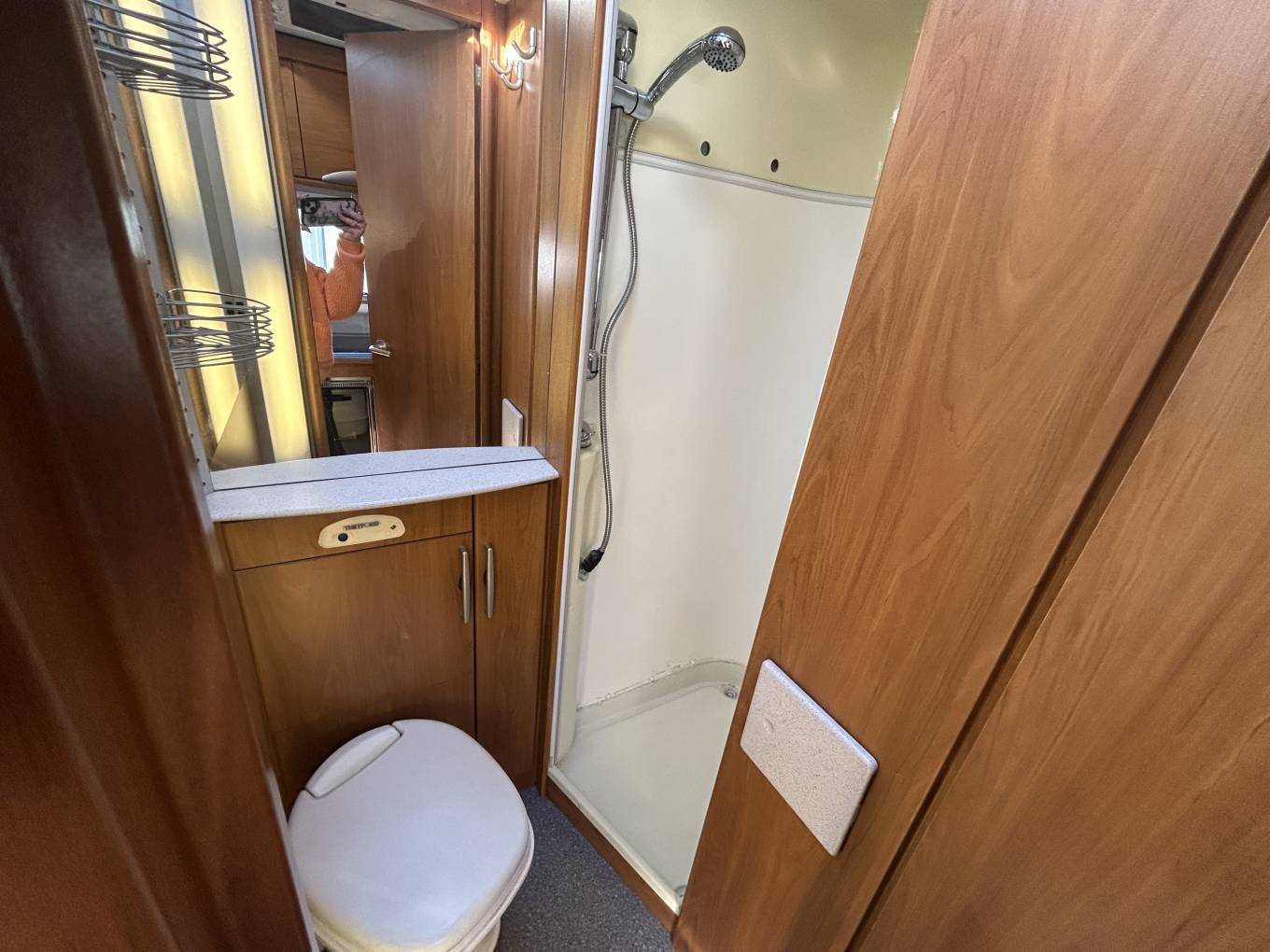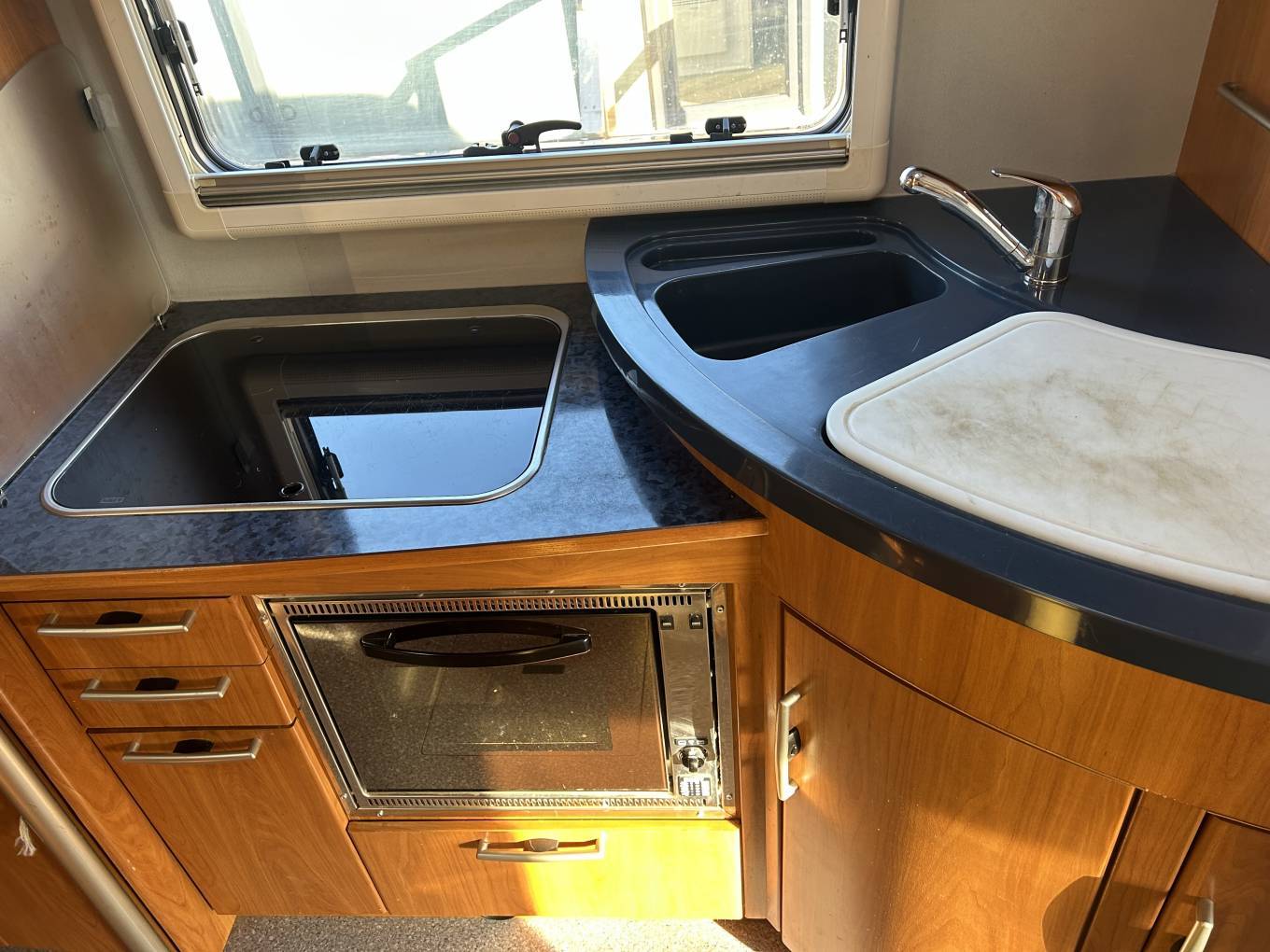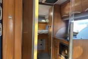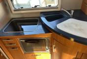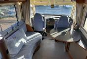 Inside, the spacious layout features a centre dinette and lounge, enhanced by a removable lounge chair(currently stored in the garage) to create even more living space when required. Sleeping accommodation is generous, with a comfortable transverse rear bed and a large overcab double bed, making it ideal for extended touring. The well-equipped kitchen includes a Smev oven and grill alongside a Thetford fridge/freezer, while the washroom offers a Thetford toilet with a separate sink area for added practicality.