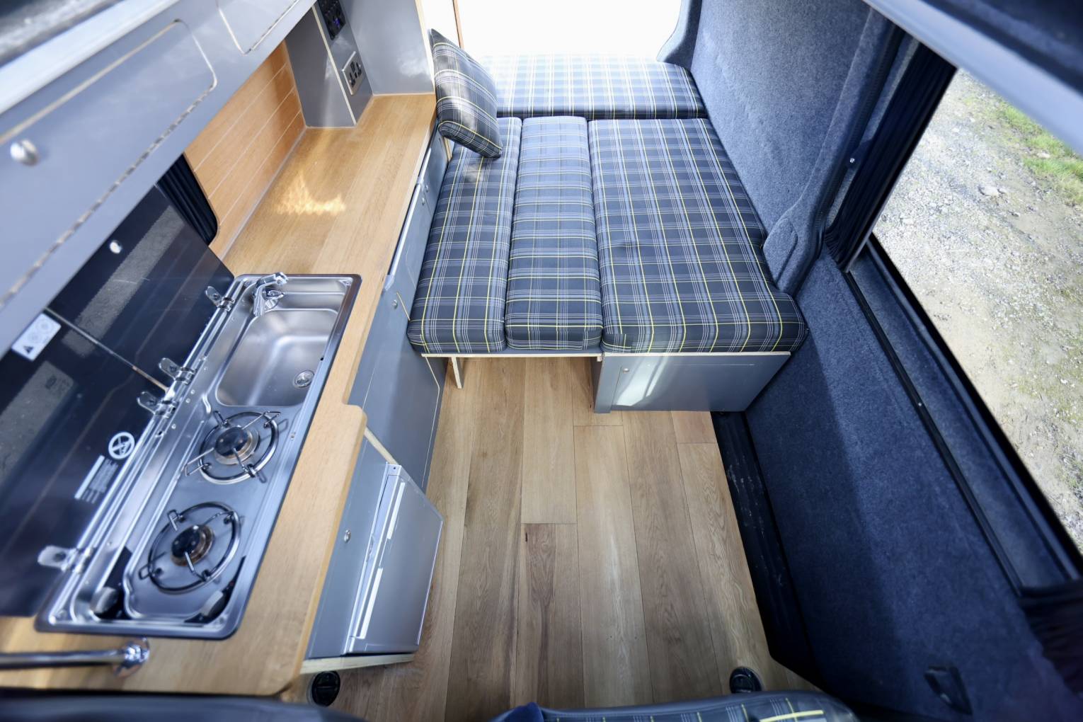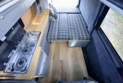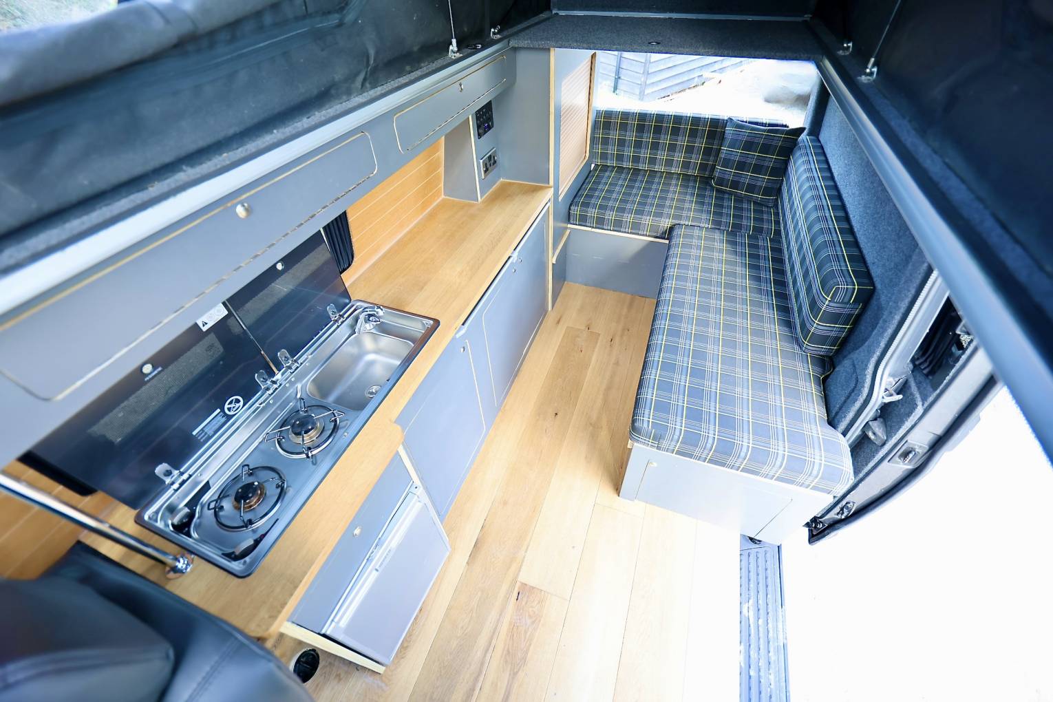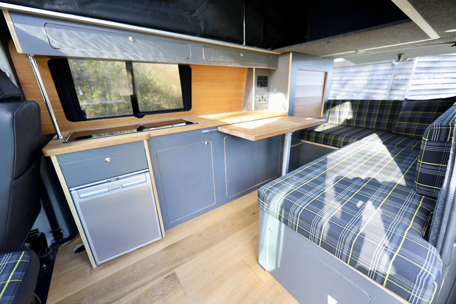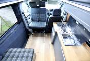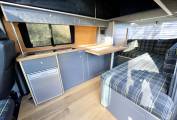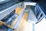 This camper has been custom built inside from birch wood, with fabulous artisan style kitchen area, making it a unique style of life style camping, the lounge area has the same fabric as the front seats, and the bench seat at the front swivels.