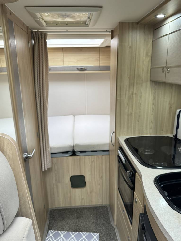 At the rear is a fixed transverse double bed, allowing you to leave the bed made up at all times – perfect for convenience when touring. There is also excellent storage beneath the bed, accessible internally and externally.