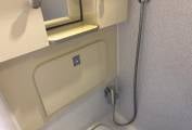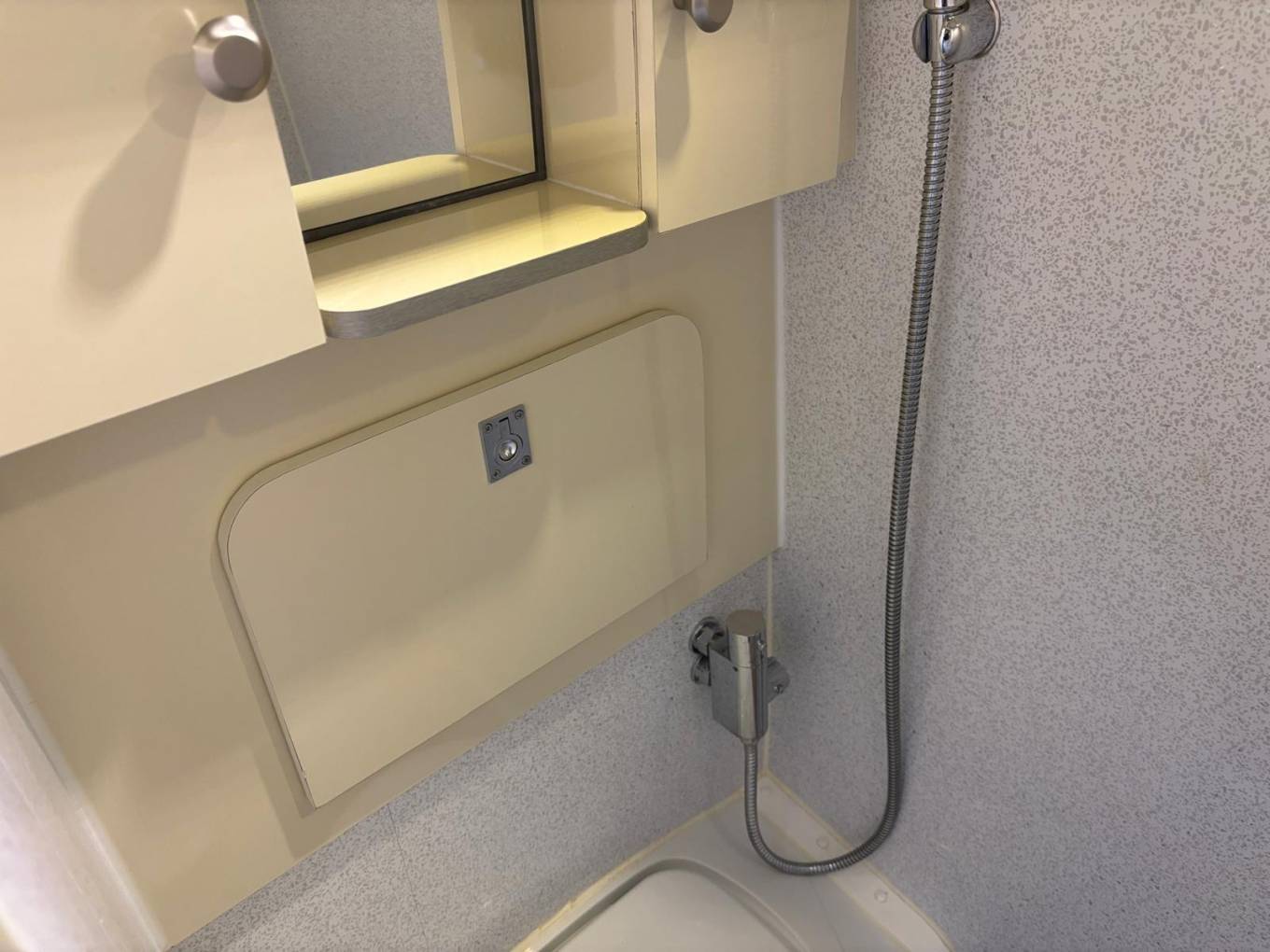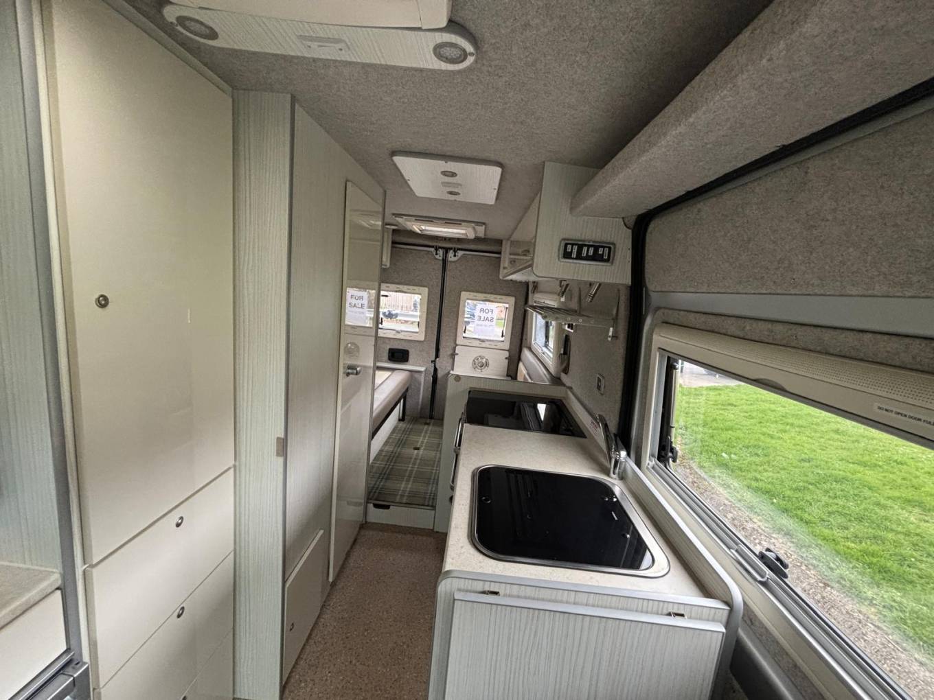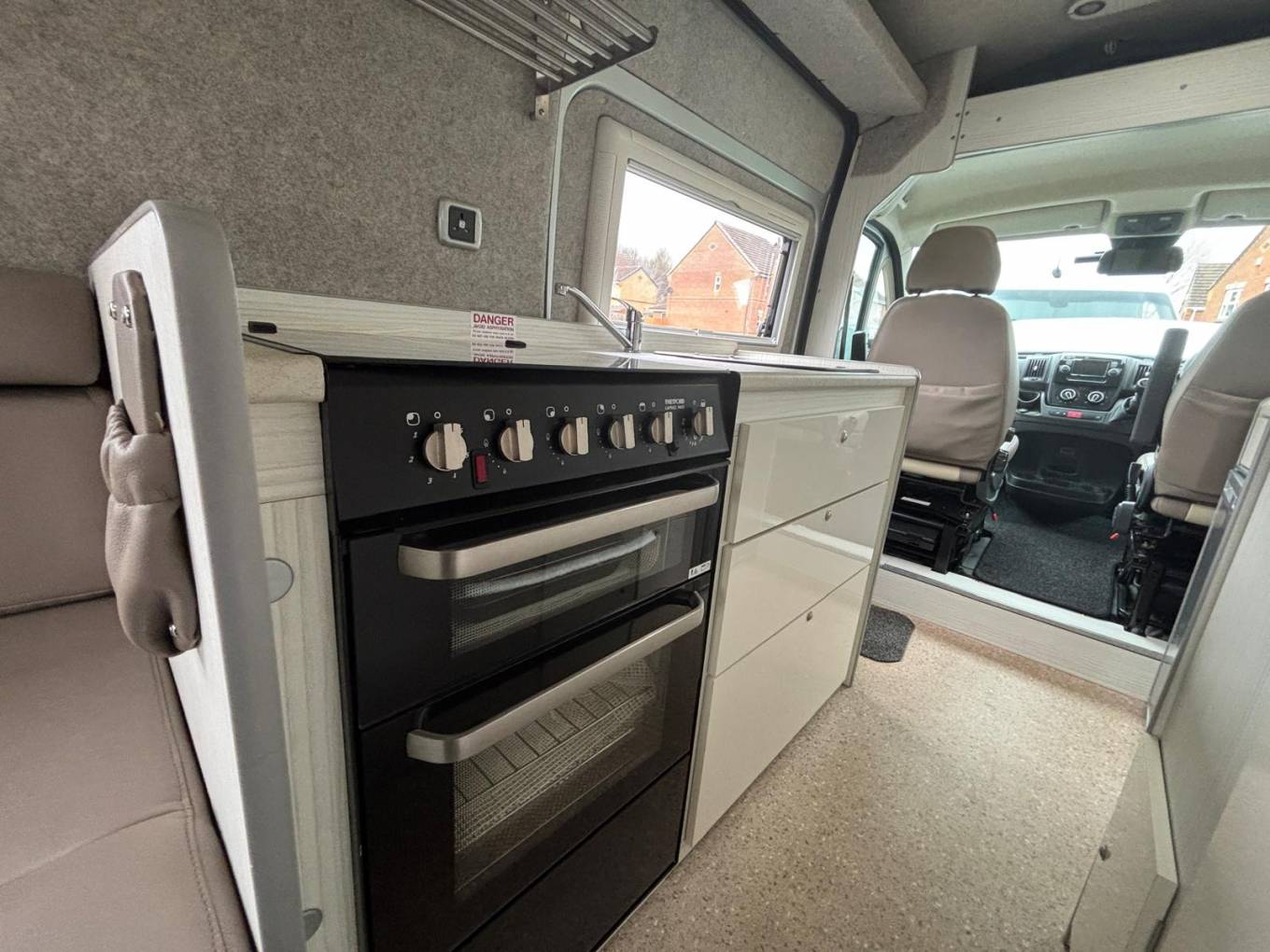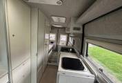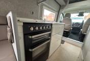 The camper is equipped with a fitted kitchen including storage and preparation space. There is also a built-in bathroom providing washroom facilities.