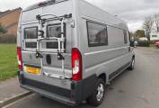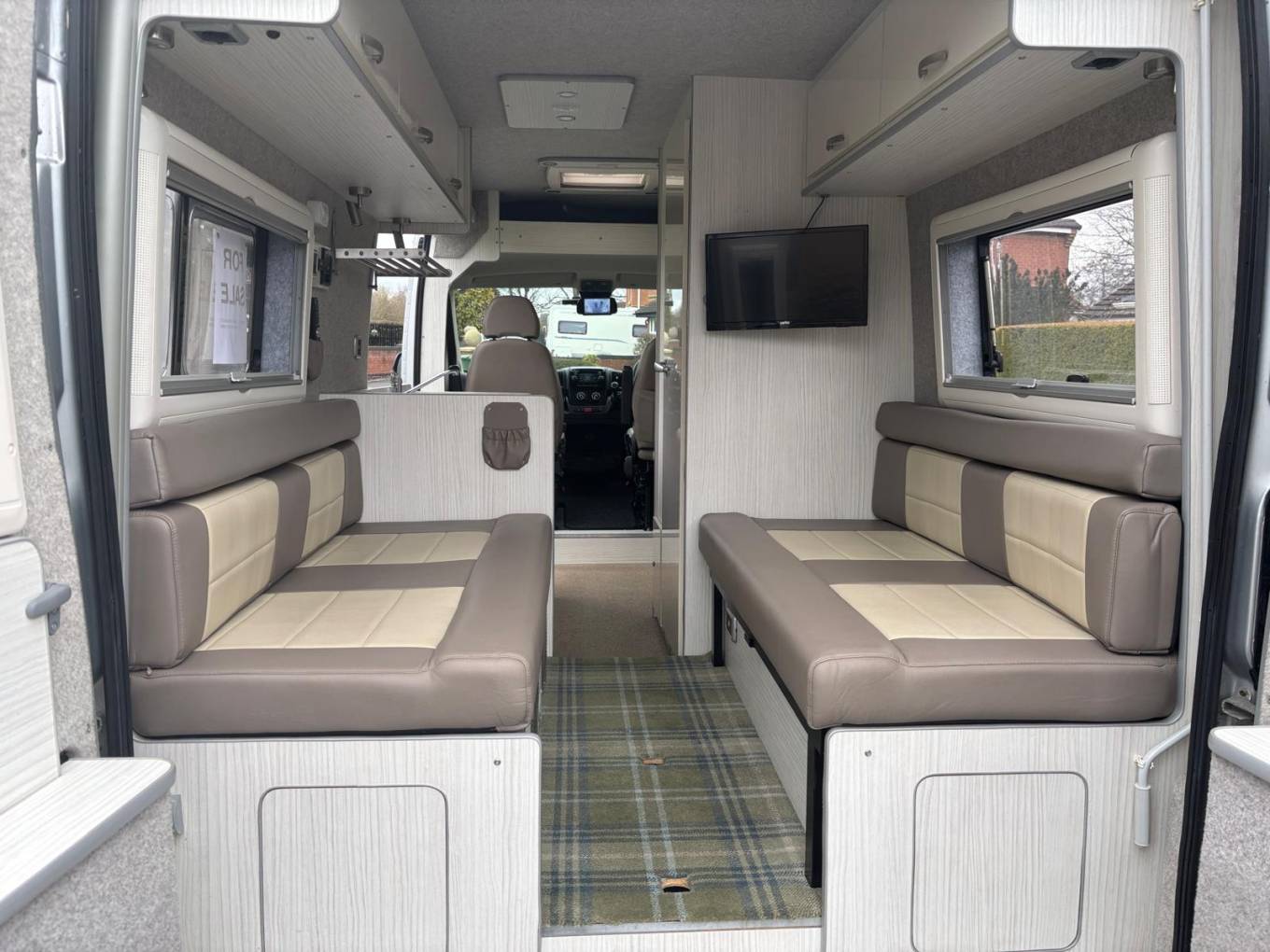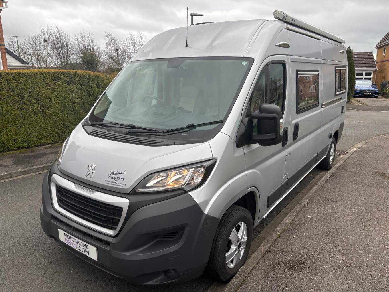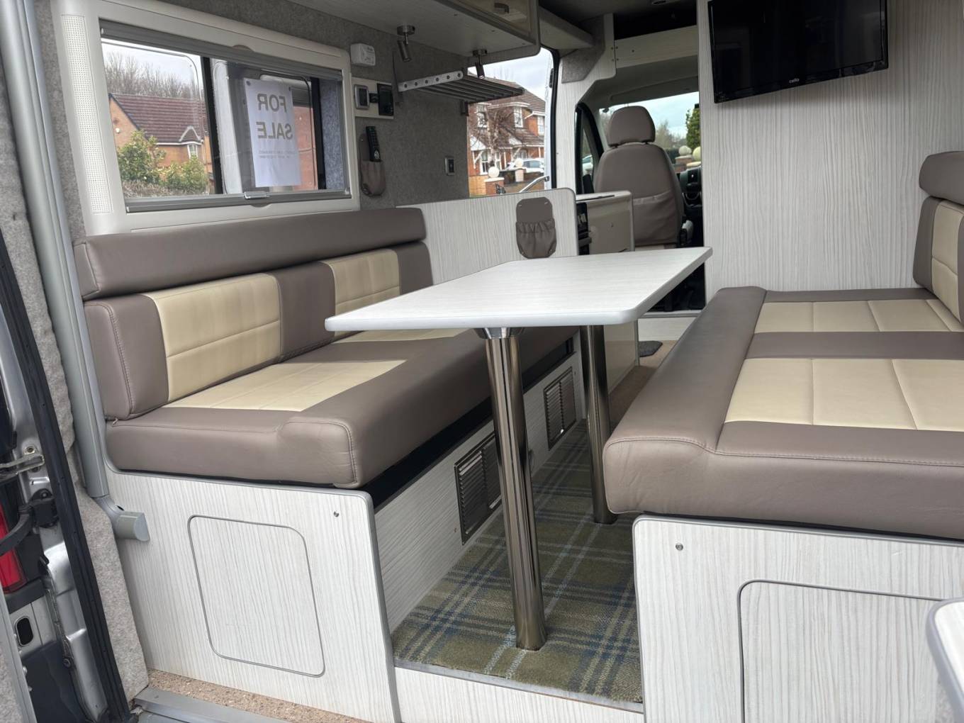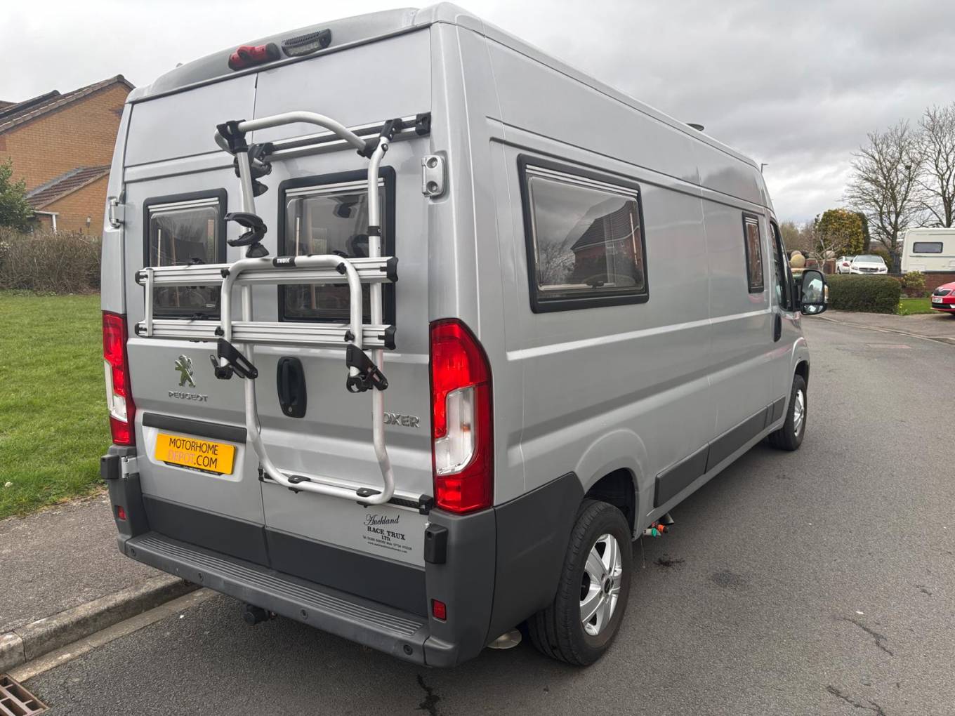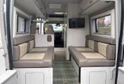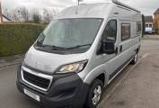 Peugeot Boxer campervan with a professional conversion and full service history. The layout is designed to provide practical living space with a lounge area, kitchen, and bathroom facilities.