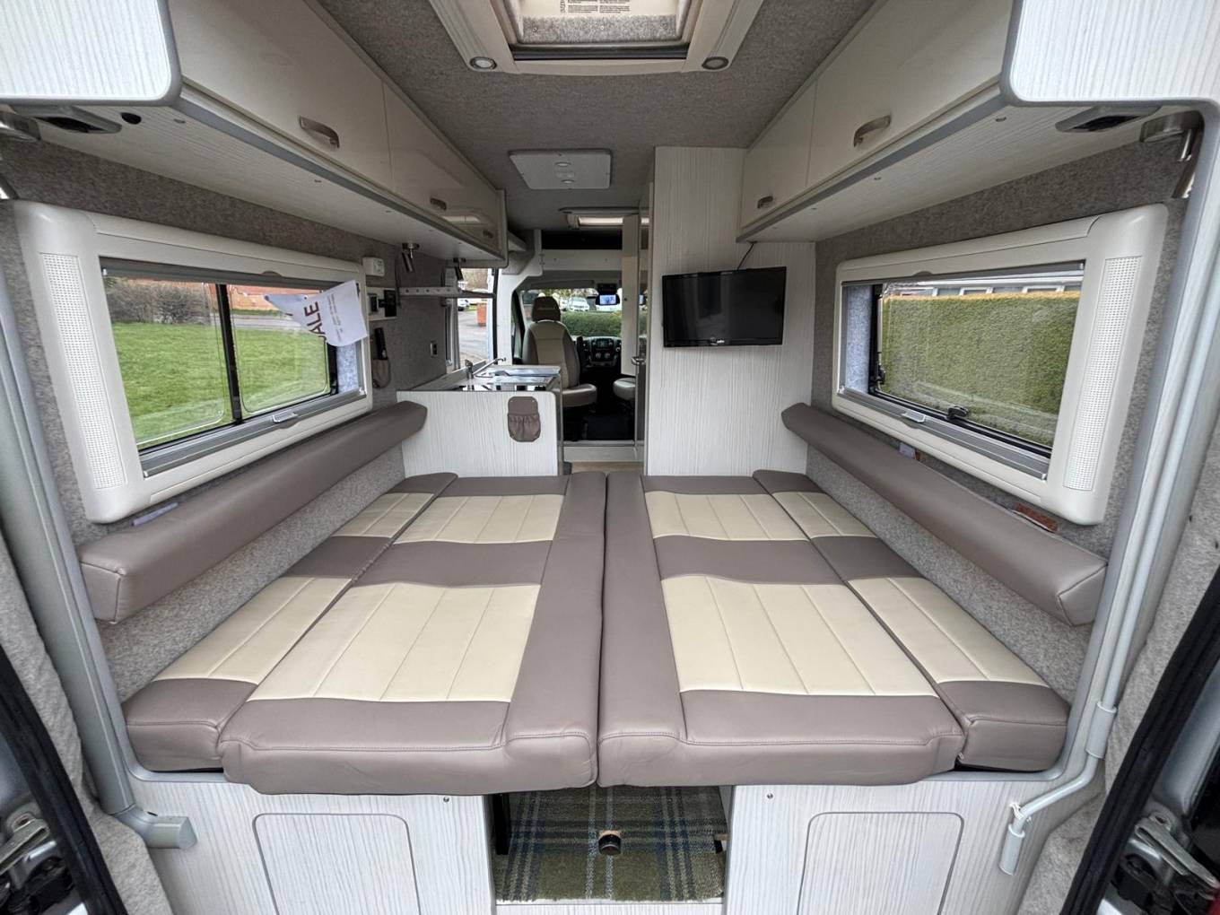 The front seats swivel to create a seating and dining area within the main living space. The interior is finished with full leather upholstery.