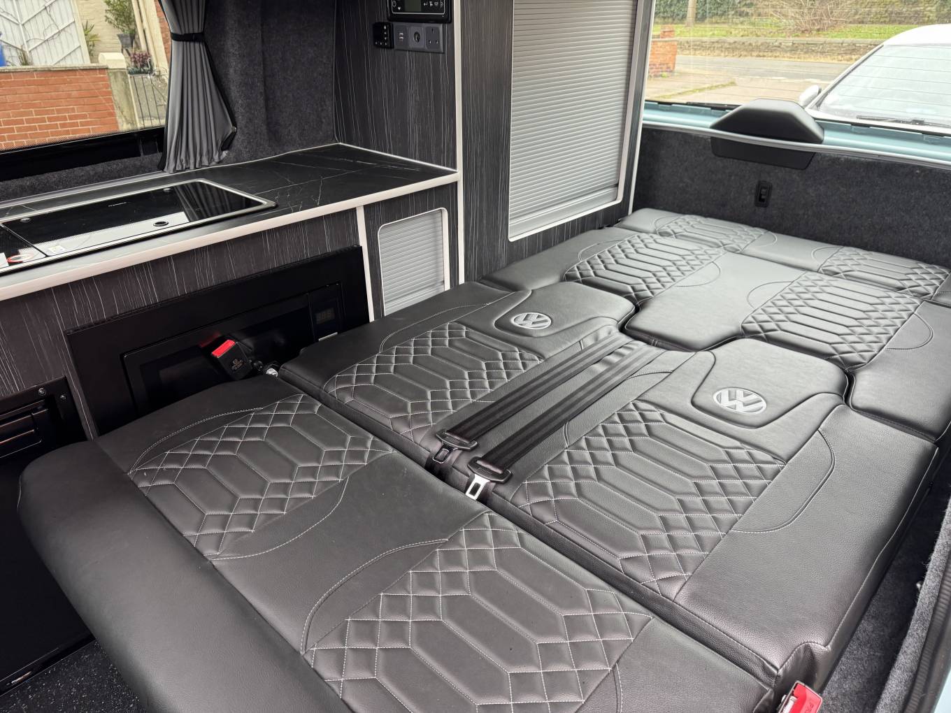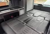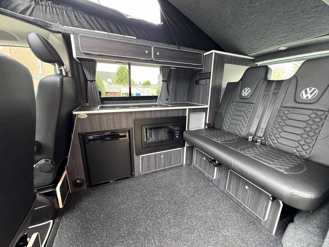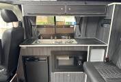 Inside, the camper includes a comfortable rear rock n roll seat trimmed in VW-branded upholstery which converts into a double bed. The pop-top roof also provides an additional sleeping platform, allowing the vehicle to accommodate multiple occupants. The interior layout incorporates a compact kitchen area with a sink, two-burner gas hob, fridge and microwave, along with useful storage and overhead cupboards.