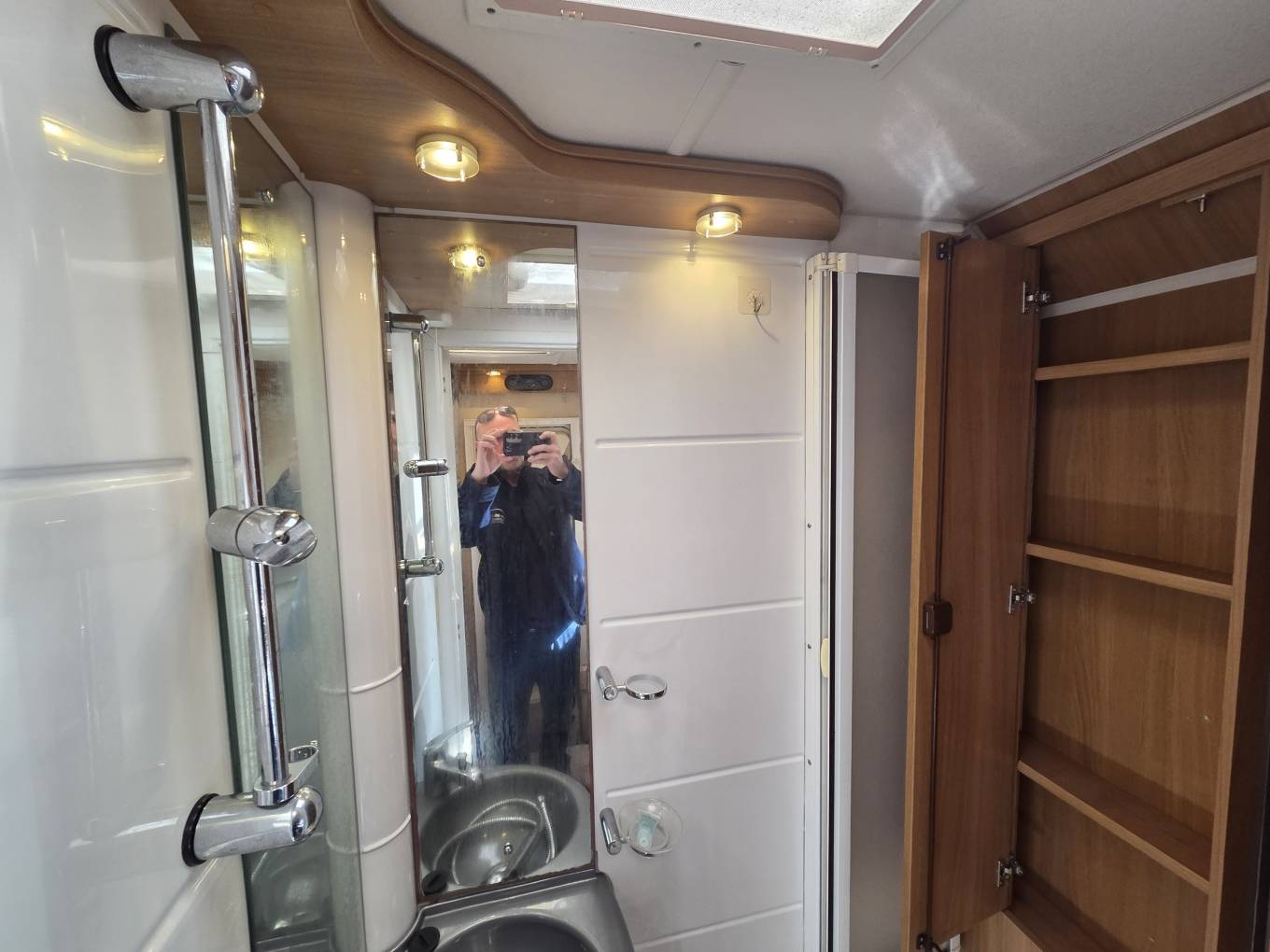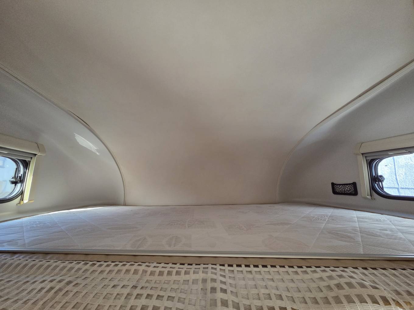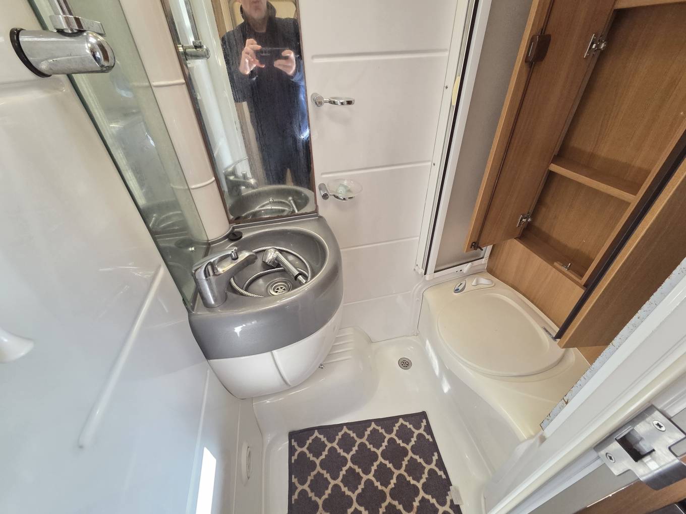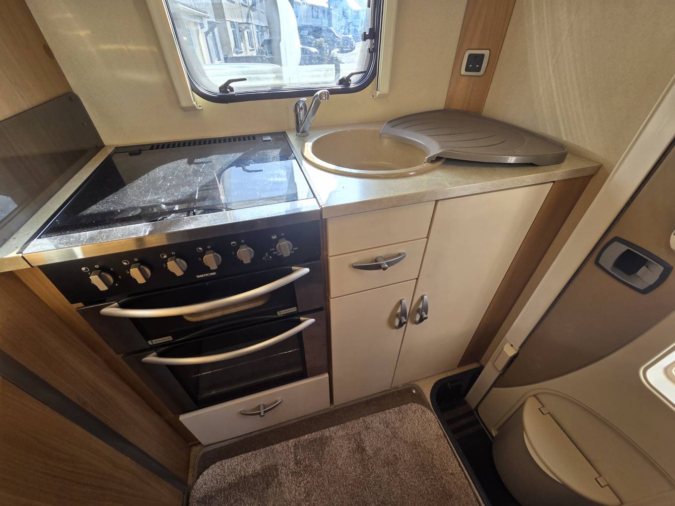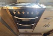 The main entrance door is at the rear which leads you into the end kitchen. Here you have a gas oven and grill, a 3 gas burner and 1 electric hob, a three-way fridge with an icebox, a stainless steel sink with mixer tap and storage space in the pull out drawers and overhead lockers. A rear window throws in plenty of daylight. The washroom which is situated on the offside towards the rear consists of a cassette toilet, a shower, a wash basin, a large mirror and a bathroom unit to store your toiletries.