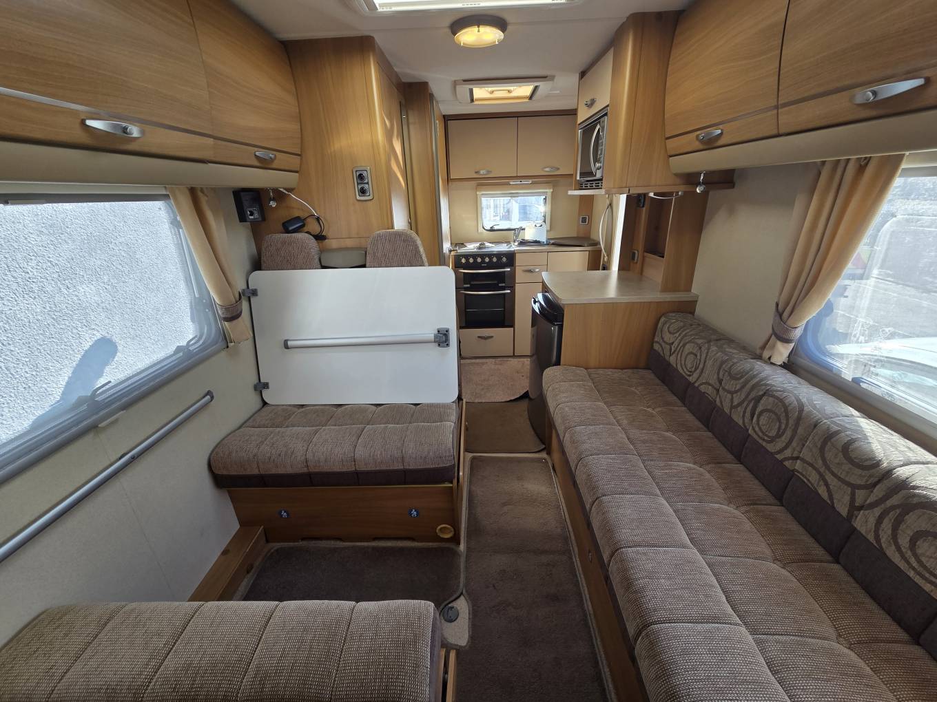 Probably the highlight of this lovely motorhome is the huge centrally located lounge which really is a wonderful place to enjoy meals, drinks and fun times with family or friends. It consists of a large side facing sofa and this can be used as a single bed which will be long enough for most adults. On the opposite side is the dinette area featuring a forward facing two seater sofa fitted with two travelling seat belts and a rear facing two seater sofa. The dining table attaches to a side rail and this can be removed if you require more legroom or a more traditional style lounge layout. The dinette converts into a double bed which is plenty large enough for 2 adults. The remaining 2 sleeping berths are in the overcab bed although many people prefer to use this area for storage as you can pack a huge amount of equipment or bedding up there.