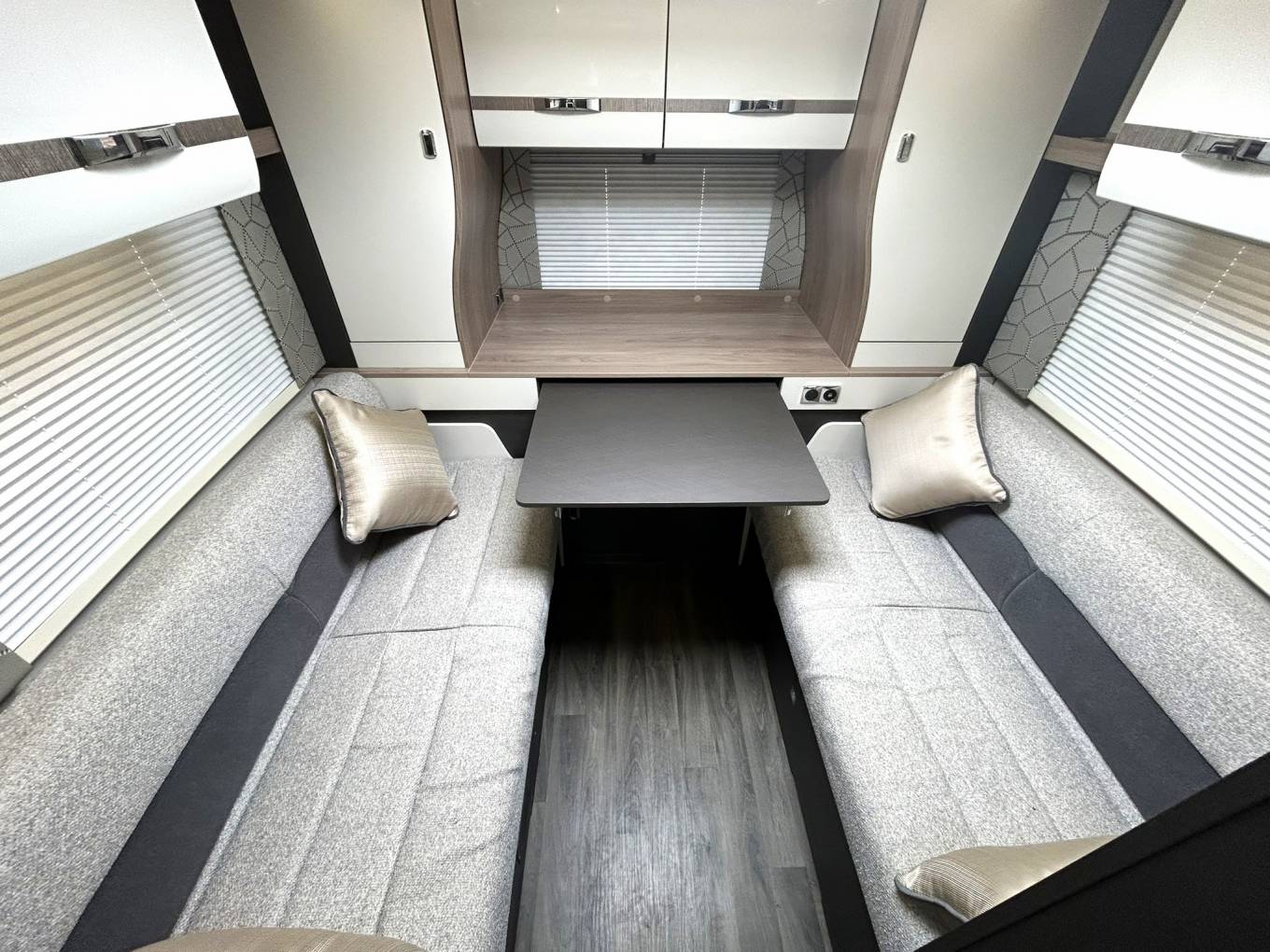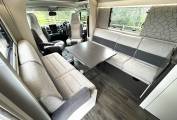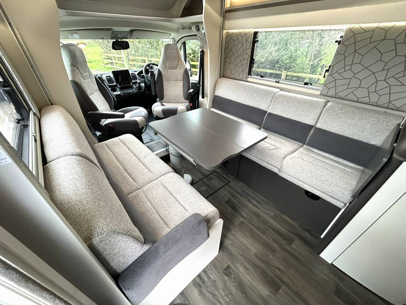 - Front lounge with 2 swivel Captain seats, two long facing sofas, incorporating 3 hidden travelling seat belts. Providing space for dining, relaxing and entertaining