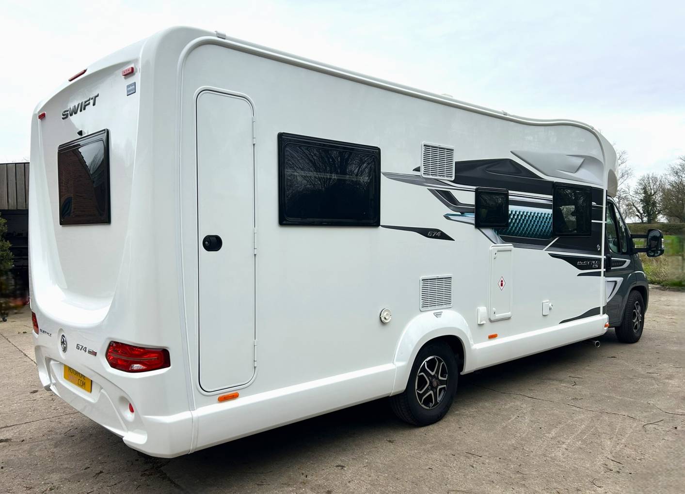 Swift Escape 674 6 Berth Motorhome with rear U-shape lounge and front drop-down bed.