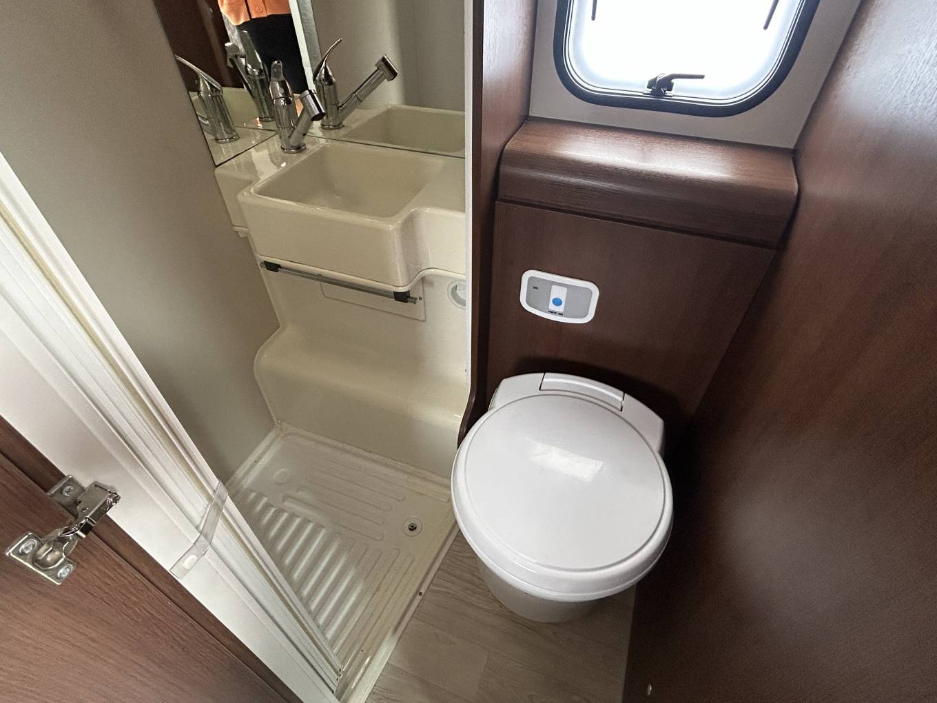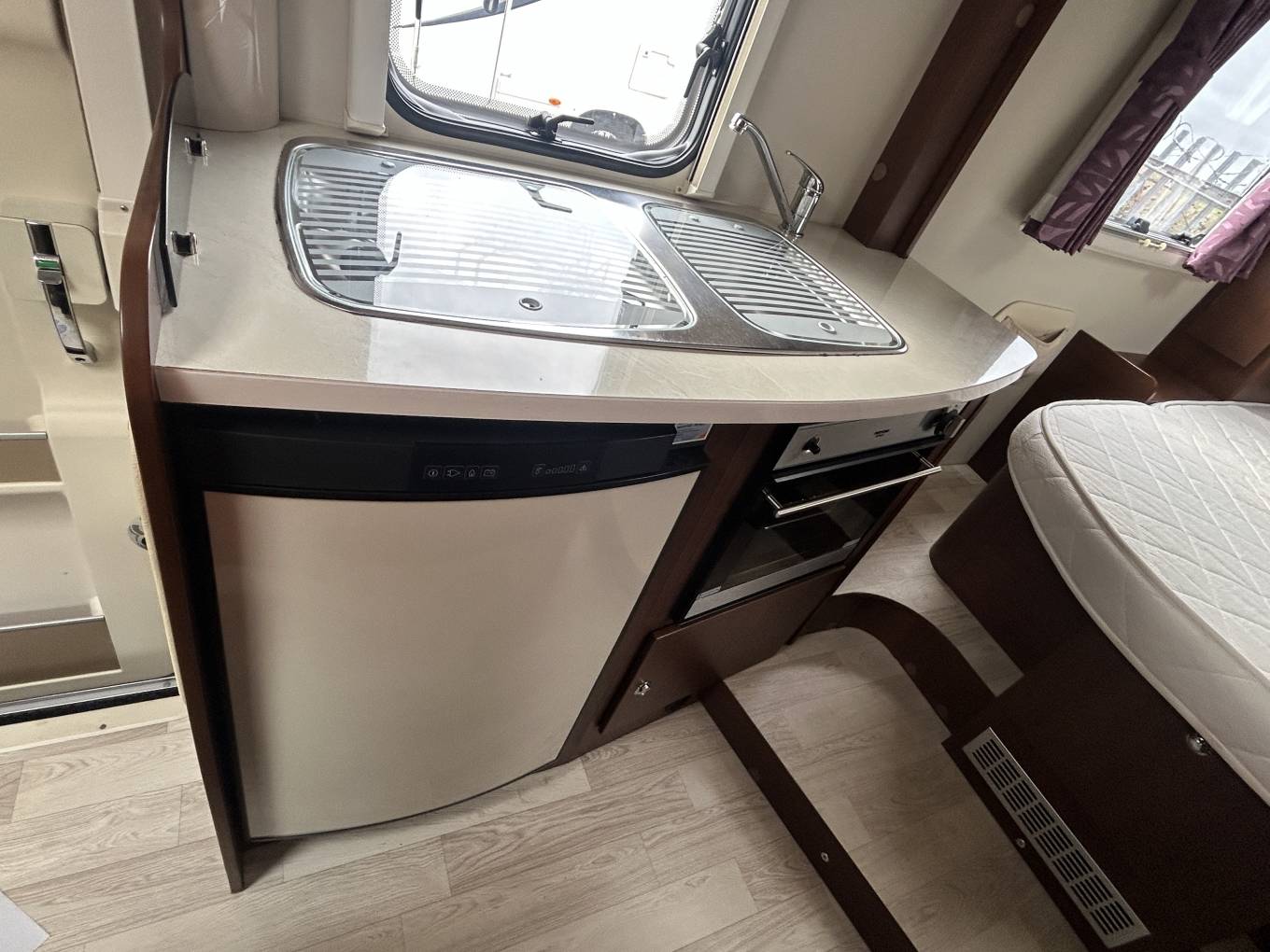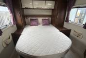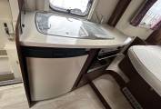The kitchen is well equipped with a 3-burner gas hob, and a Thetford duplex oven and grill, along with a generous fridge/freezer, providing everything needed for cooking while away. The washroom offers practical facilities for touring, ensuring convenience wherever you travel.