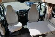 Open the side door & extend the electric step to enter the lounge & dining area. This motorhome is fitted out with a half-dinette to include 2 additional travelling seats and can be made up into a third occasional bed. AVTEX drop-down TV, large extendable dining table. Windows & large panoramic sky roof flood the area with natural daylight. Both front seats swivel, plus upper storage lockers.