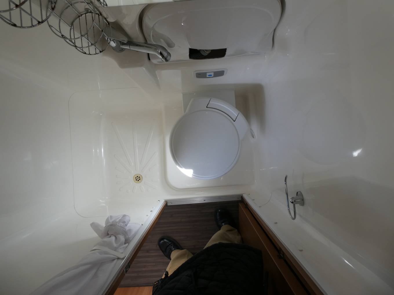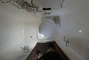The compact washroom has a fold-down sink, cassette toilet and shower cubicle to the side.