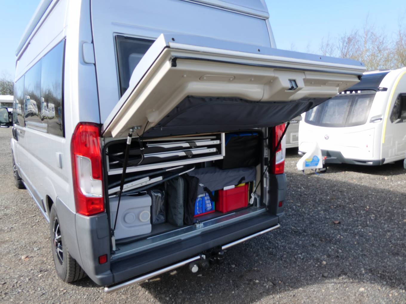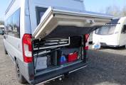 Externally there is a Thule wind-out awning, refillable LPG tank, gas BBQ point, tow bar, ideal for a bike rack and access to the excellent rear storage area which accepts a surprising amount of luggage.