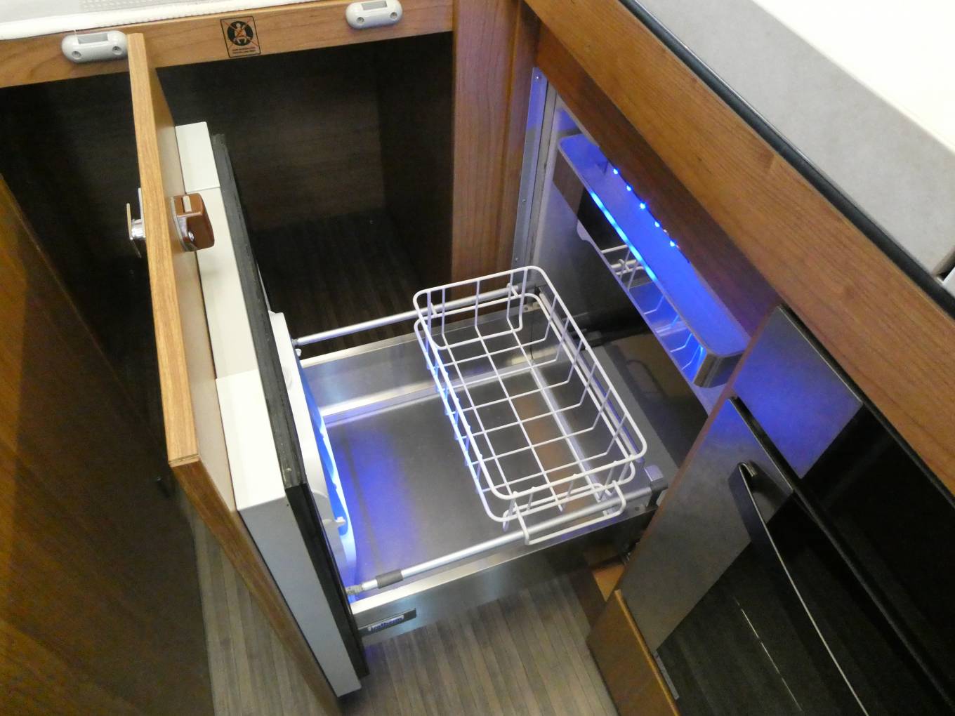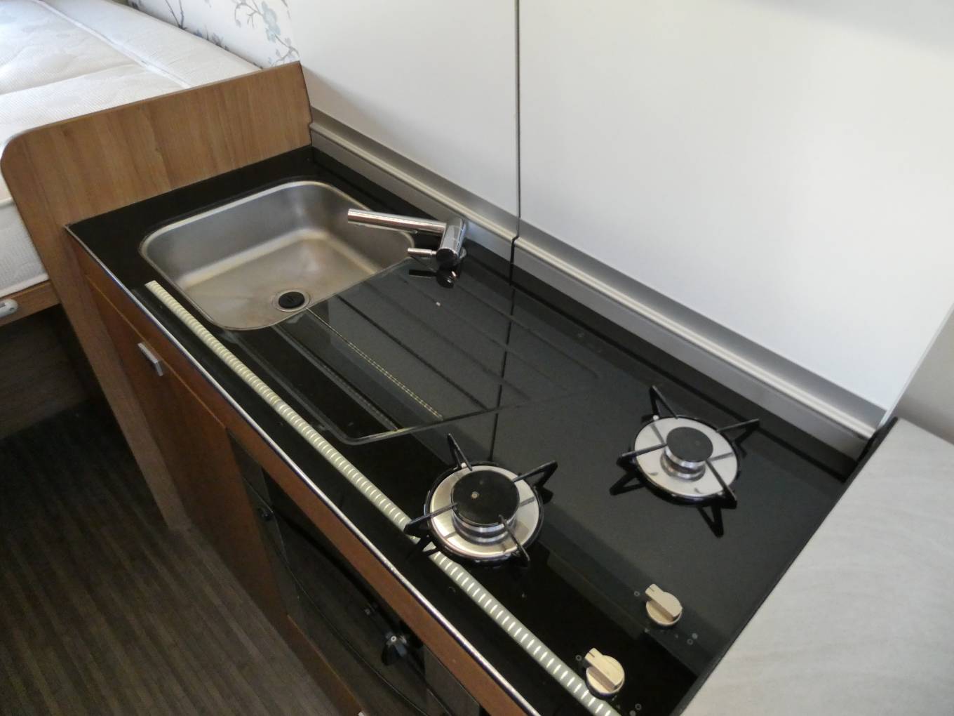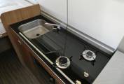 The kitchen has an integrated 2 gas burner hob & stainless steel square sink with chrome mixer tap, large covers drop to make counter space. Combi gas grill & oven, Isotherm fridge, plus cabinets to store all your holiday provisions.