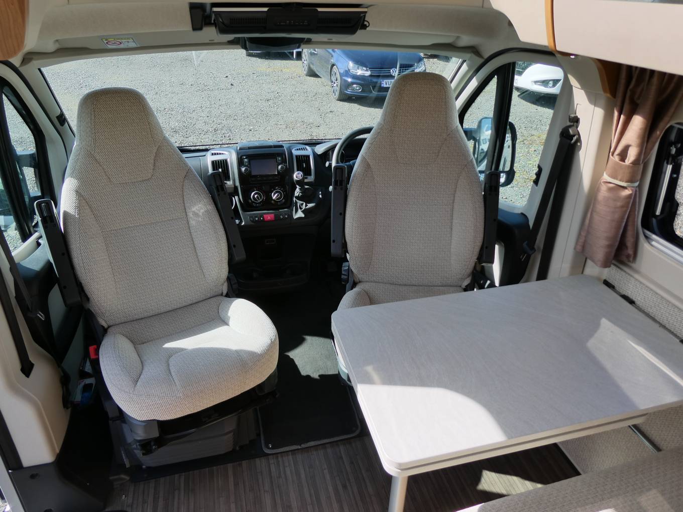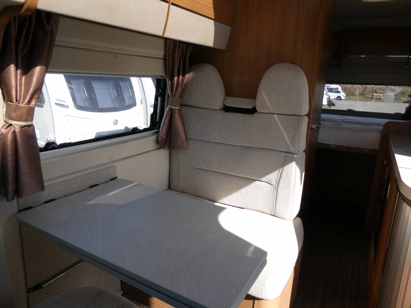 Truma combi-boiler giving blown-air central heating & hot water on gas / electric. Wood effect flooring, wardrobe, black-out blinds & fly-screens throughout.