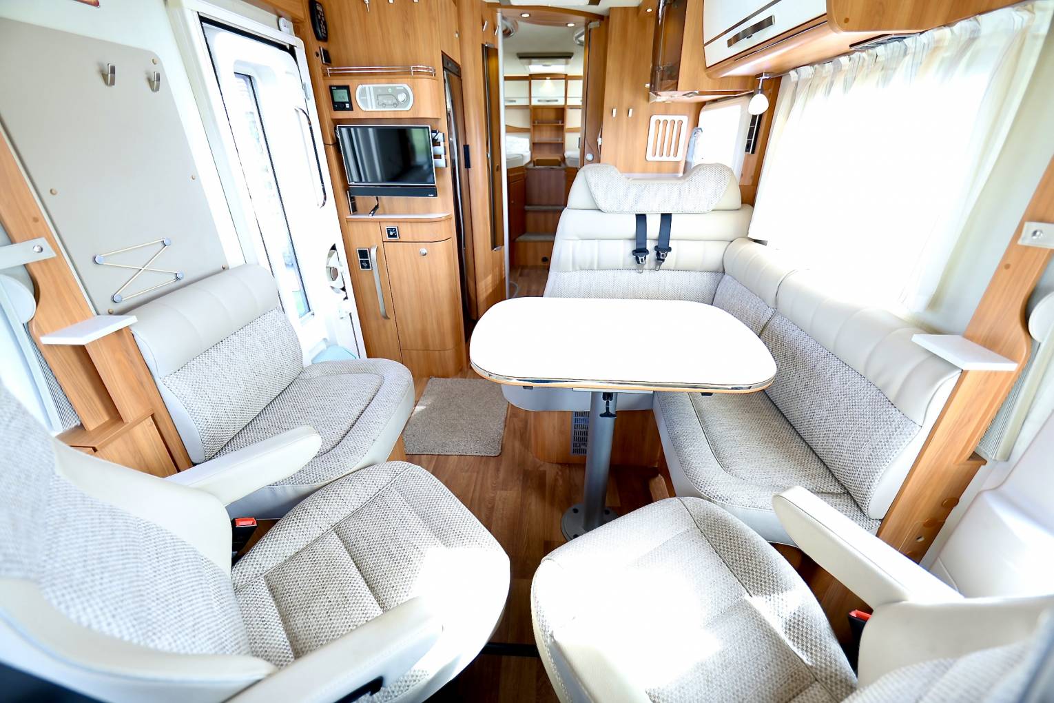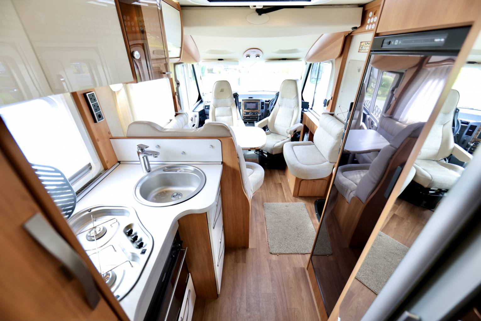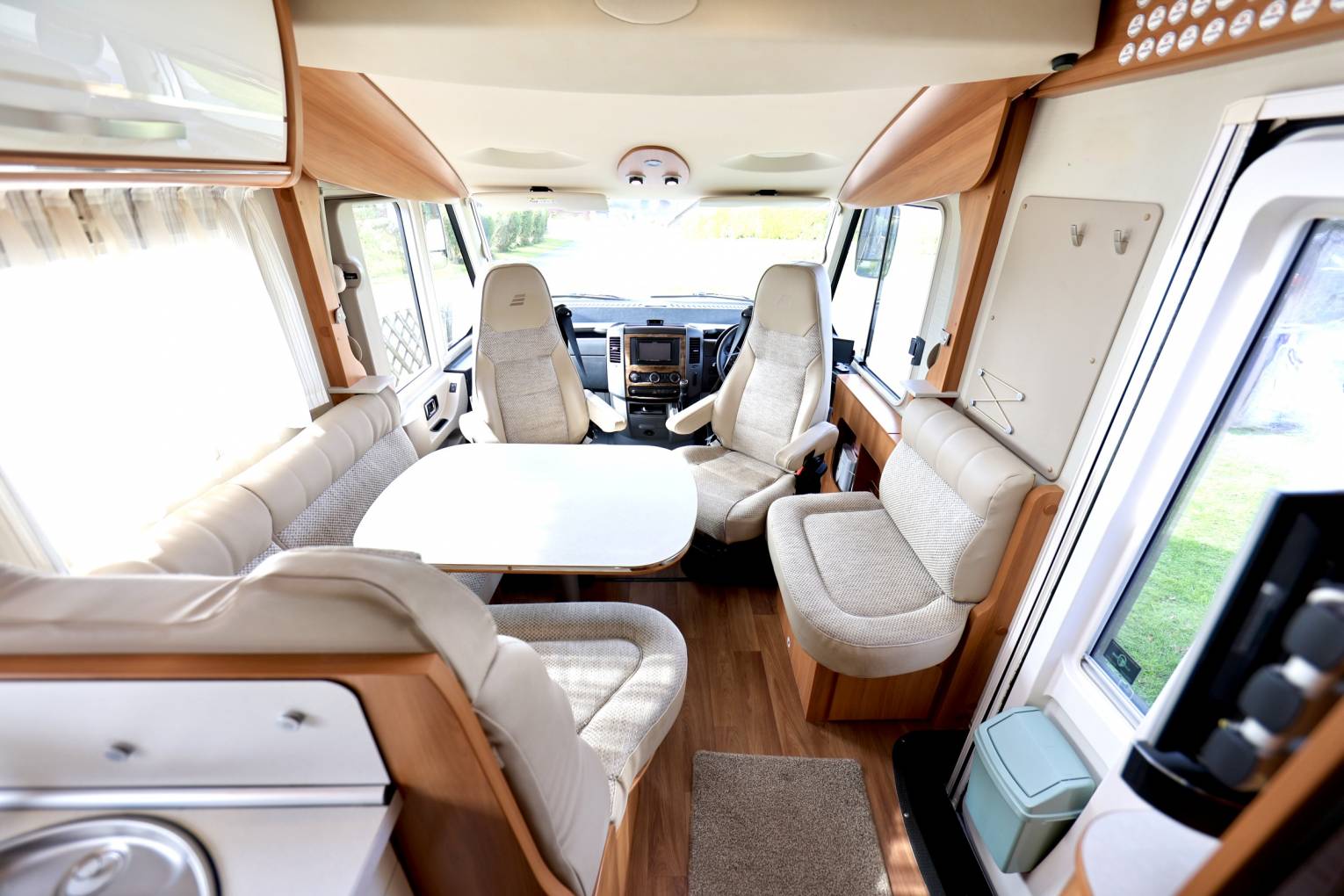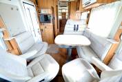 This motorhome is a penthouse on wheels, if you're looking for that ultimate luxury experience, then you have found it here. Habitation air-con and heating system that is fully controllable via inet App. A fixed double bed at the rear with drop down TV and USB point, there is also a drop down double bed over the front cab. A beautifully laid out lounge area/dining with WiFi and Avtex Tv and soundbar, 2 captain swivel seats and a movable table. There are two safety belts hidden in the rear seat.