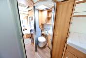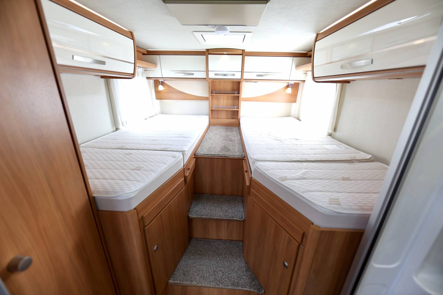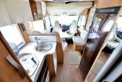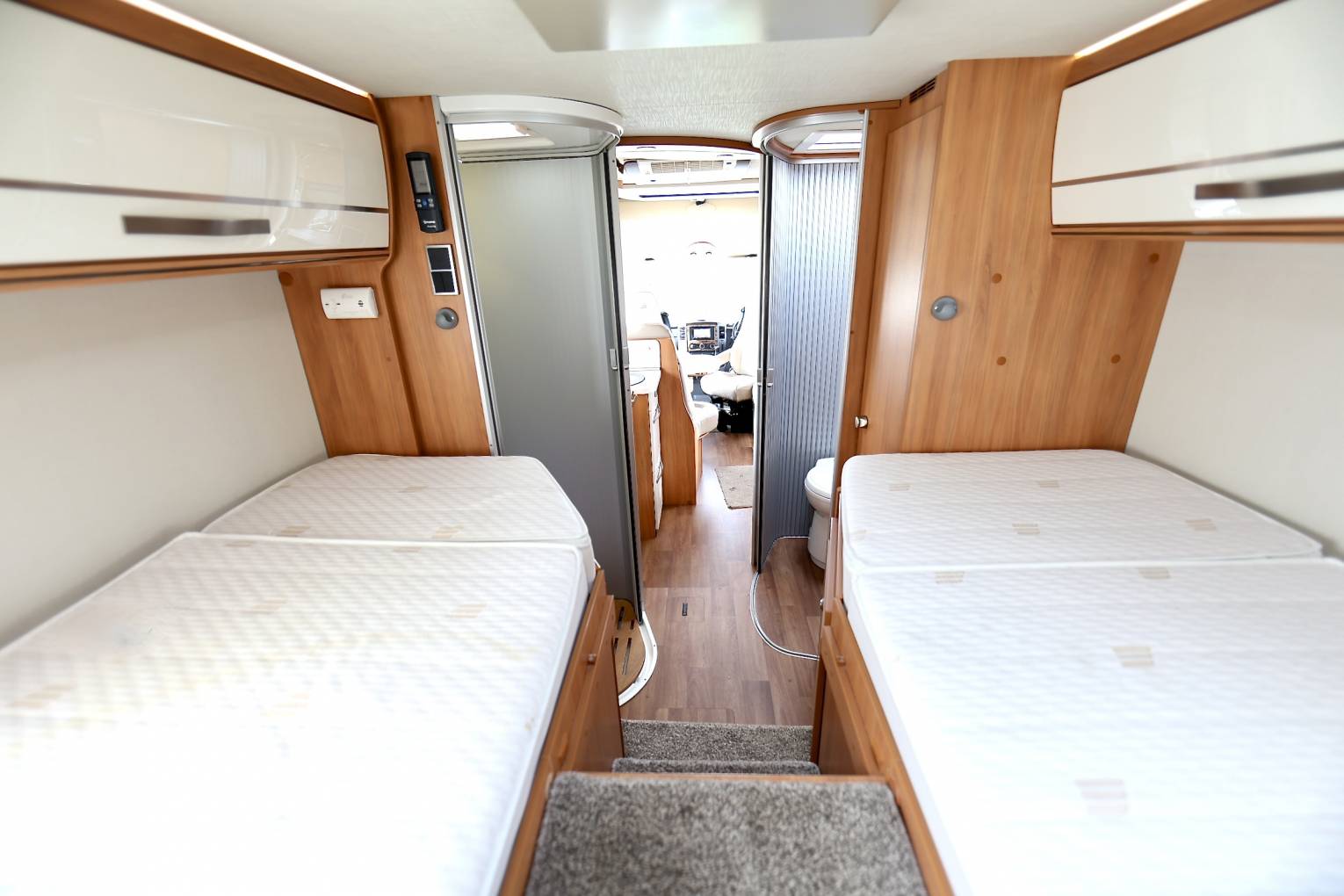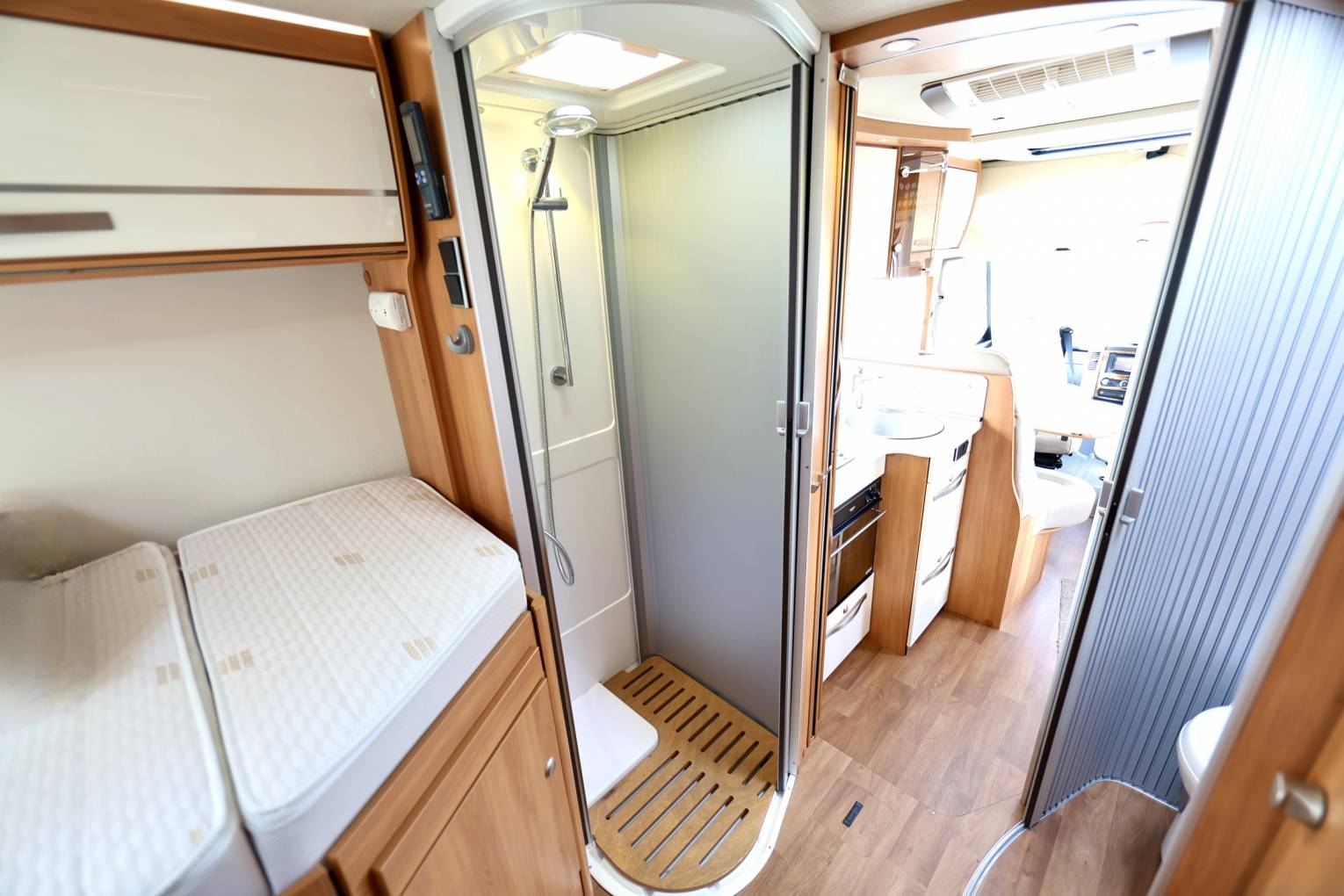 The motorhome flows from front to rear with a stunningly styled interior with fabrics and materials that are seamless throughout, from the lounge area through to the kitchen and shower room. The separate shower and toilet area can also be sectioned off with a sliding door system making the motorhome 2 sections from one bedroom to the other. One aspect that I particularly like about this Motorhome is that it has a habitation door and a front passenger door allowing you to get out on the curbside.