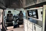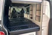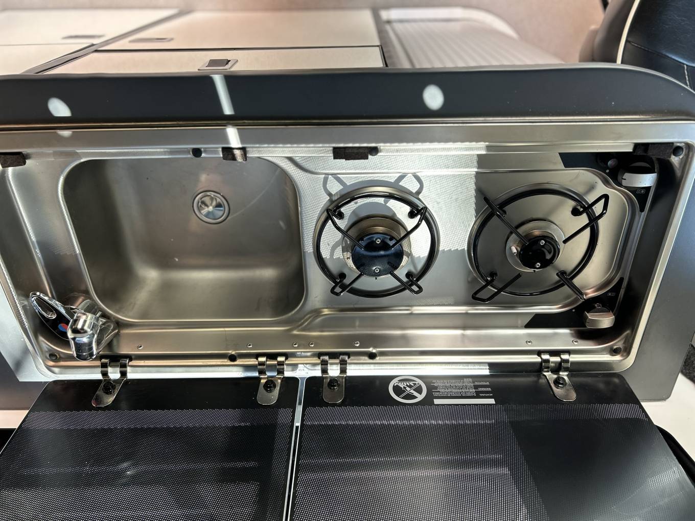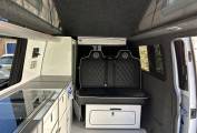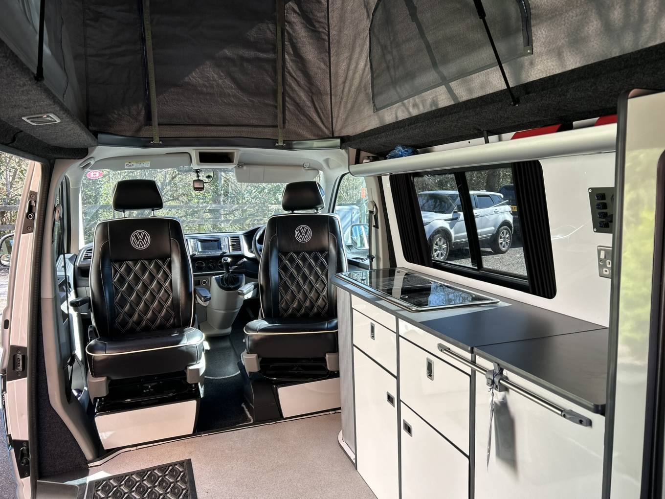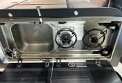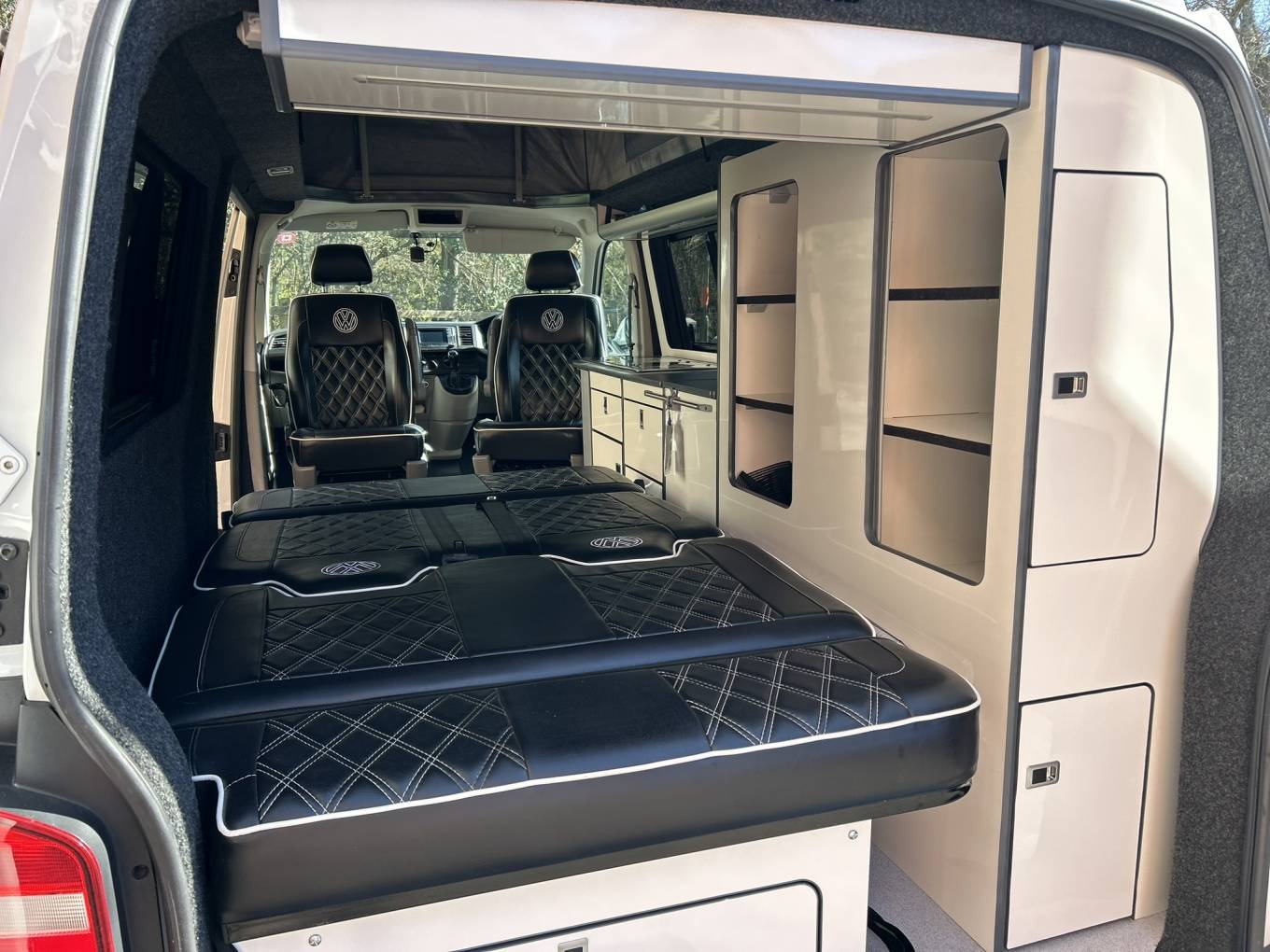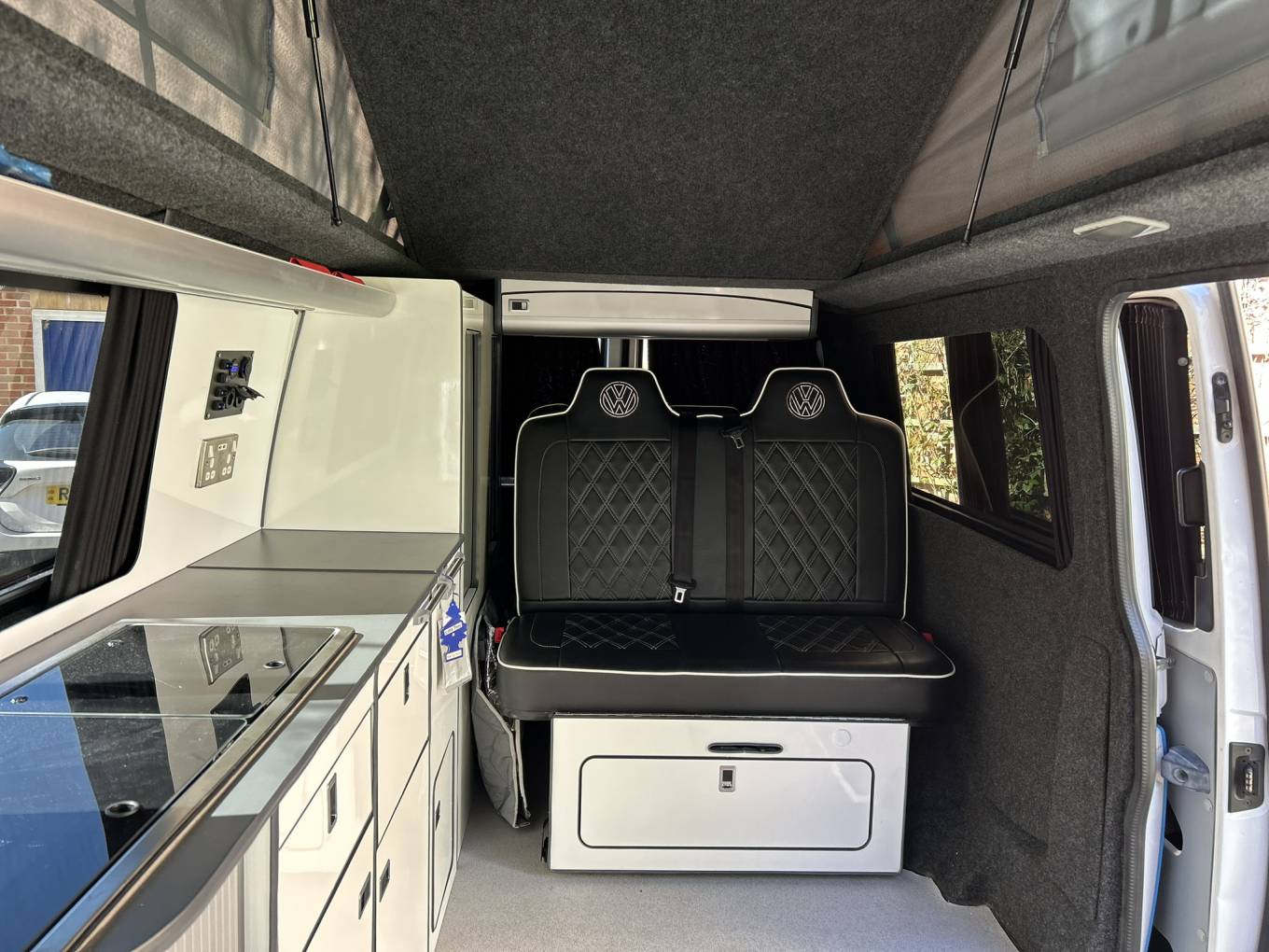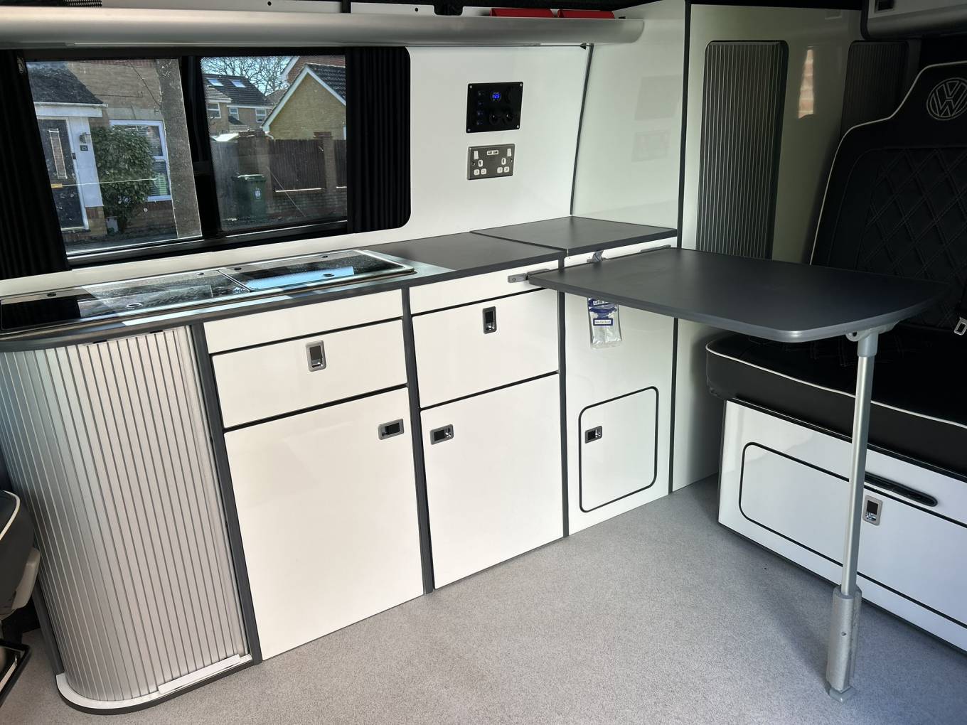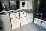 Inside the van has been converted by EVO Design in a stylish white gloss. It comprises of 2 captain swivel seats, Rock n Roll bed with 2 x seatbelts, Double burner hob, sink with mixer tap(cold water supply), Toilet, shelving with LED lighting, gas and water lockers and removable table.