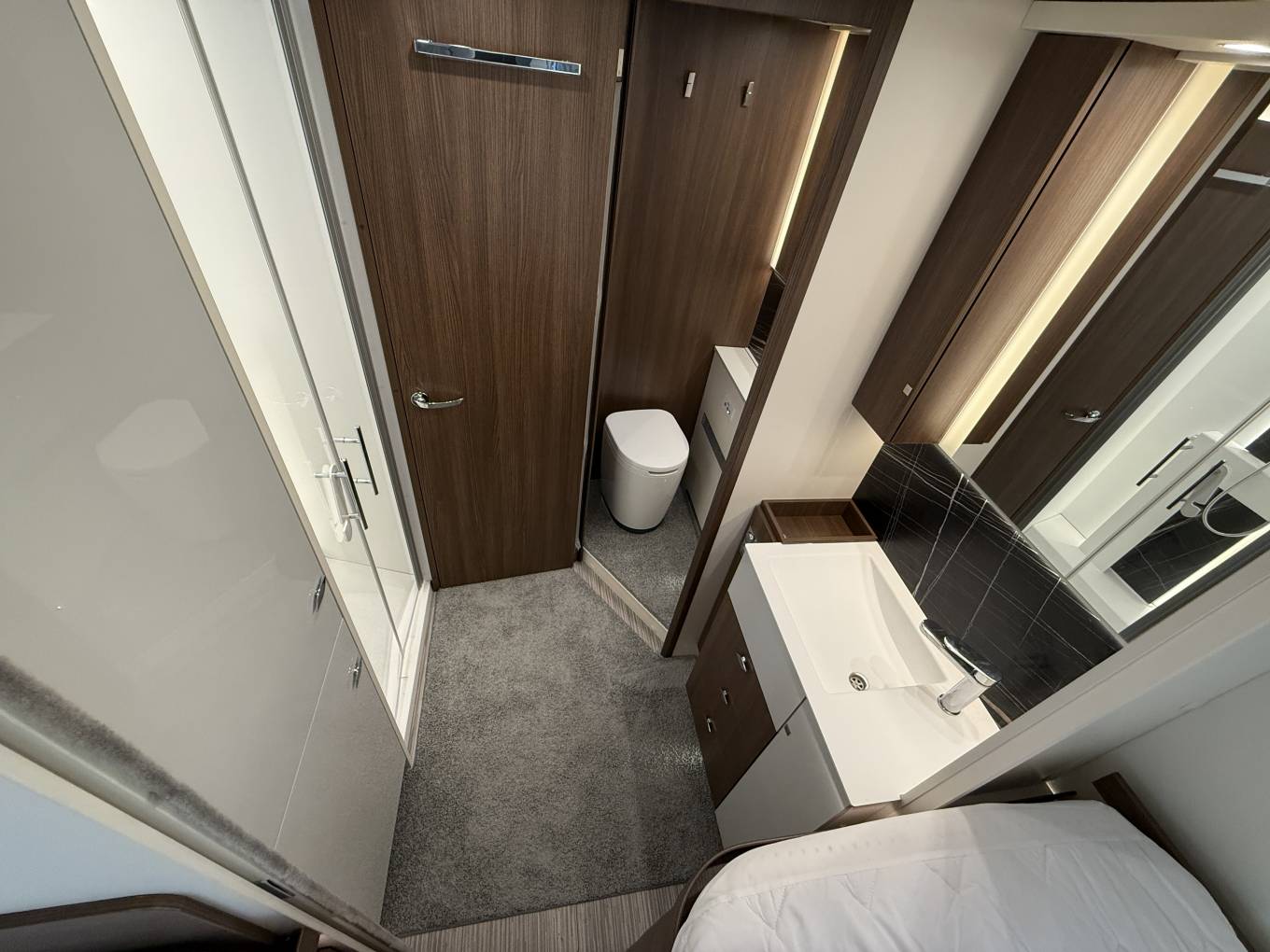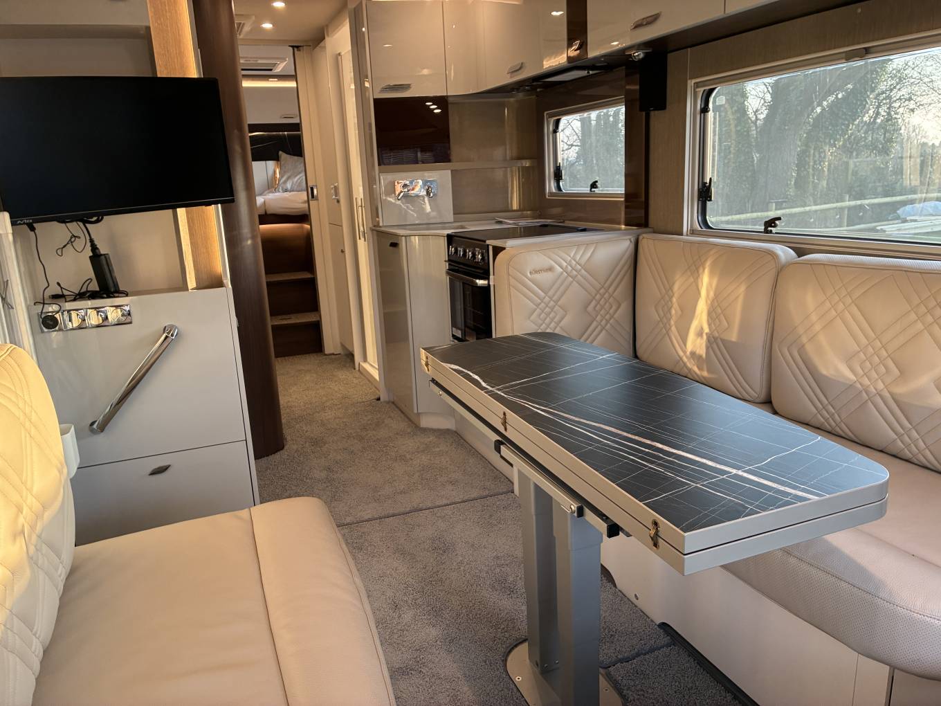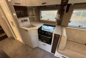 Alde hydronic heating throughout, roof mounted habitation air conditioning, Thule awning, 27 inch Avtex smart TV, TV and DAB aerial, 5G ready WiFi.