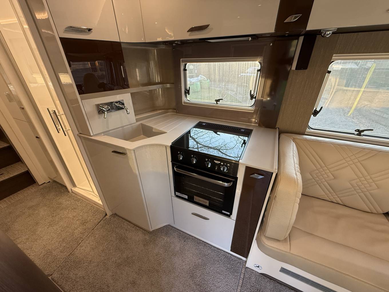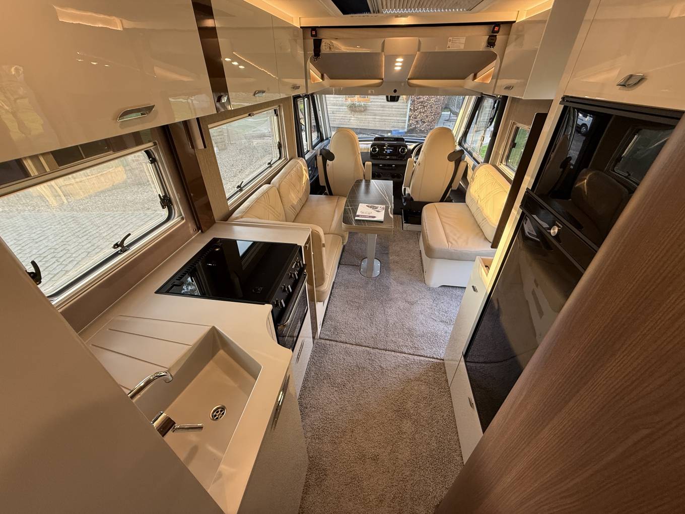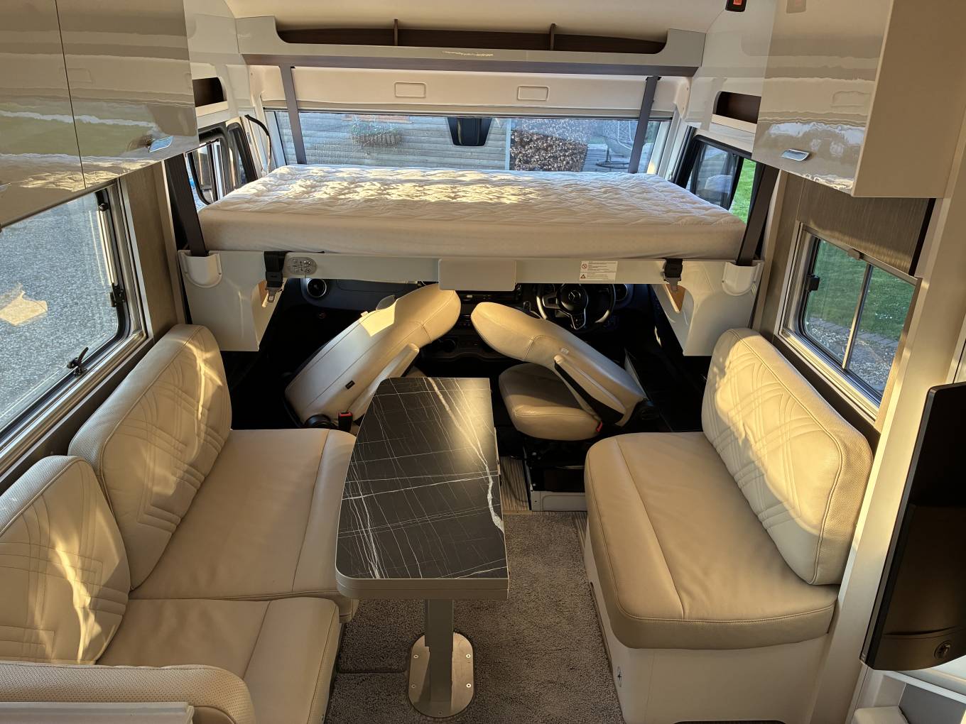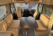 Four berth, four belts. Fixed rear single beds with storage below and large rear garage. Electric drop down double bed over cab. Bench seat lounge with flip over table, cream full leather upholstery and scatter cushions.