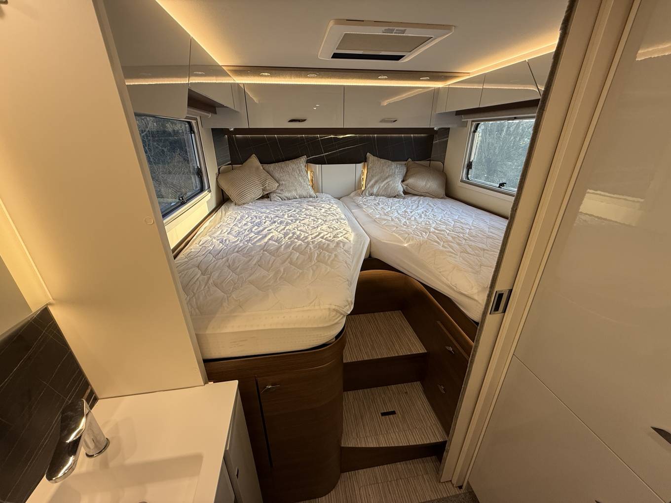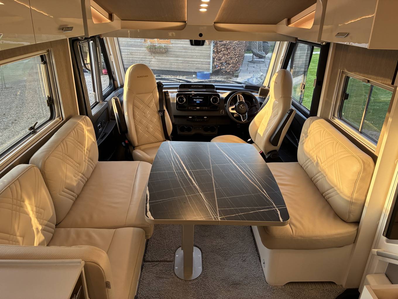 Mercedes cab air conditioning, heated seats, 10.1 inch media screen, active cruise control, speed limiter, electric windscreen blind and blinds to all cab windows. Habitation area has blinds and flyscreens, large habitation door, internal underfloor storage and full width external underfloor locker accessible from both sides.