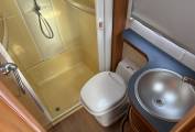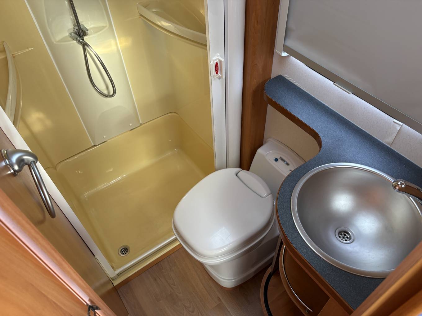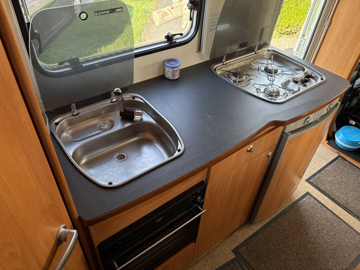 Entering through the Habitation door, directly ahead is the lounge and Dinette area with bench seat for two along with two captain swivel chairs comfortably seating 4, this area also makes up the third bed. The kitchen provides a 3 ring gas burner hob, 3 way fridge freezer, sink with hot and cold running water, Oven and grill along with generous storage. To the rear of the spacious yet compact motorhome is the bedroom and bathroom. To the left is the fixed french bed with memory foam mattress. Here you have access Truma boiler and fresh water tank. Also, internal access to the garage space. The washroom comprises of thetford electric flush toilet, Wash basin, shower with screen and generous storage.