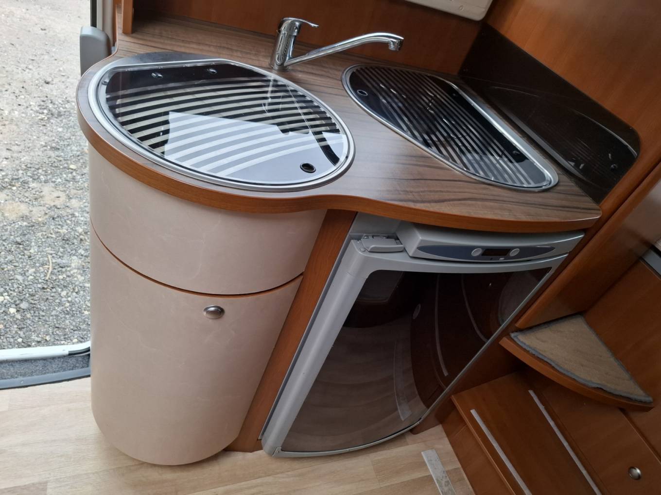Conveniently located for food preparation and storage, the modern, stylish, offside central kitchen features a hob with two burners, a sink, a fridge with a freezer box.