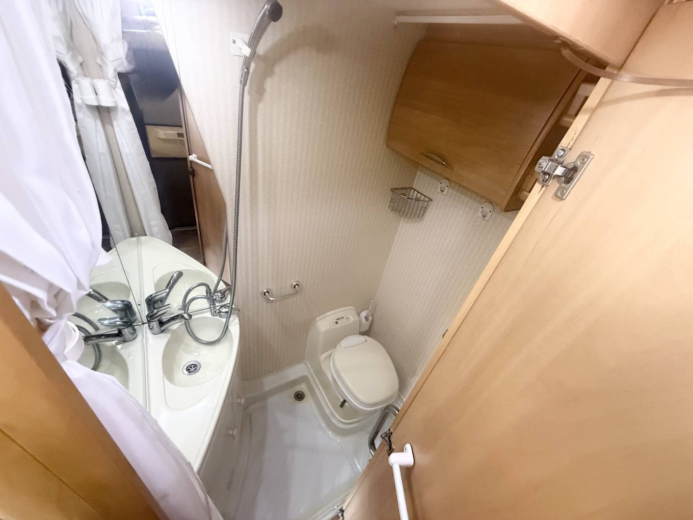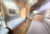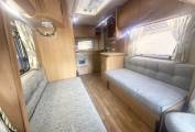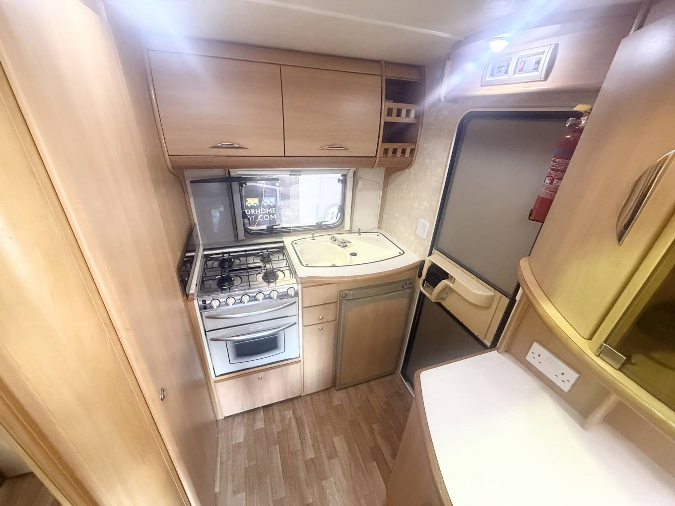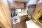 The washroom has a shower head built into the tap and there is also a screen that pulls across the rest of the washroom so you don't have to wipe everything down after use. There is a wash basin with a mixer tap, a large mirror, a bathroom cupboard for your toiletries and a cassette toilet. Then at the rear you find the kitchen which has a hob 4 gas burners, an oven and grill, a 3 way fridge freezer and sink with drainer.