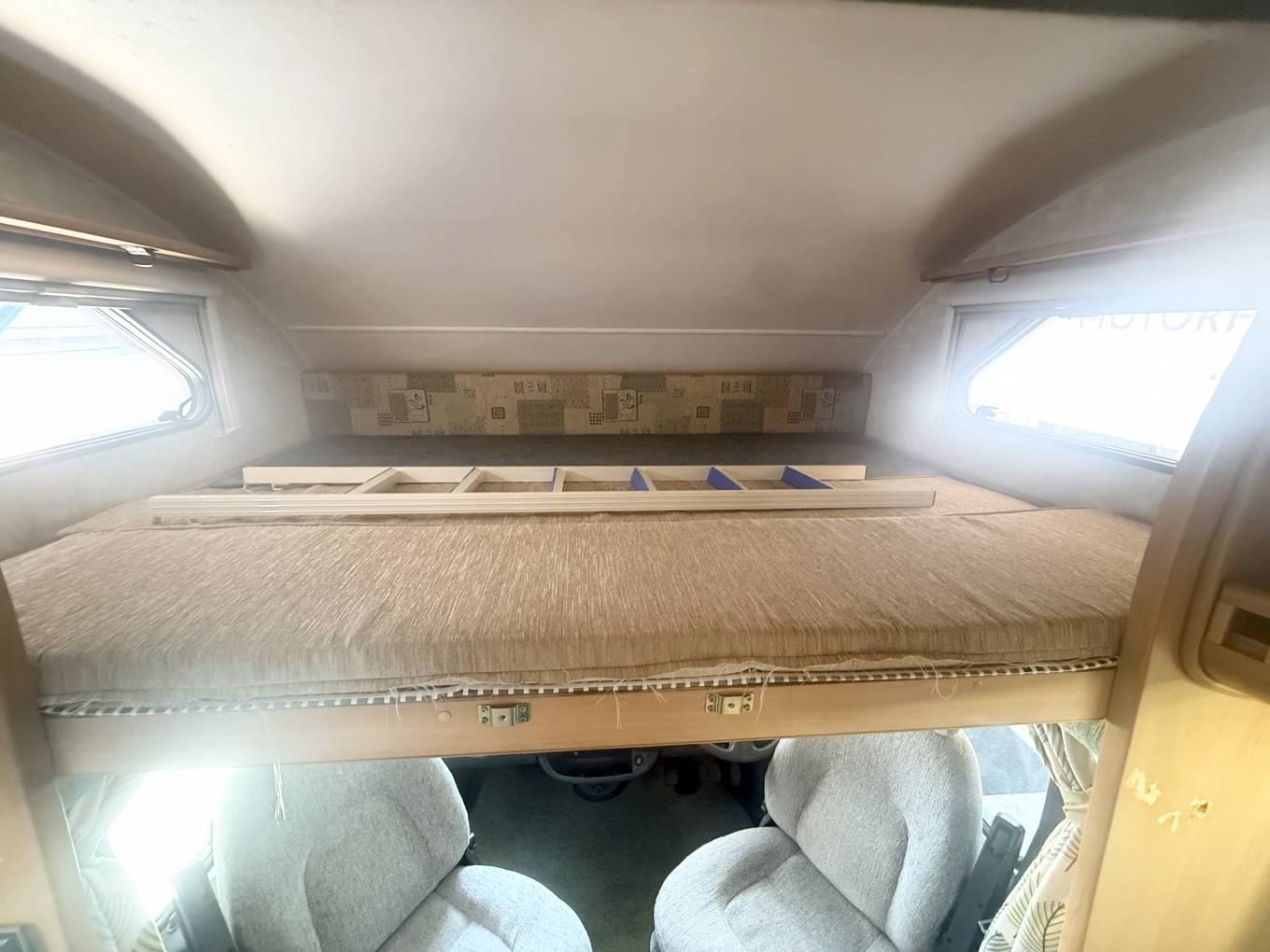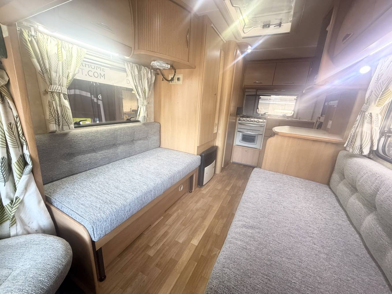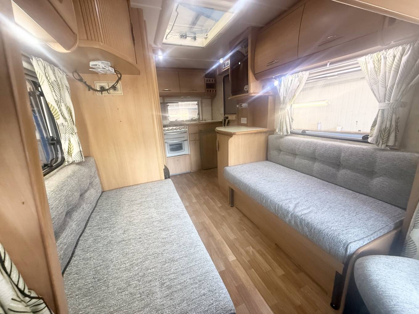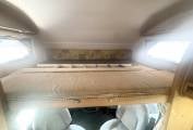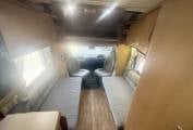 Behind the cab you have the lounge area featuring 2 side facing sofas, These pull together to make a large bed measuring approximately inches or alternatively you can spin the 2 swivel front seats around and use them as 2 single beds. There is storage space under the sofas. you can use the over cab bed for large storage. At meal times simply erect the freestanding dining table and when you have finished this neatly stores away in a small cupboard. Above the lounge is a large skylight and with the 2 lounge windows you are guaranteed plenty of daylight flooding in.