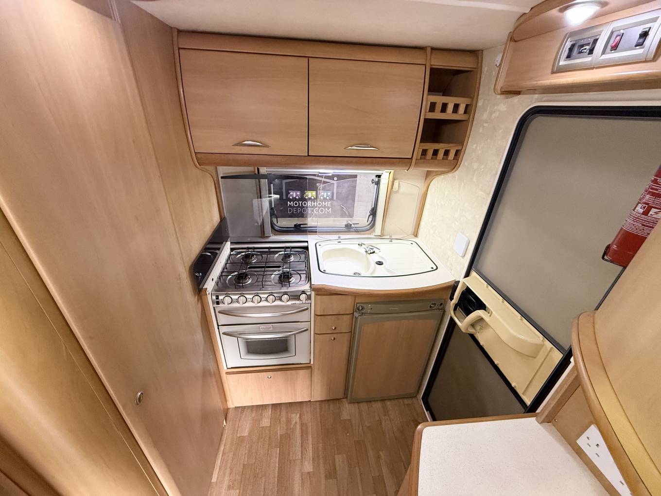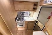 The washroom has a shower head built into the tap and there is also a screen that pulls across the rest of the washroom so you don't have to wipe everything down after use. There is a wash basin with a mixer tap, a large mirror, a bathroom cupboard for your toiletries and a cassette toilet. Then at the rear you find the kitchen which has a hob 4 gas burners, an oven and grill, a 3 way fridge freezer and sink with drainer.