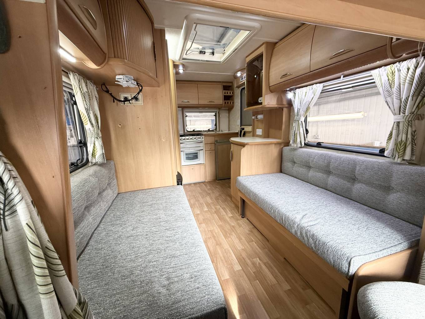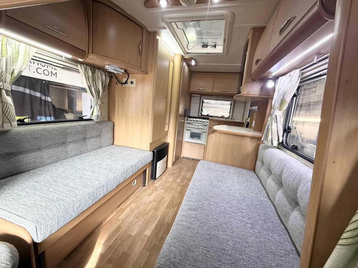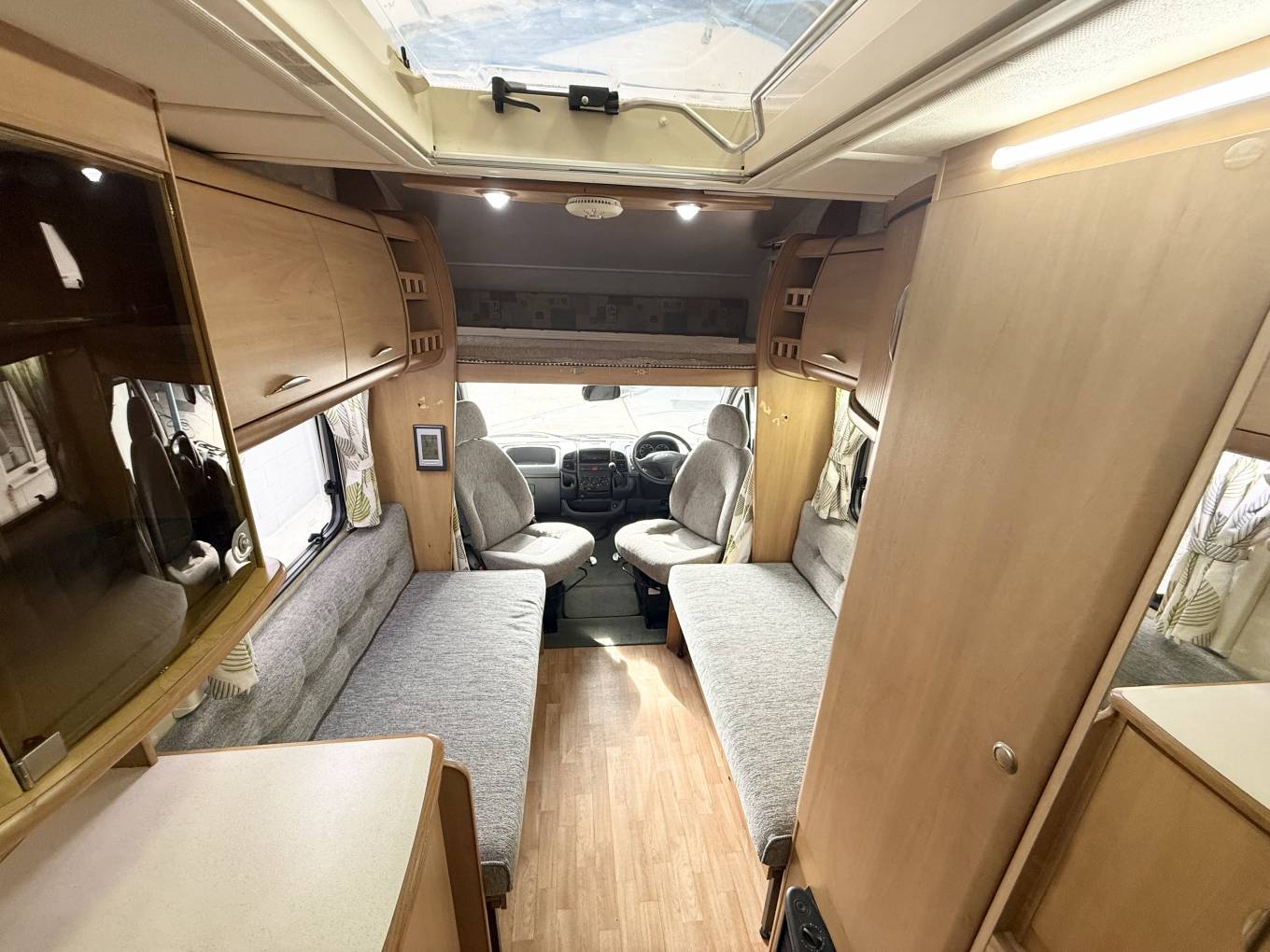 Behind the cab you have the lounge area featuring 2 side facing sofas, These pull together to make a large bed measuring approximately inches or alternatively you can spin the 2 swivel front seats around and use them as 2 single beds. There is storage space under the sofas. you can use the over cab bed for large storage. At meal times simply erect the freestanding dining table and when you have finished this neatly stores away in a small cupboard. Above the lounge is a large skylight and with the 2 lounge windows you are guaranteed plenty of daylight flooding in.