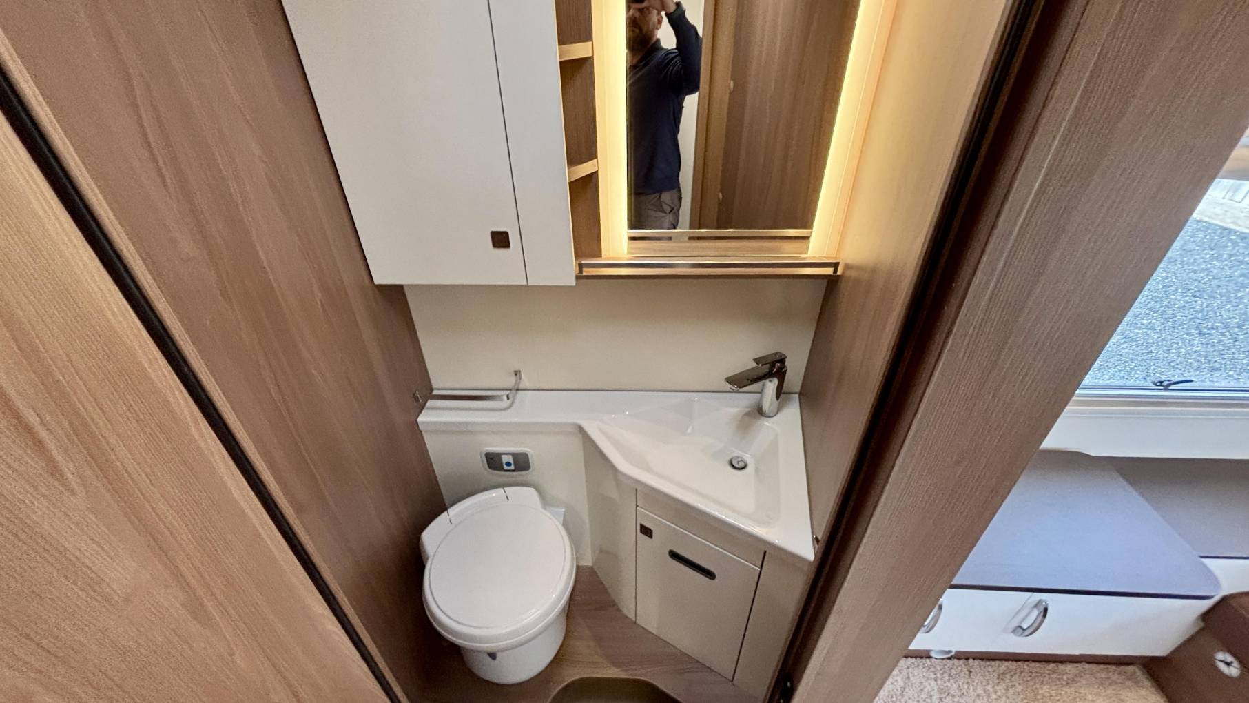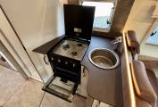 The fully equipped kitchen includes a 3 ring gas hob, oven/grill, extractor fan, and a large fridge freezer, providing everything needed for extended trips. The washroom is equally impressive, featuring a well-designed layout with a separate shower cubicle, offering excellent comfort and usability on the road.