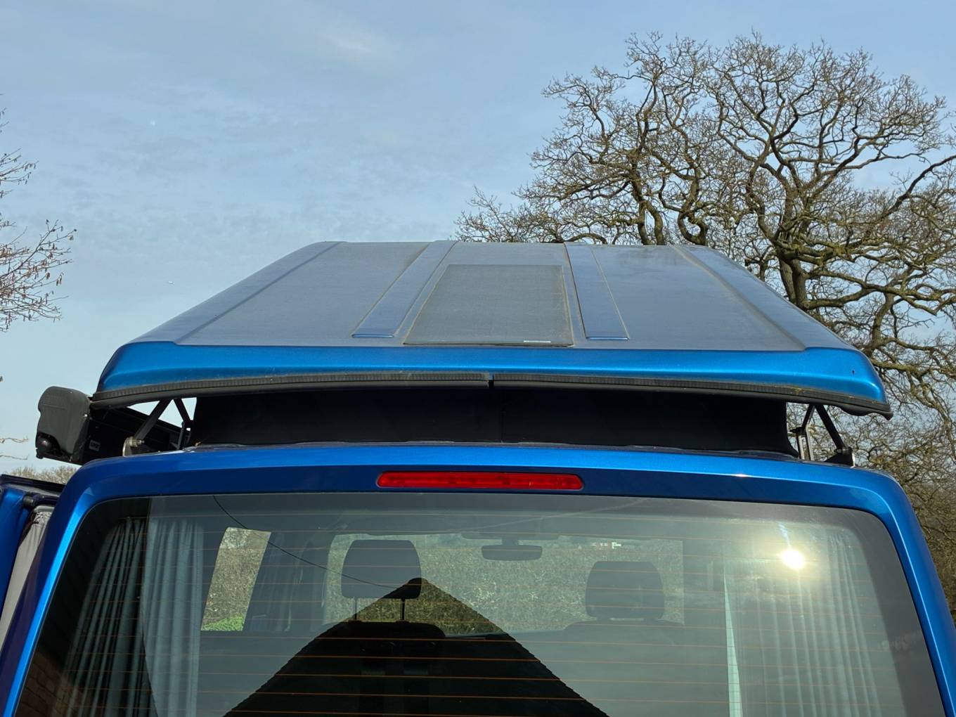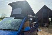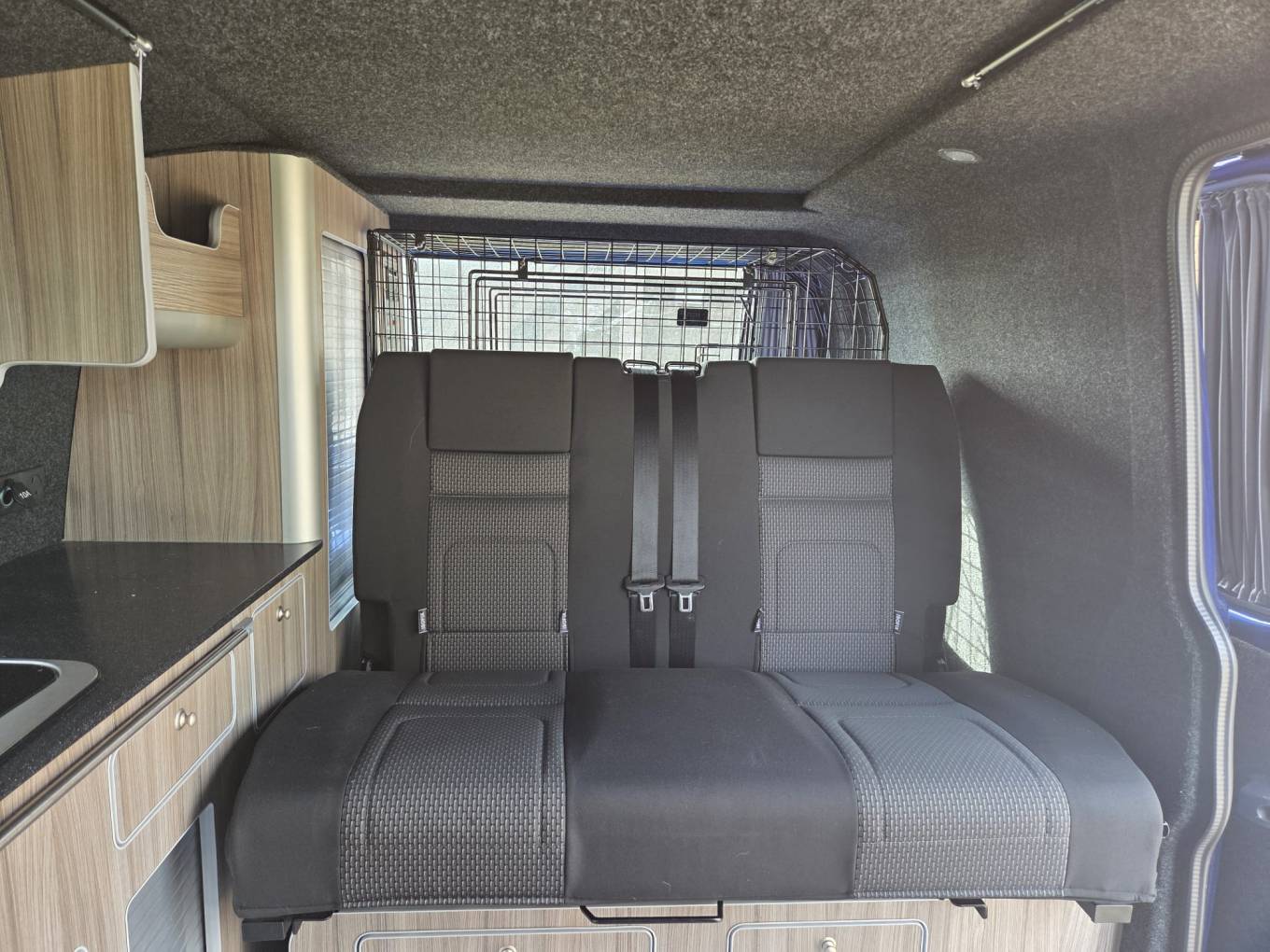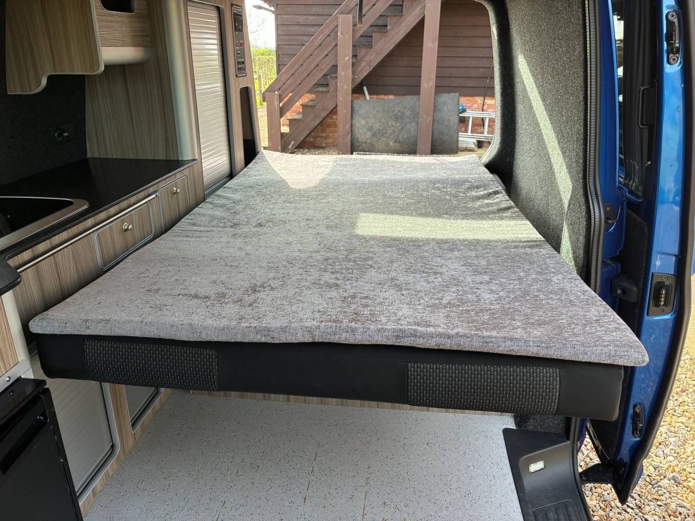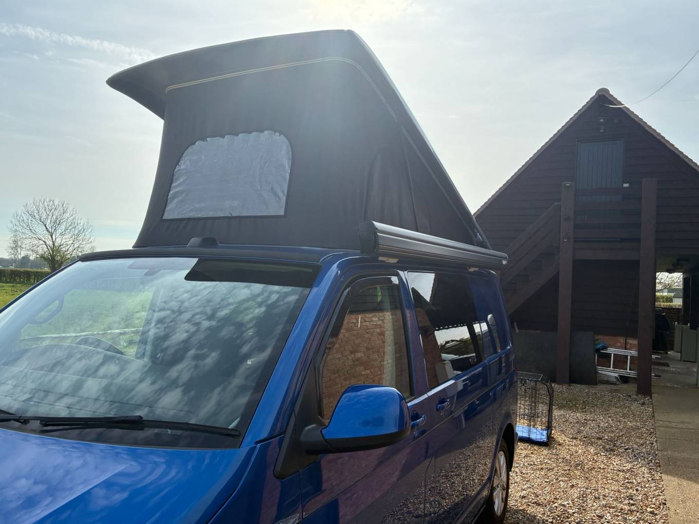 MOTORHOME DEPOT RICHMOND-UPON-THAMES are pleased to present this beautiful eye-catching blue VW Transporter T28 Highline TDI | 2022 | Webbs Conversion | just 9,019 miles on the clock | 110HP | ULEZ FREE | 2 Owners | 4 Berth | Pop-Top | 4 seatbelts | Fiamma F45S wind-out canopy | 2 x swivel seats | sought after tailgate up & over door | Rib bed with topper | black-out curtains | light/mid-wood grained interior with black work surface over | light grey speckled flooring | LED mood lights (white & blue) | 2 x gas ring hob | sink with cold water tap | removable dining table | roller shutter door storage cupboards | Dometic fridge with small freezer compartment | Diesel heater | 240v | 12v |