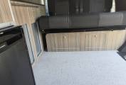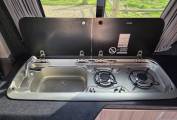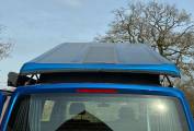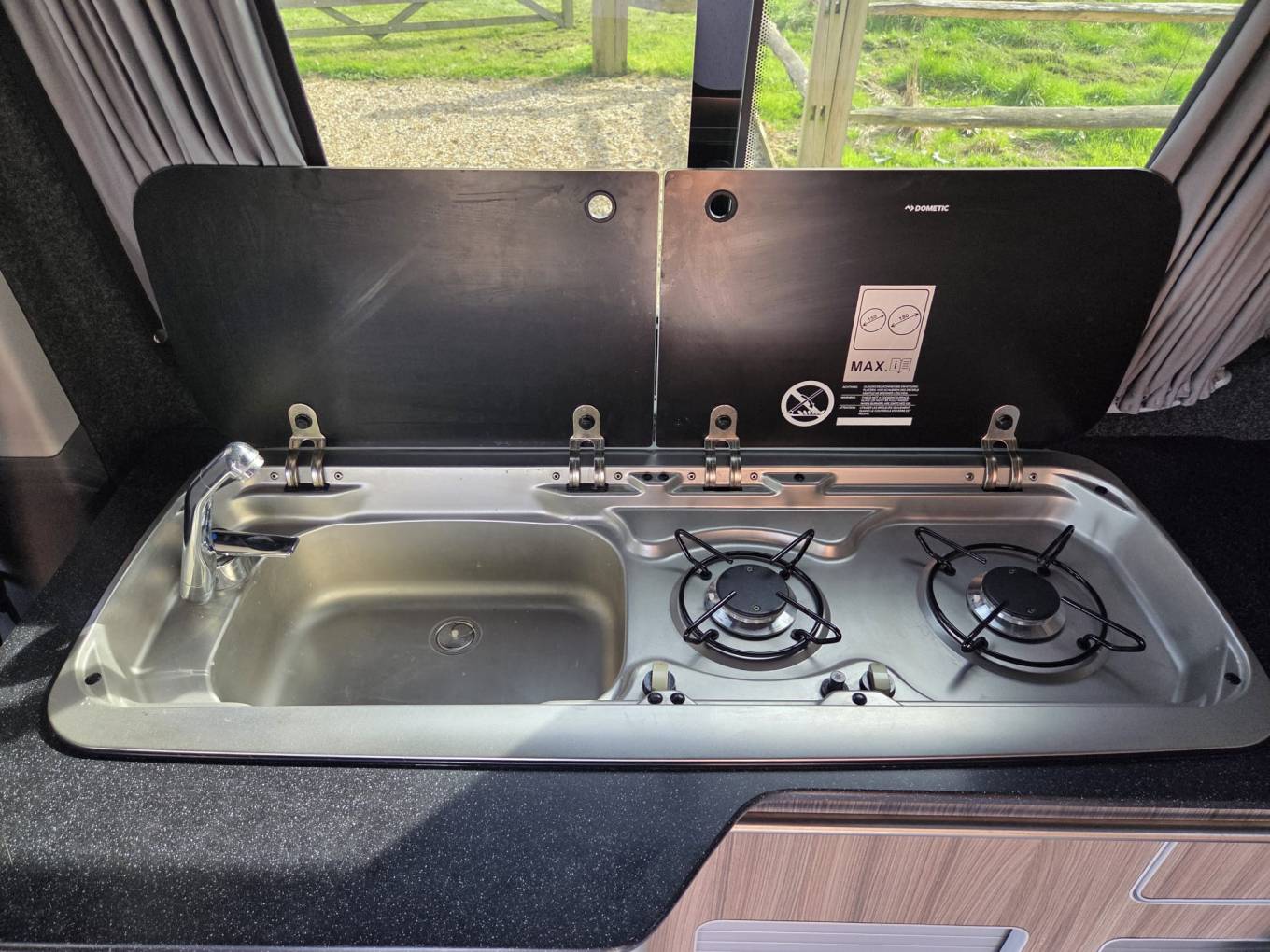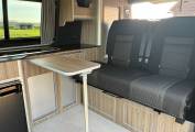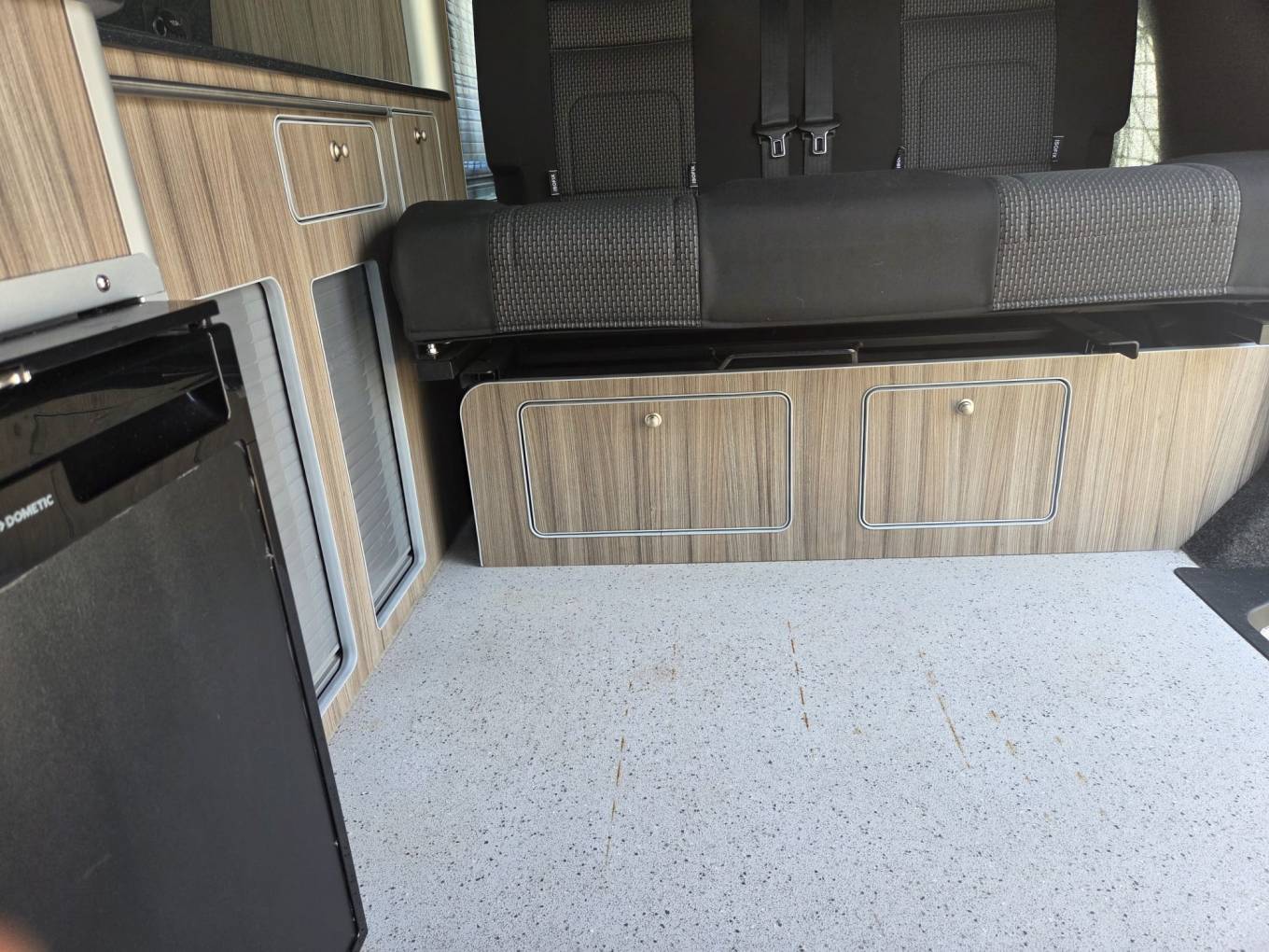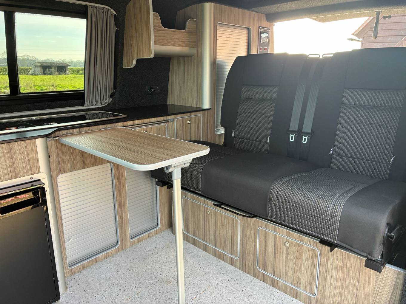 MOTORHOME DEPOT RICHMOND-UPON-THAMES are pleased to present this beautiful eye-catching blue VW Transporter T28 Highline TDI | 2022 | Webbs Conversion | just 9,019 miles on the clock | 110HP | ULEZ FREE | 2 Owners | 4 Berth | Pop-Top | 4 seatbelts | Fiamma F45S wind-out canopy | 2 x swivel seats | sought after tailgate up & over door | Rib bed with topper | black-out curtains | light/mid-wood grained interior with black work surface over | light grey speckled flooring | LED mood lights (white & blue) | 2 x gas ring hob | sink with cold water tap | removable dining table | roller shutter door storage cupboards | Dometic fridge with small freezer compartment | Diesel heater | 240v | 12v |