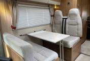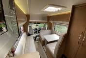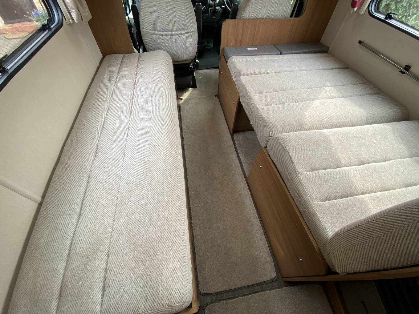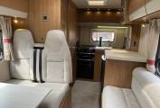Specification includes fly screens and blinds on all windows and skylights, there is a large central roof light that gives an airy feel, panoramic lounge windows, lots of storage space throughout and Truma space heating and hot water. Includes a drop down Avtex TV and there is a full set of removable carpets.