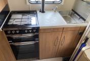 In good general condition throughout, commensurate to age and mileage. Starting at the rear is the versatile kitchen area with a stainless sink, additional work top adjacent, above the 3-way Dometic fridge freezer with integral ice box fridge, microwave, mixer tap, pull up three socket power stack, two-way ceiling fan, 3 gas burner hob with an electric hotplate, separate grill and oven and is set to the side of the habitation door with good storage. Adjacent is the rear washroom with Thetford swivel action, cassette, flushing toilet, vanity washbasin and mirror, medicine cabinet, opening opaque side window, skylight and walk-in shower with bi-fold doors.