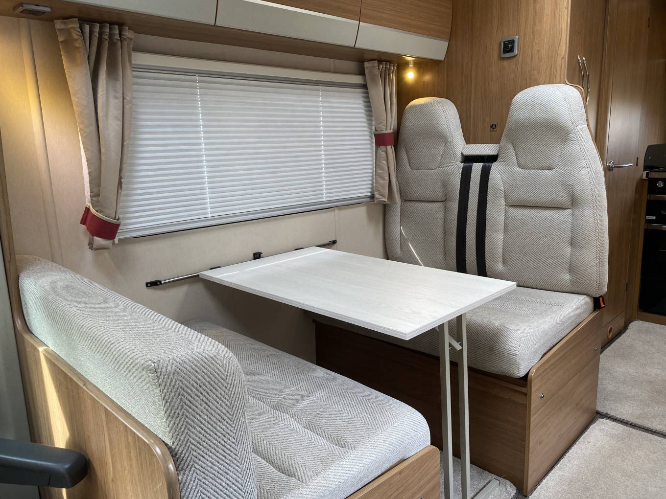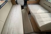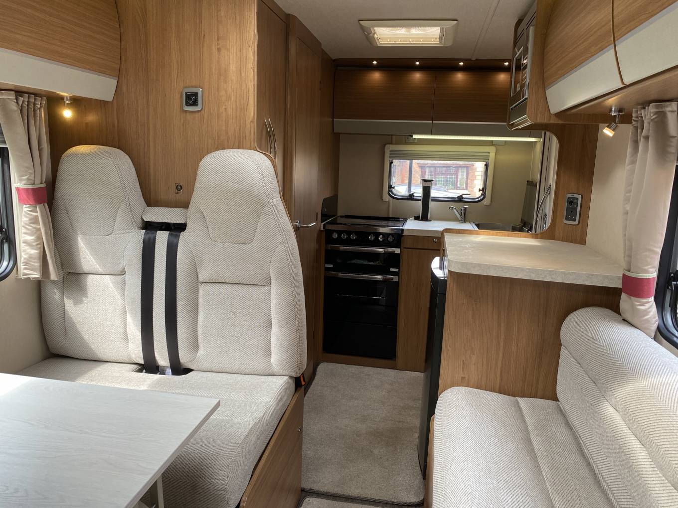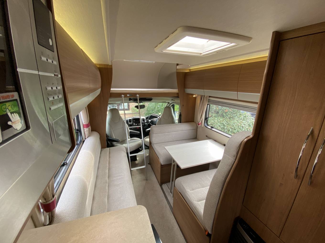 Moving forward into the highly adaptable central seating area, with a full dinette, including two 3-point forward facing passenger seatbelts, opposite is the comfortable three seater sofa, all upholstery is in good condition throughout. The dinette area can also be made up into a double bed. Also there is a generous size overcab double bed, with skylight above, which is easily accessed via a ladder, this bed area doubles up as a useful storage area when not being used and when pushed back allows greater cab headroom. Both cab seats swivel round to face the living area and the driver enjoys, air conditioning, driver and passenger air bags, electric front windows, radio with Bluetooth phone connectivity and reversing camera monitor, electrically adjusted wing mirrors and there is a full set of Remis concertina internal blinds for the cab front windows.