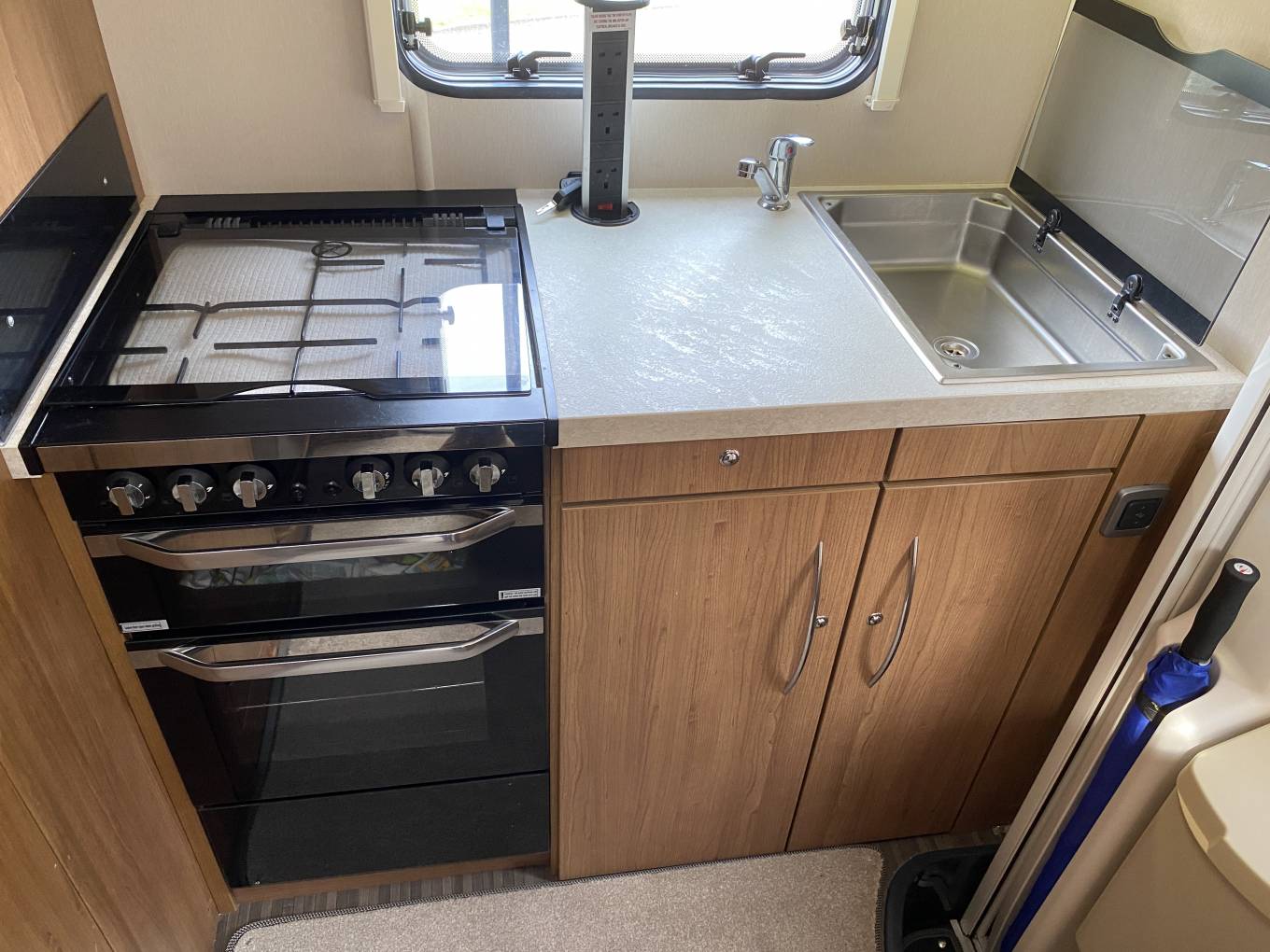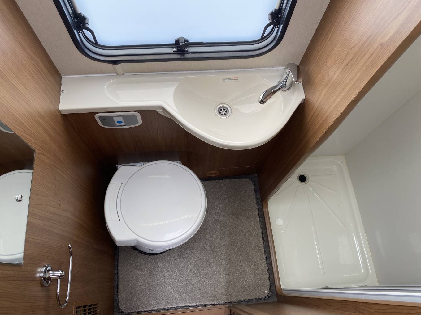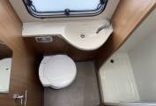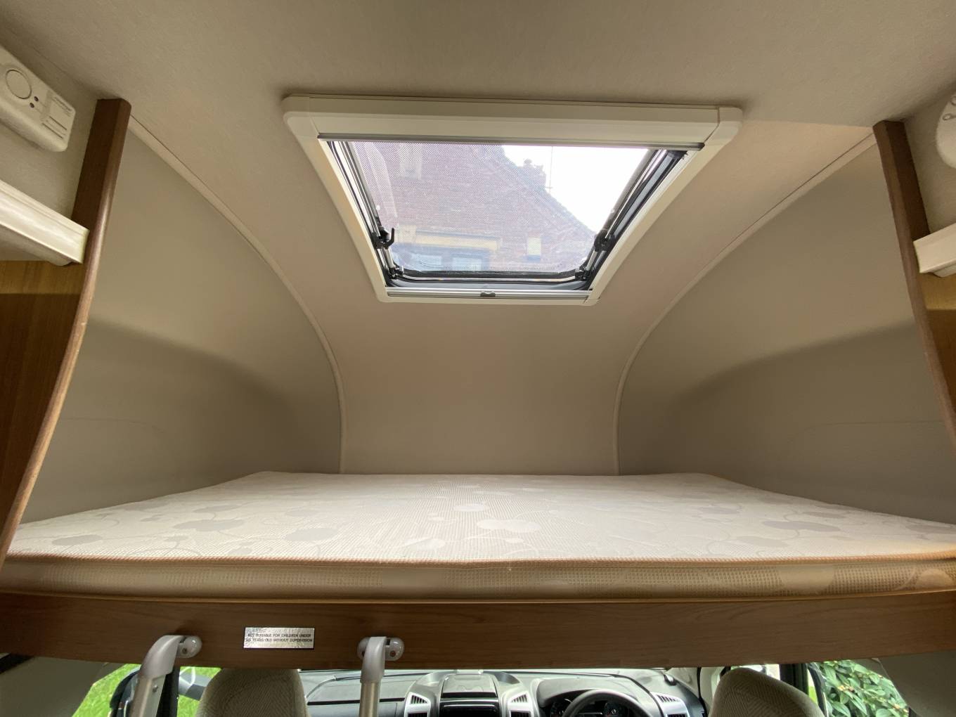 Moving forward into the highly adaptable central seating area, with a full dinette, including two 3-point forward facing passenger seatbelts, opposite is the comfortable three seater sofa, all upholstery is in good condition throughout. The dinette area can also be made up into a double bed. Also there is a generous size overcab double bed, with skylight above, which is easily accessed via a ladder, this bed area doubles up as a useful storage area when not being used and when pushed back allows greater cab headroom. Both cab seats swivel round to face the living area and the driver enjoys, air conditioning, driver and passenger air bags, electric front windows, radio with Bluetooth phone connectivity and reversing camera monitor, electrically adjusted wing mirrors and there is a full set of Remis concertina internal blinds for the cab front windows.