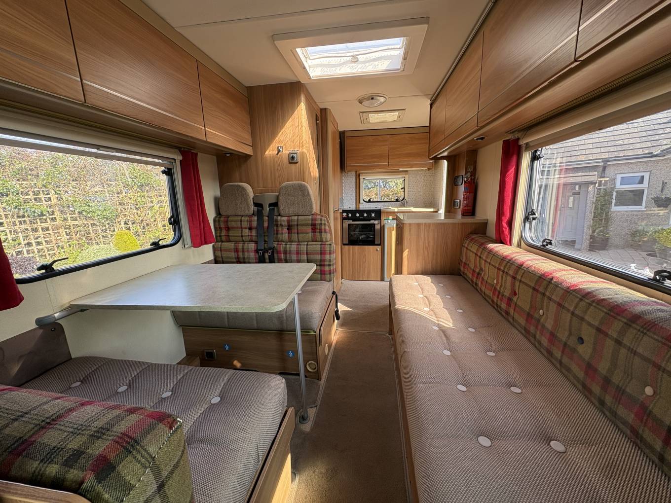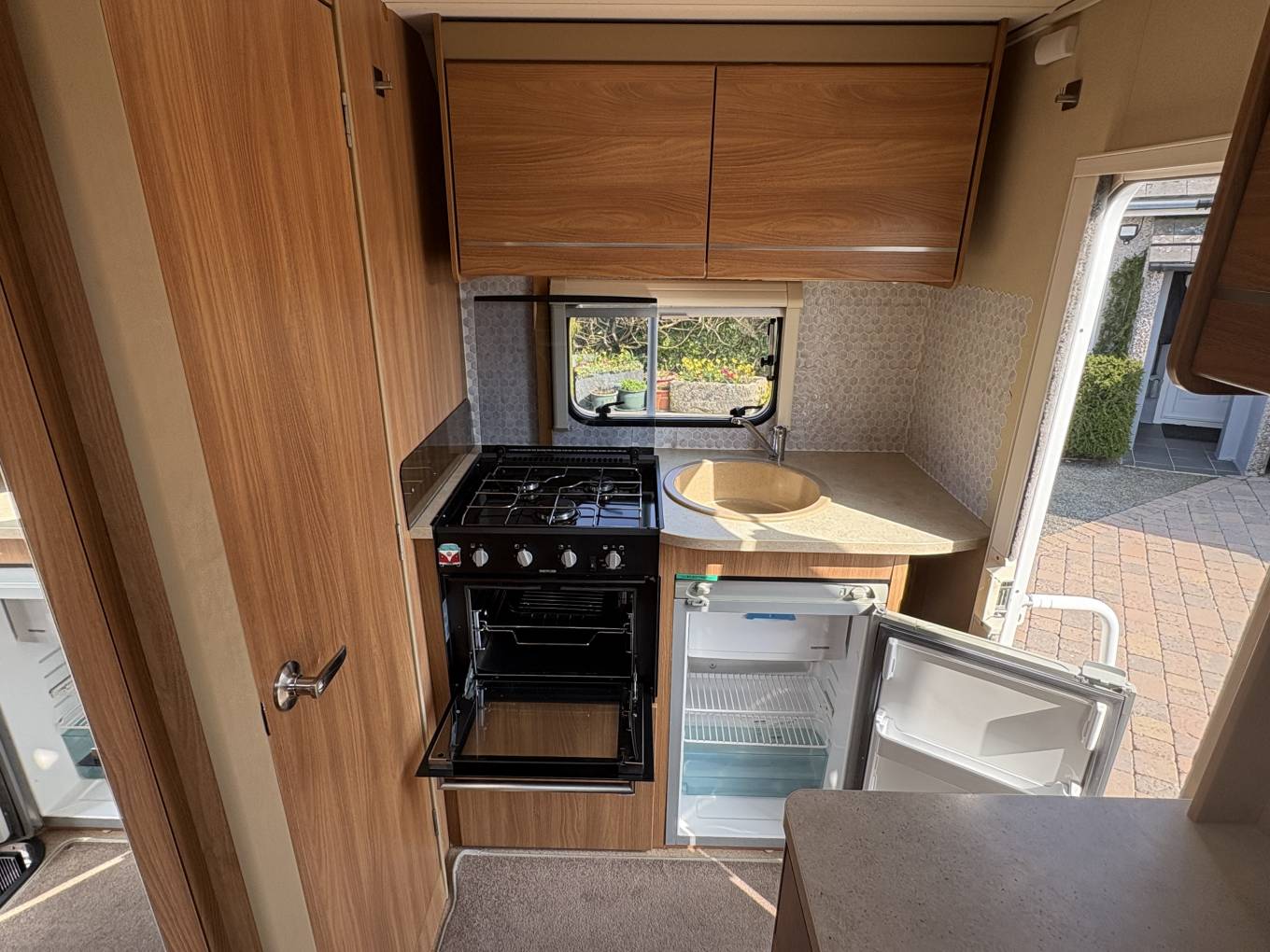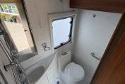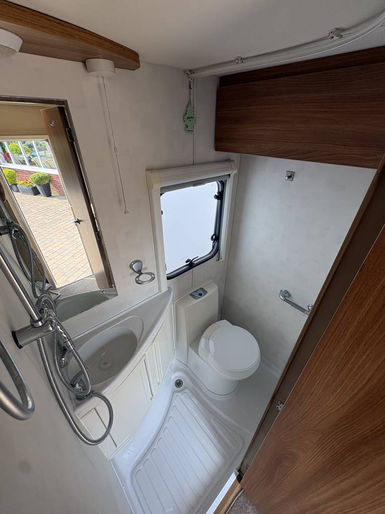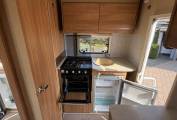 Layout - You have a rear kitchen, with sink unit (hot and cold water) 3-way fridge with freezer compartment, 3 gas hobs and a gas grill & oven. Adjacent to the kitchen is the clean washroom with toilet, sink, vanity mirror and shower.
