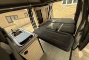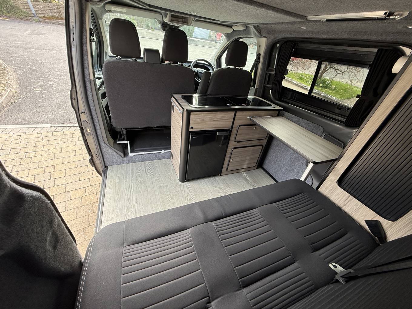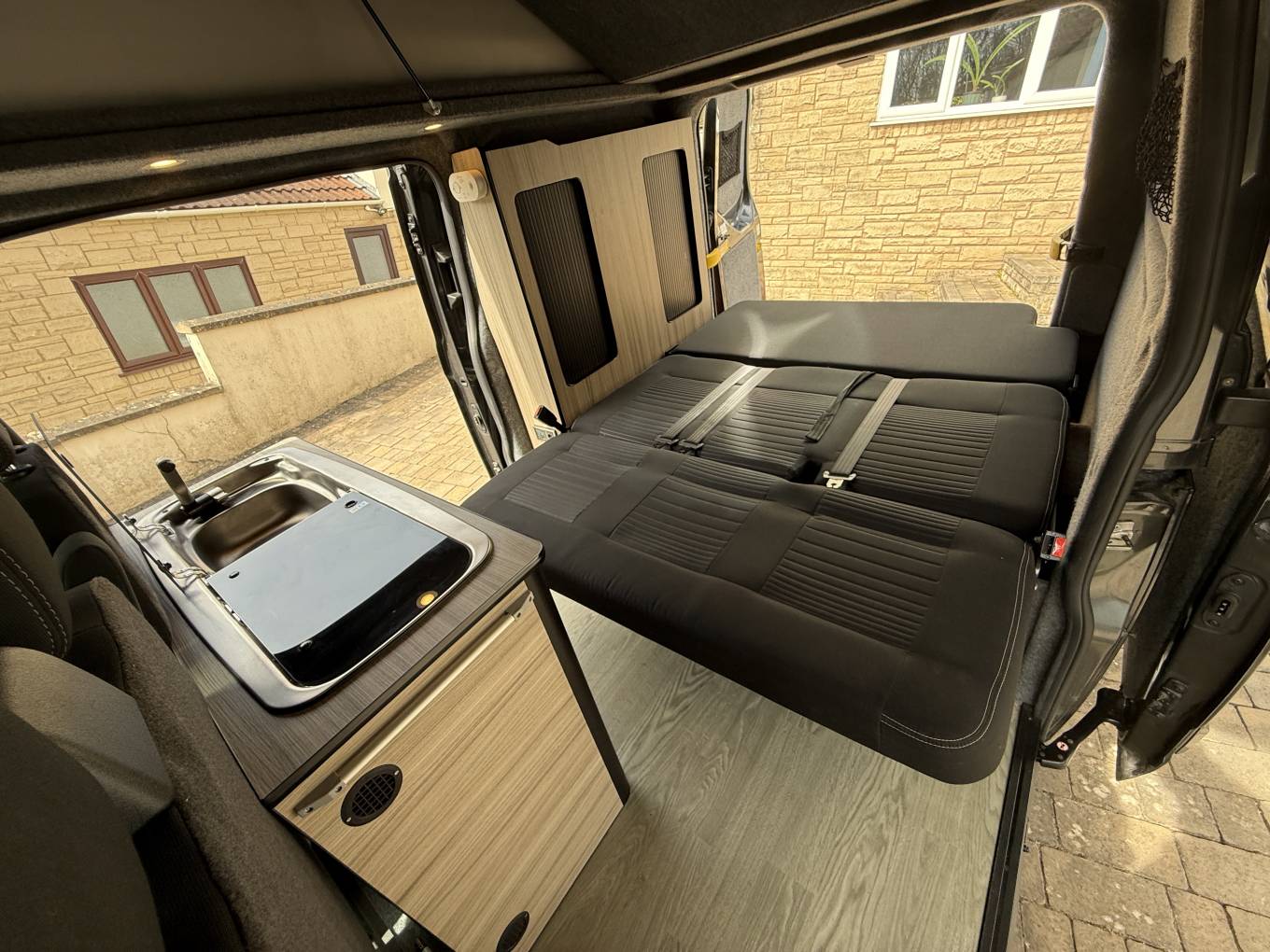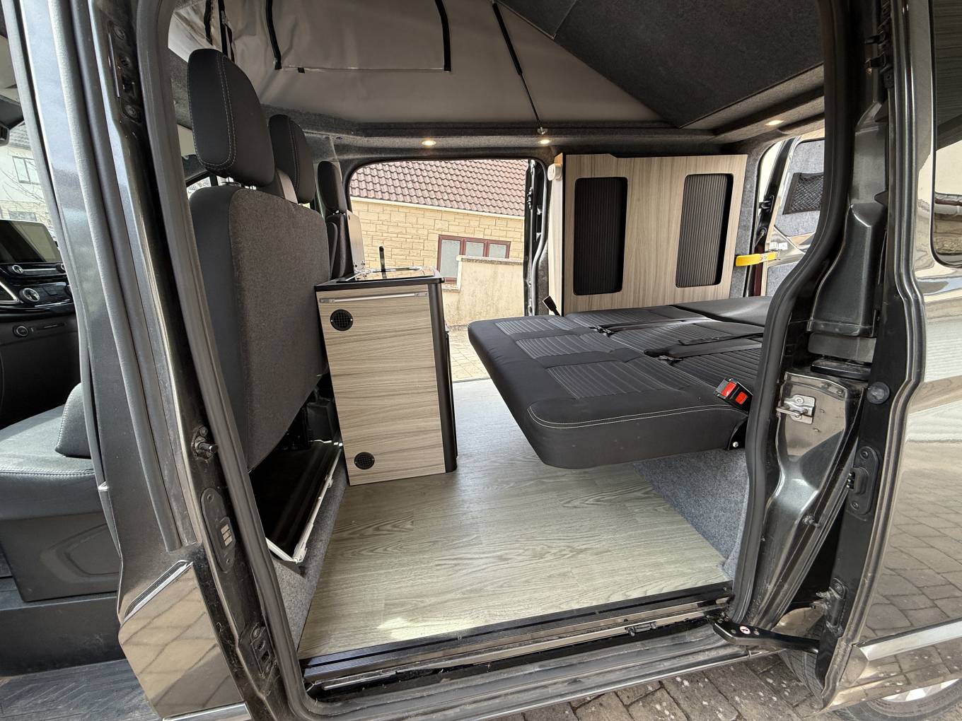 This campervan has 4 berths and 6 belted seats, with a pop up roof providing additional headroom and sleeping accommodation. The cab is fitted with Ford alarm, Ford cab air conditioning, heated front seats and a Ford factory 230V inverter socket. It also has a reversing camera, front and rear parking sensors, wind deflectors fitted to the driver and passenger windows, Ford 12 month assistance and 2 sets of keys.