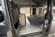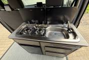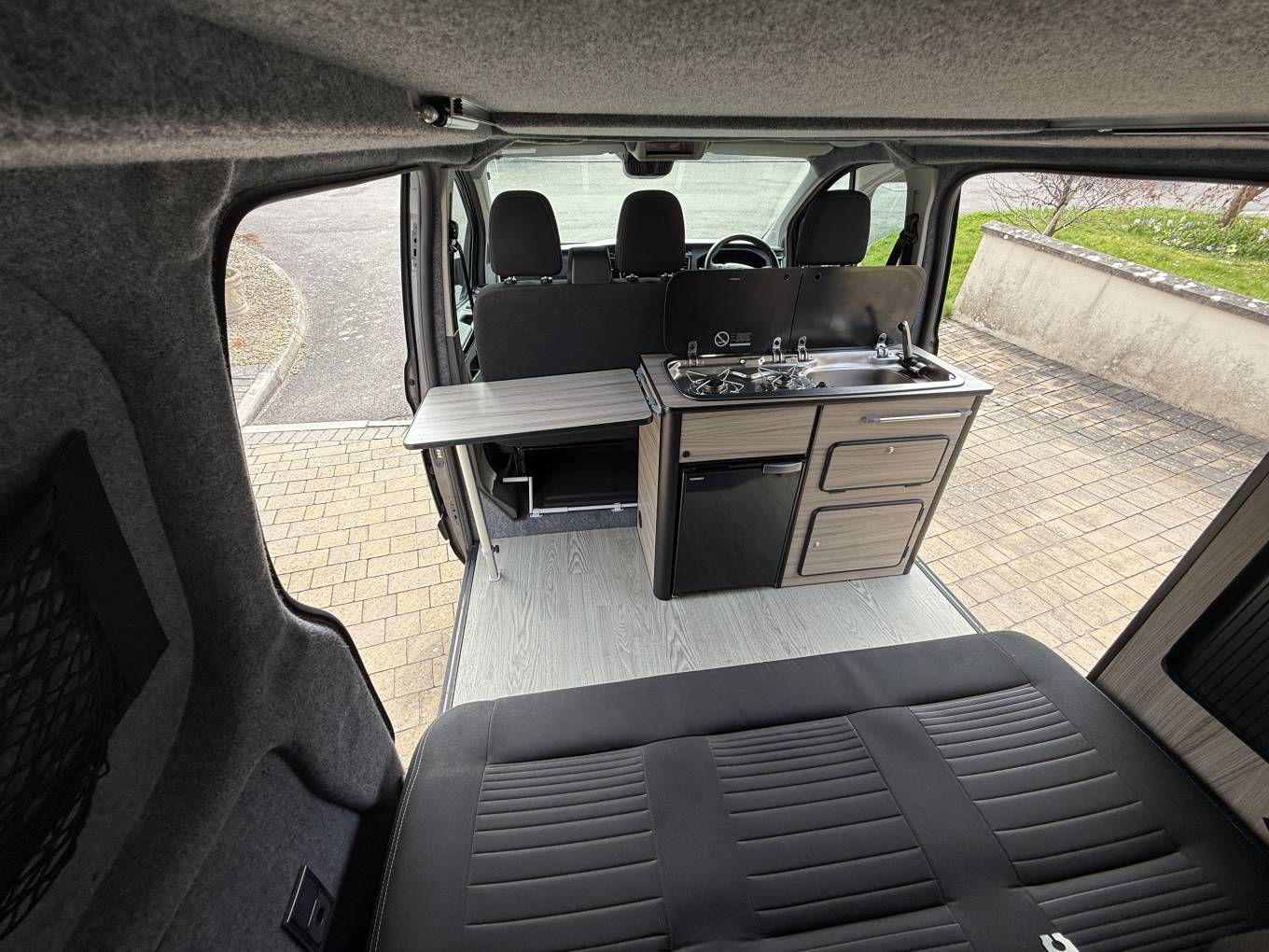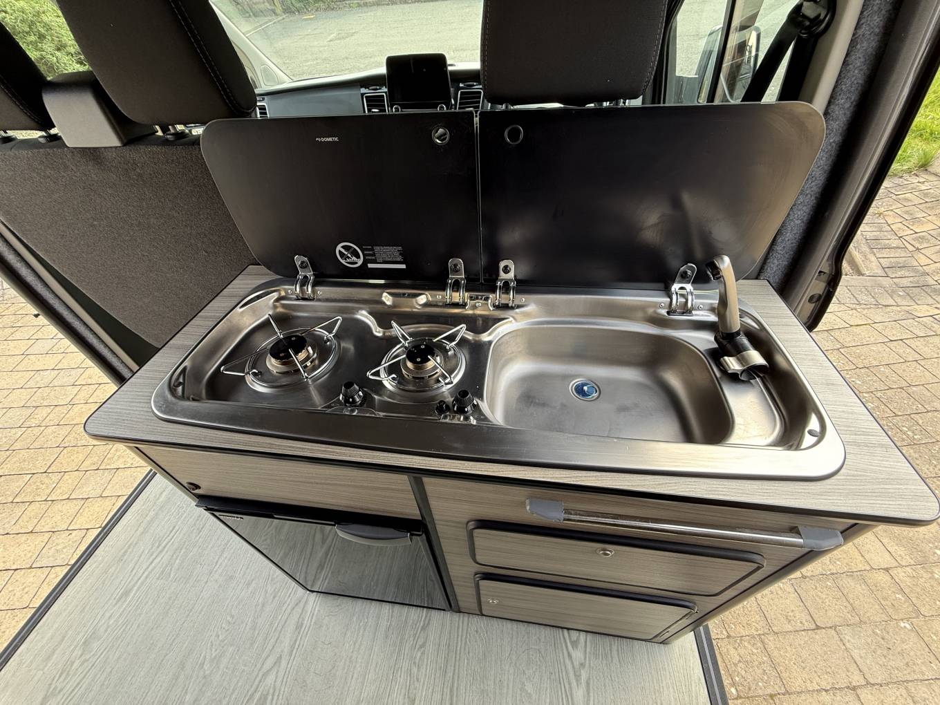 The habitation area is equipped with a 12V fridge, sink, fresh water tank, waste water tank, 2 burner gas hob and leisure battery. A solar panel is fitted, and the vehicle also has a Thule awning canopy. A gas bottle is included in the sale.