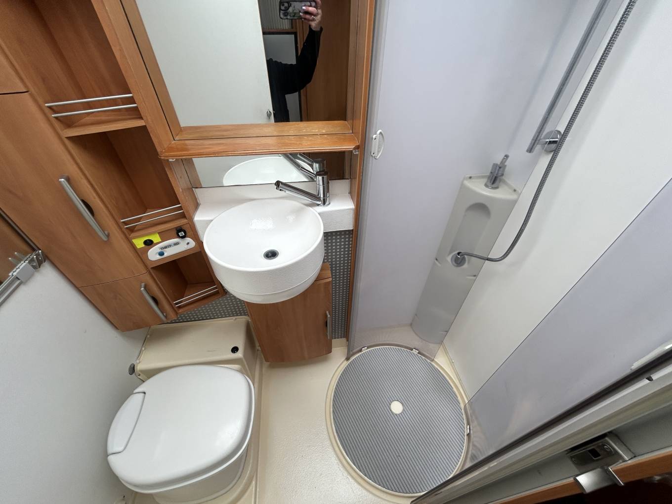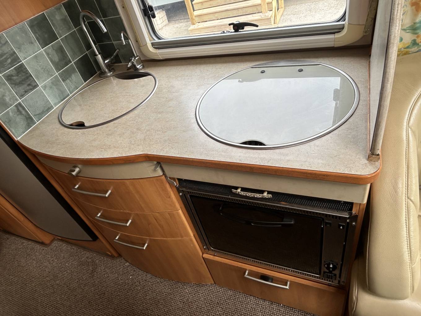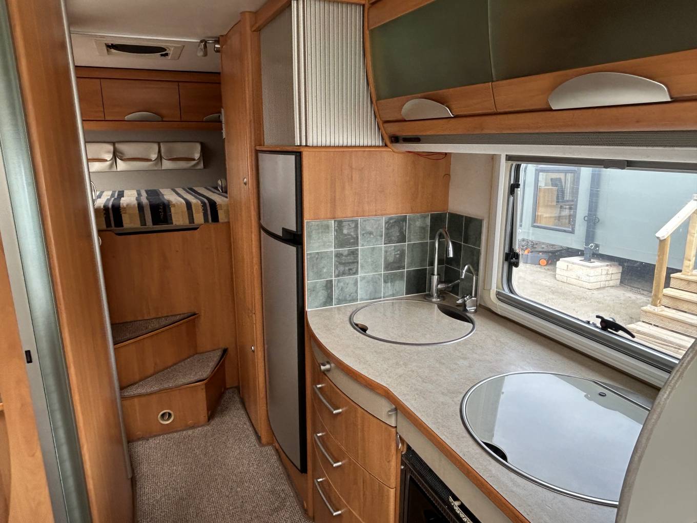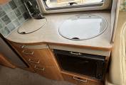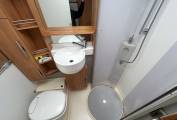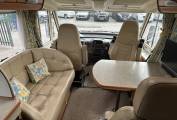 The kitchen is well equipped with a 3-burner gas hob, Smev oven/grill, and a large Dometic fridge/freezer, while the spacious washroom includes a Thetford toilet and full facilities for comfortable touring. For year-round travel, the motorhome is fitted with a Truma heating and hot water system.