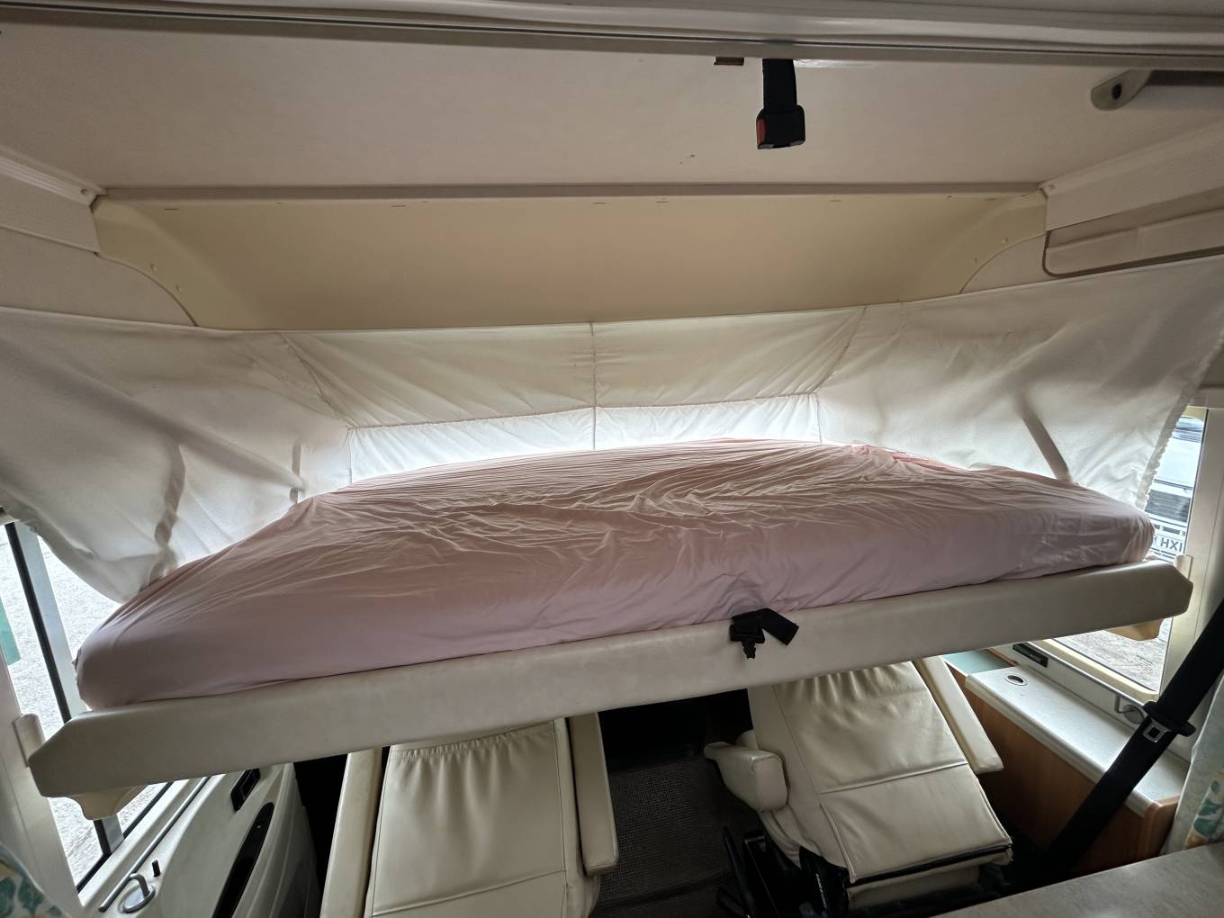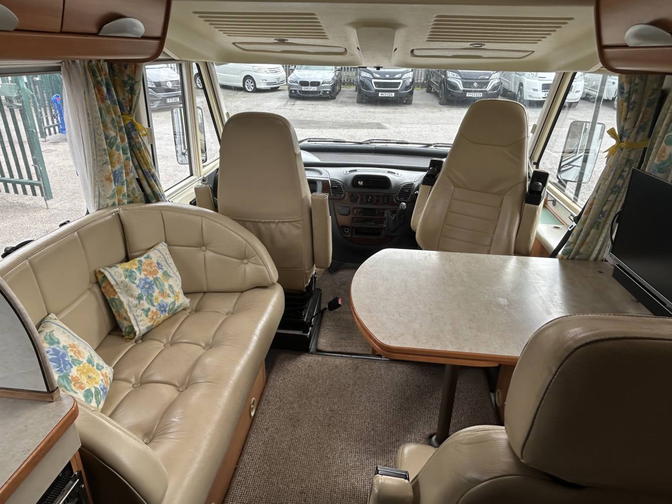 Inside, the layout is spacious and practical, featuring a centre dinette with sofa and additional chair, creating a comfortable lounge area alongside the swivel cab seats. Sleeping arrangements are flexible with a fixed transverse rear bed and a large overcab drop-down bed, allowing the motorhome to comfortably sleep 4 people. The interior is finished with a stylish beige leather upholstery, complemented by blinds and flyscreens throughout for privacy and comfort. For added peace of mind, the motorhome has also benefited from a replacement gearbox, along with a new water pump and drive belt fitted last year.