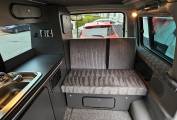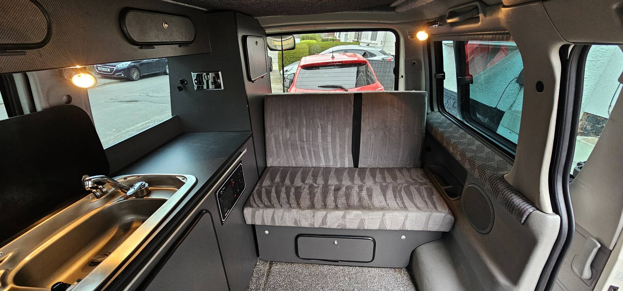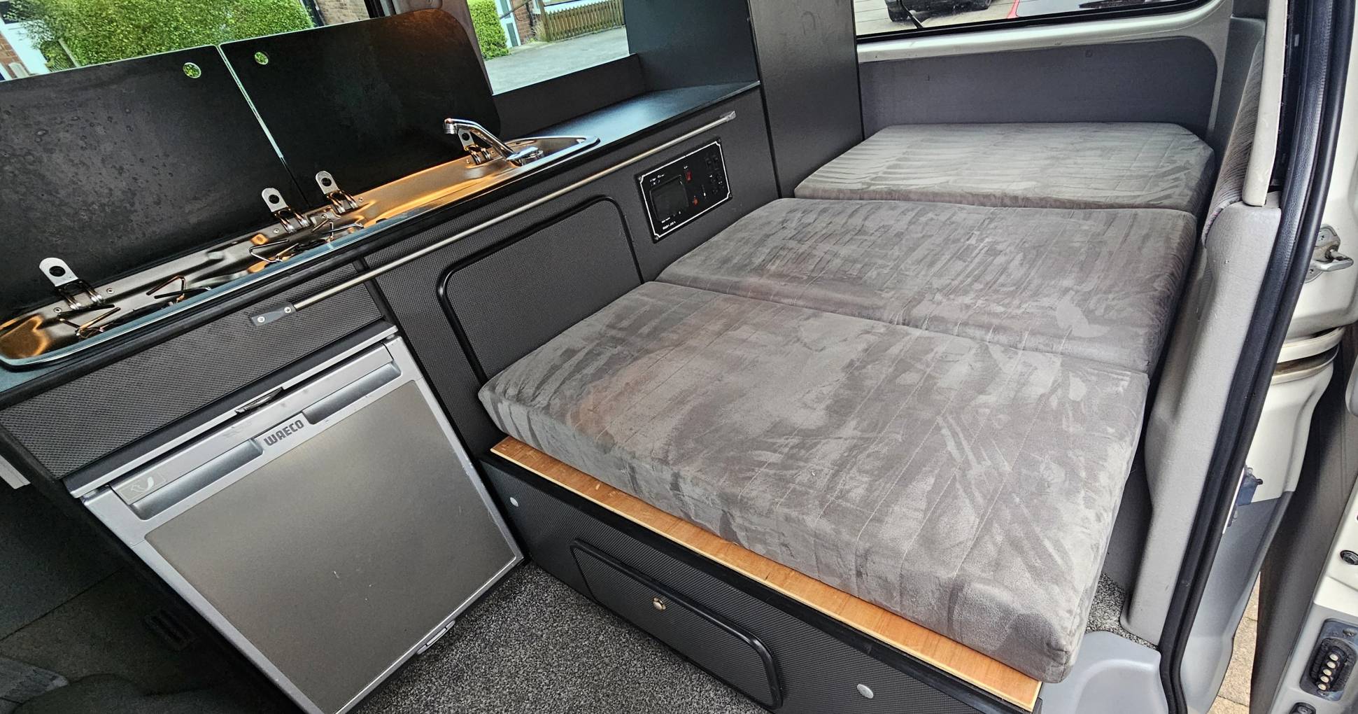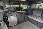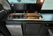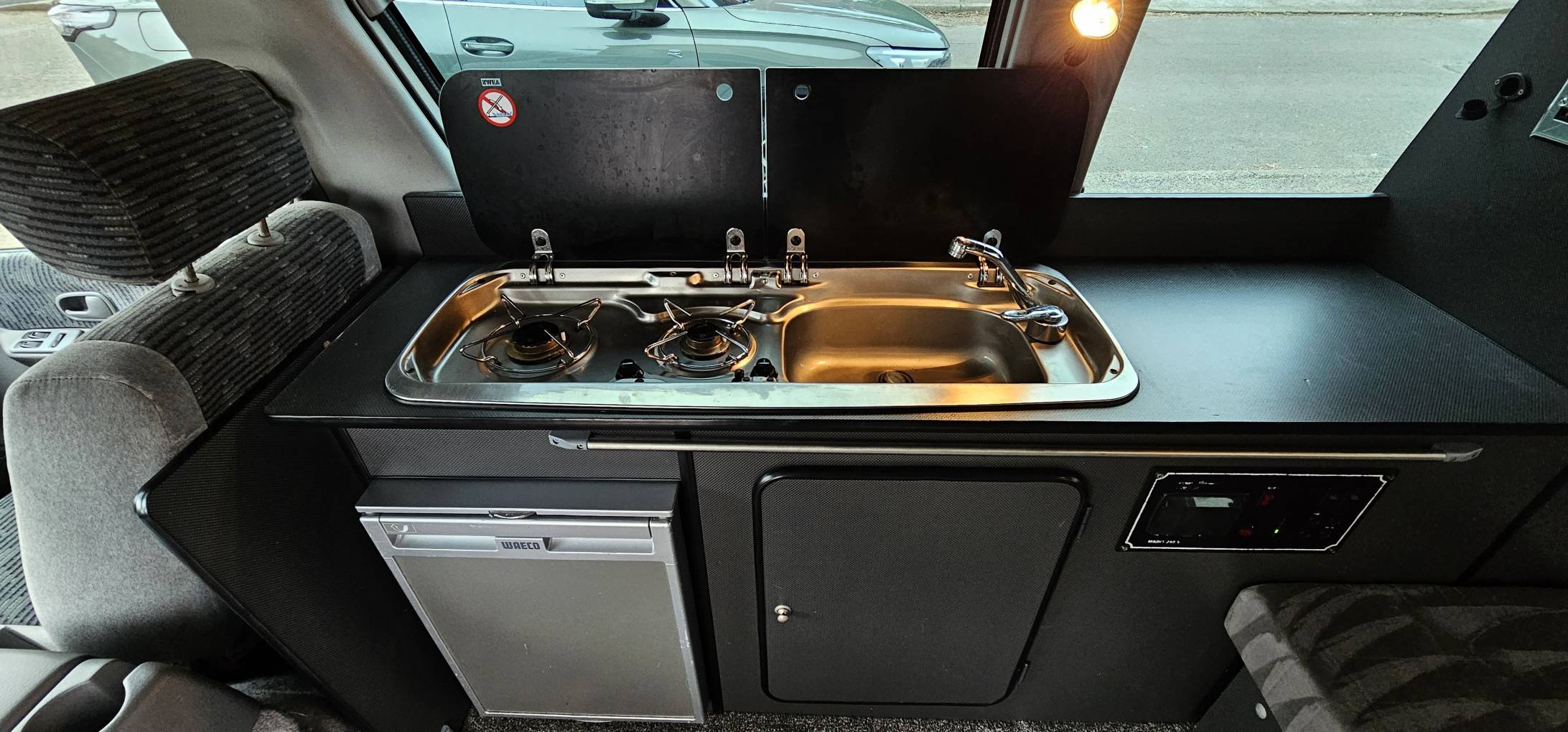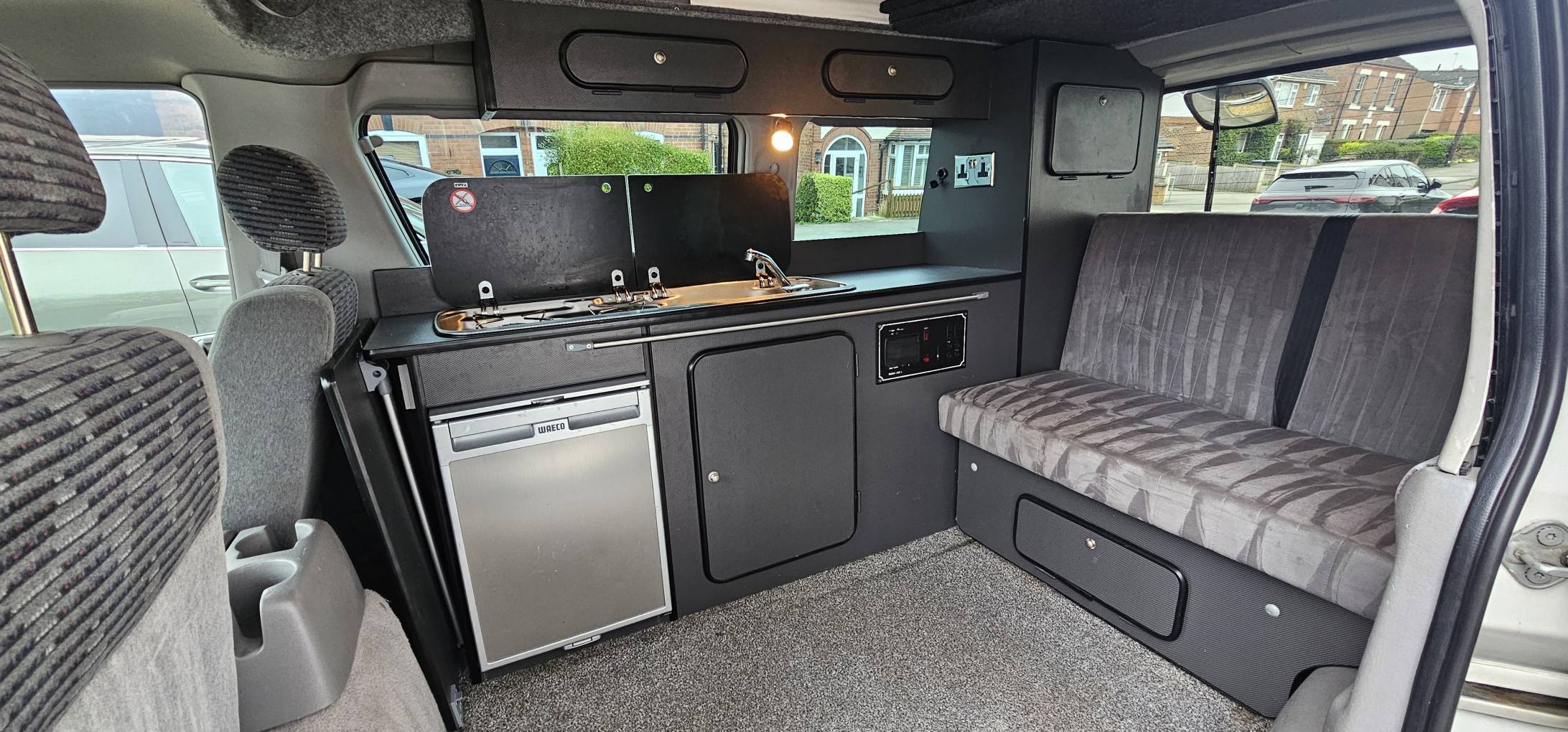 Inside, the van benefits from a side kitchen conversion featuring a double gas hob, sink, fridge and storage cupboards, while the pull-out bed and pop-top roof provide flexible sleeping space for camping trips.