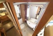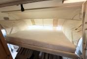 On the near side is a bathroom behind the cab, with a toilet, hand basin and shower, followed by a storage cupboard. Opposite is the habitation door and the kitchen area comprising a hob with three gas burners, a double sink with mixer tap and a fridge with a freezer compartment. At the rear of this motorhome is a large lounge area with two opposing bench seats which can be used as two singles or converted into a large double bed. Above the cab is a pull down double bed to complete the 4 berths.