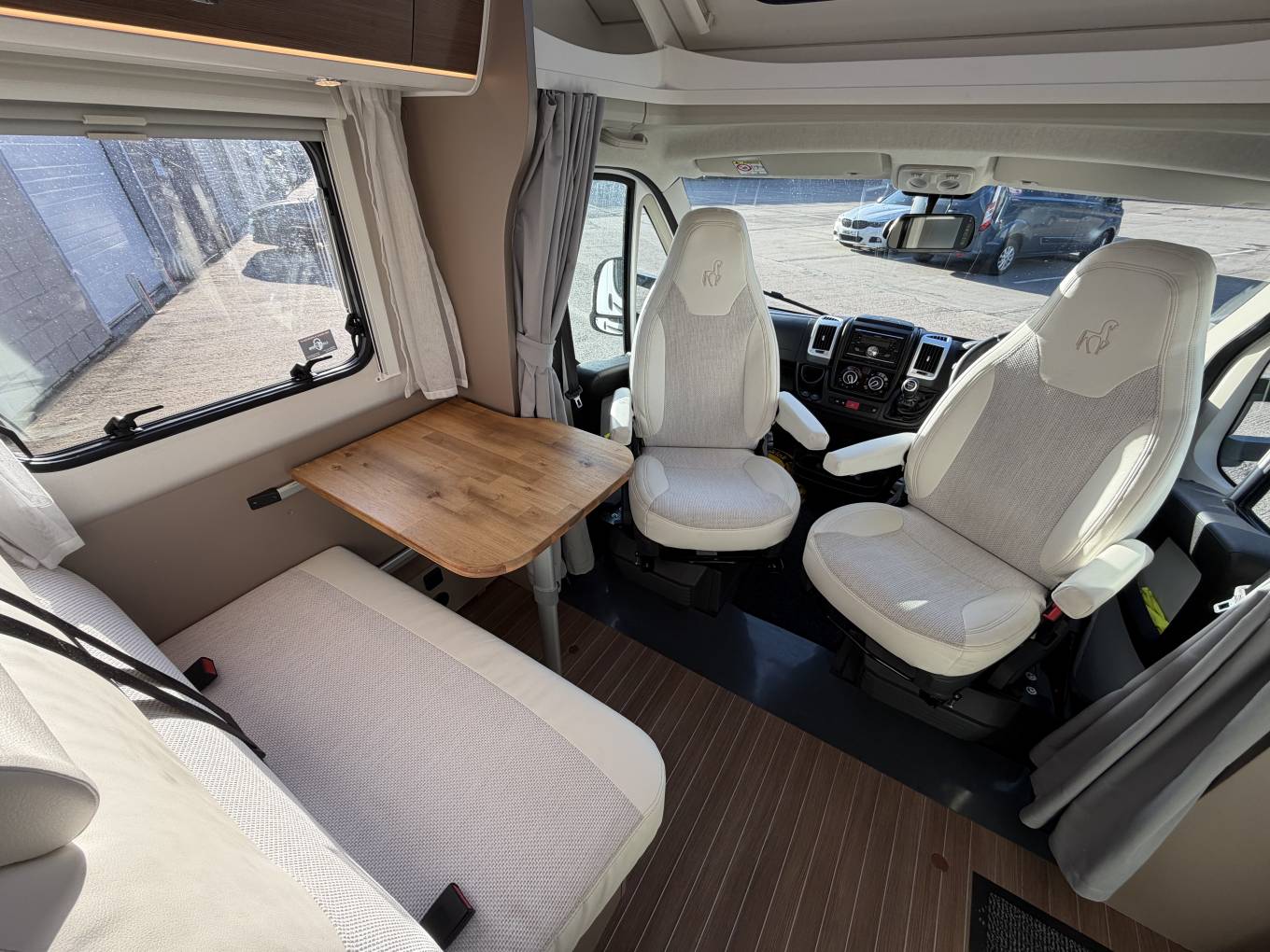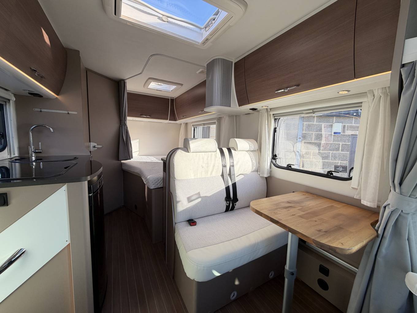 The Etrusco T5900 FB features a highly desirable rear fixed bed and rear washroom layout, providing both comfort and privacy. The centre dinette creates a welcoming and սոցիable living area, complemented by swivel cab seats to maximise space when parked. This area can also be converted into an additional sleeping space, allowing the vehicle to comfortably accommodate up to 3 berths. The thoughtful design ensures a practical flow throughout the motorhome, with ample storage and a bright, airy feel.