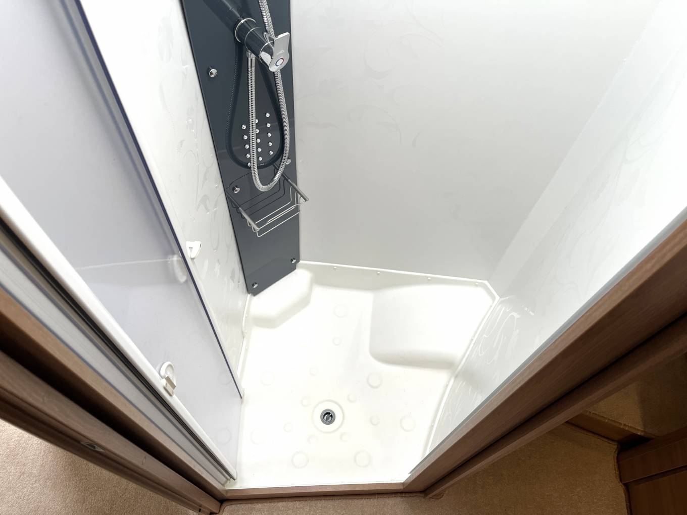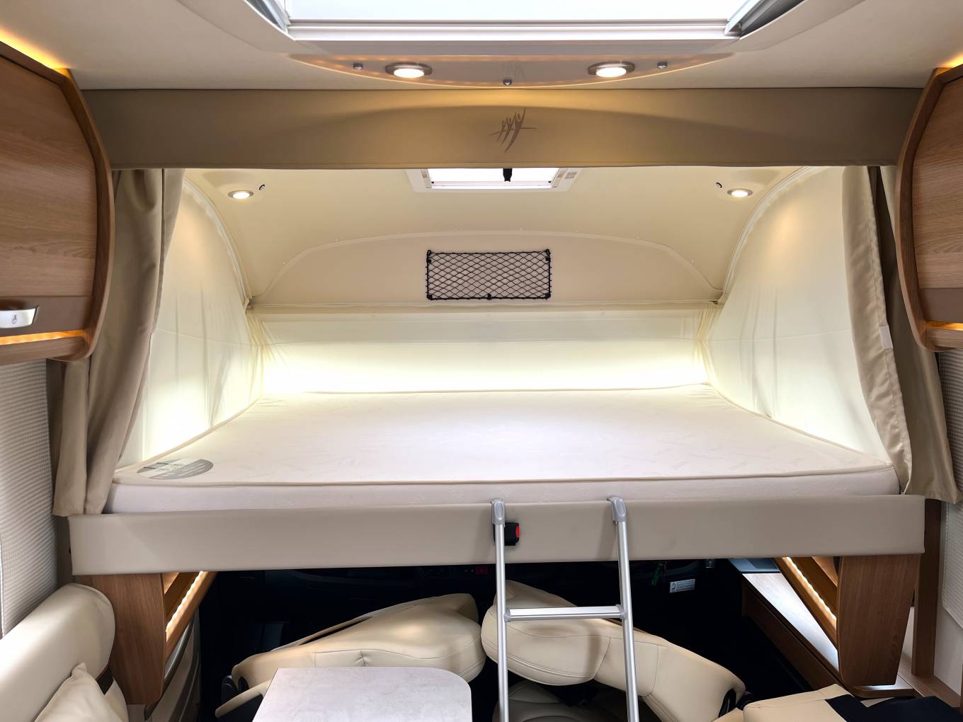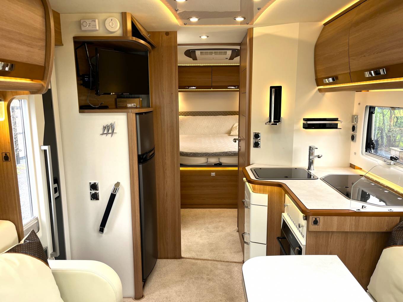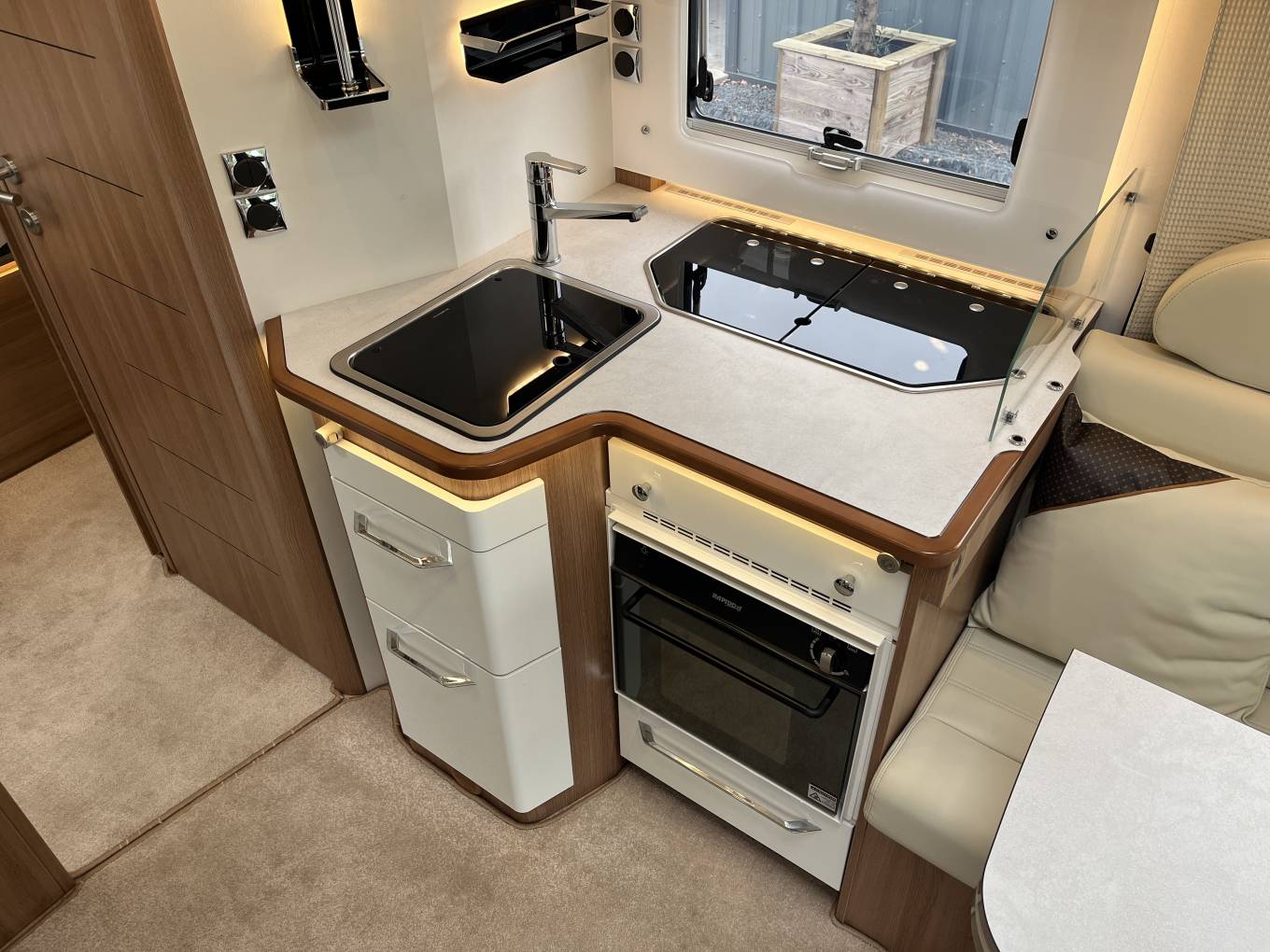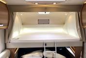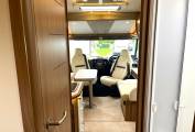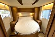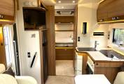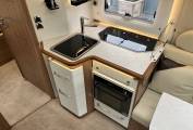 The Rapido features: A large bright and open lounge area with seating for six around a large adjustable dining table. Fully equipped central kitchen with, oven, grill, hob, fridge freezer, sink with mixer tap, good storage space, high gloss doors and soft close drawers. Large easily accessed double drop-down cab bed and seatbelts for four people. Rear bedroom/en-suite area with a luxury height adjustable fixed island bed, twin wardrobes, twin bedside tables and overhead lockers. Separate washroom and shower cubicle area with a privacy door to the living area and a separate privacy door to the bedroom.