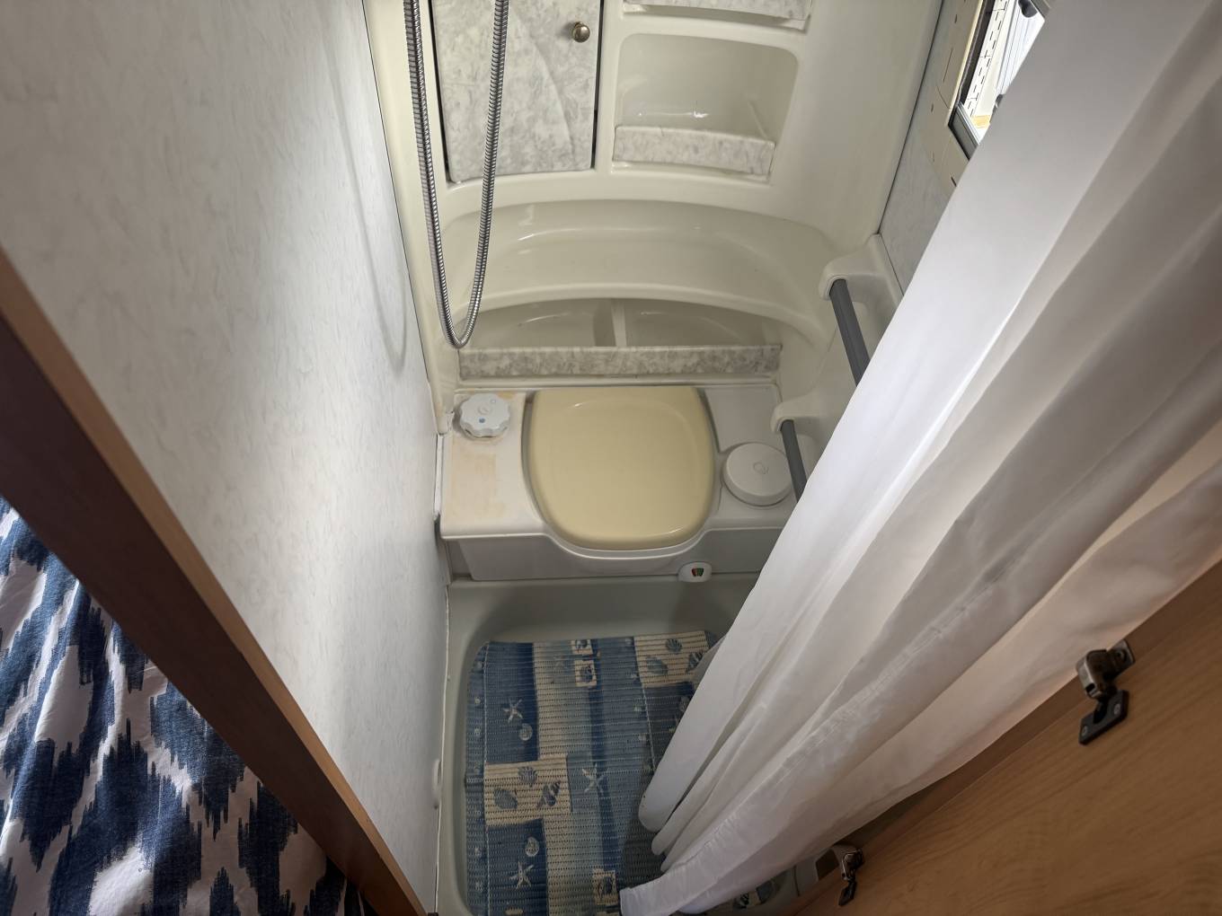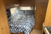 Inside, you'll find a welcoming and well thought out layout, featuring a fixed rear French bed, a spacious washroom with toilet, sink and separate shower area, and a front lounge with bench seats that convert into a second double bed. The living space is light and airy, thanks to large windows and a rooflight.