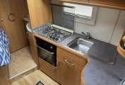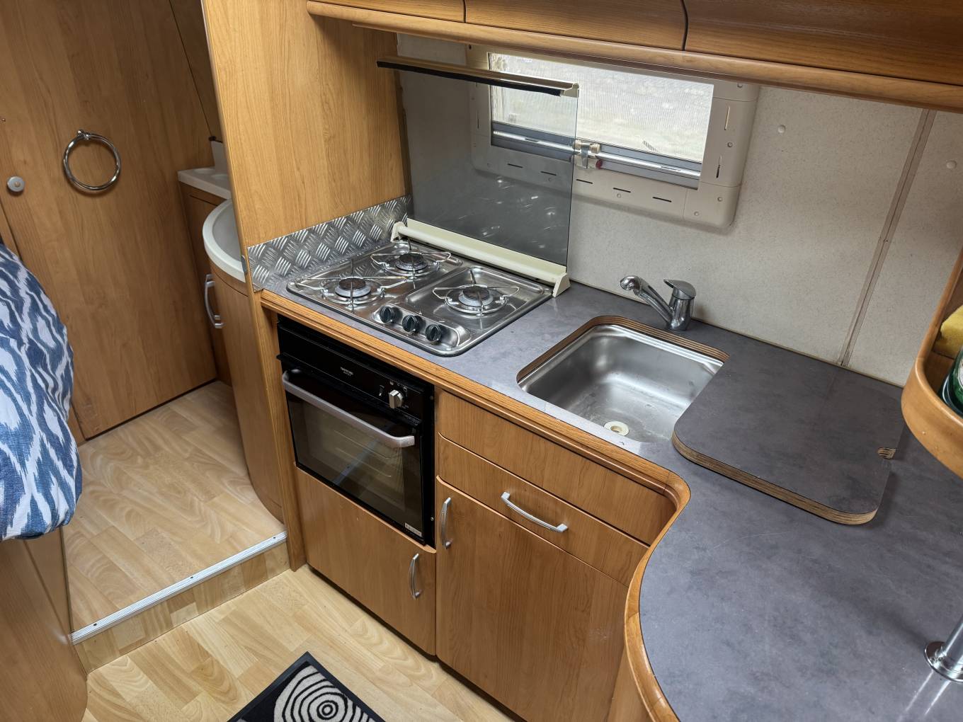 The side kitchen is fully equipped with a gas oven and grill, 3 burner hob, fridge with freezer compartment, and ample worktop and cupboard space – everything you need for cooking on the go.