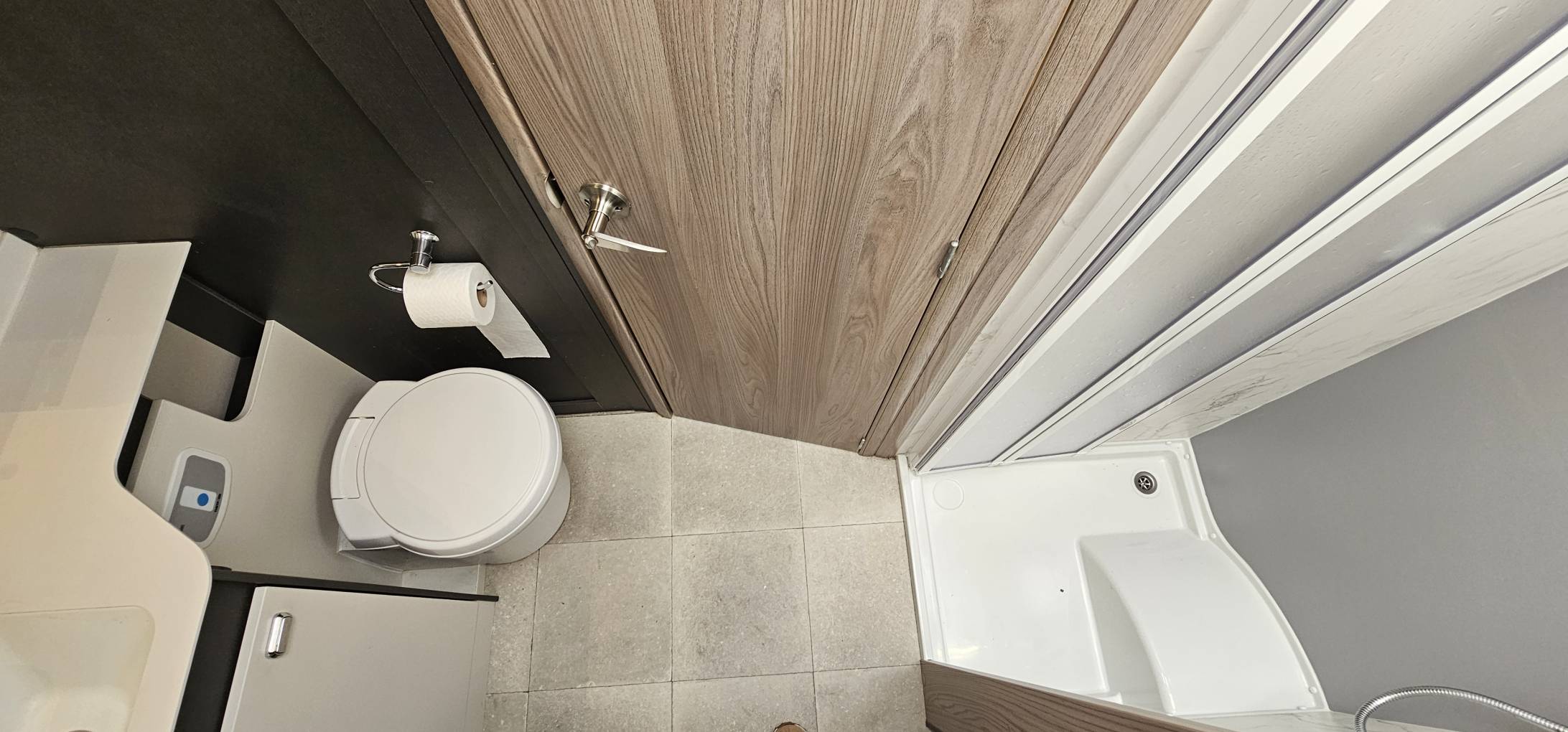 The bathroom features a superb Ecocamel Jetstorm power shower that uses less water. On the other side of the motorhome is a Thetford cassette toilet, a wash basin with a mixer tap, a large mirror to help make sure you look gorgeous for the day ahead and 2 bathroom storage cupboards. There are sliding doors between the bedroom and also the lounge so the bathroom can de divided off.